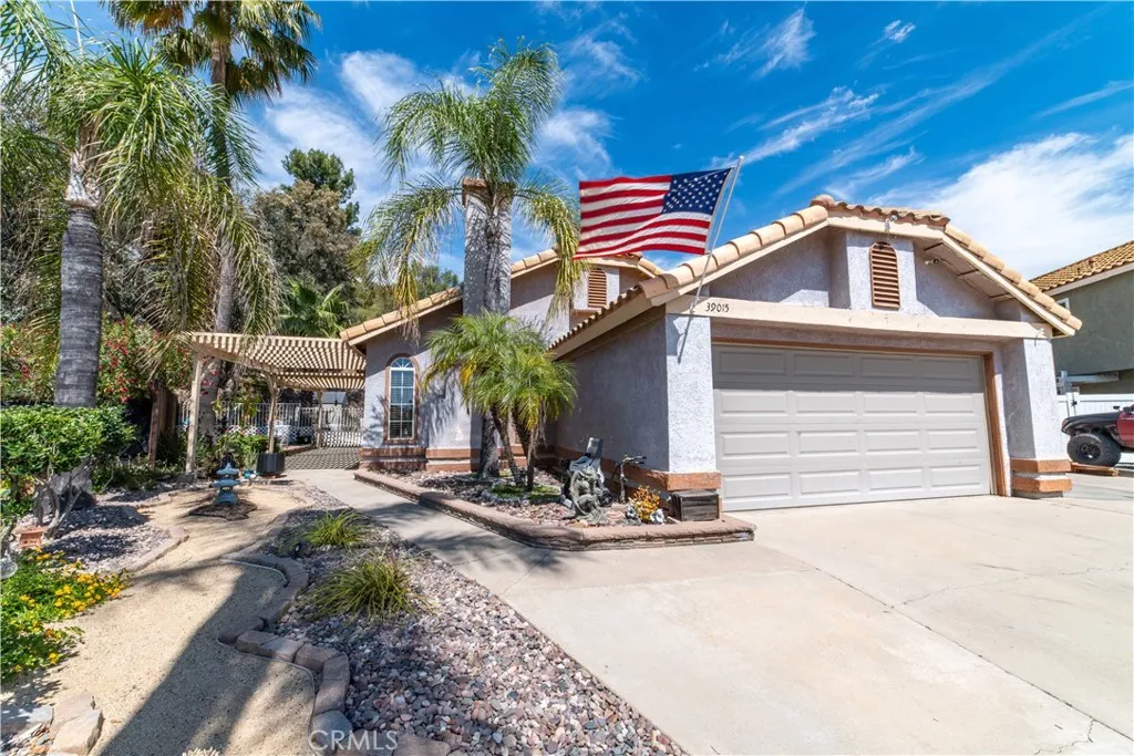 Sprawling view of Temecula Valley and Palomar Mountains! Great Family Home on over 1/4 acre (.31) on a cul-de-sac! Features garden, aboveground pool, playset w/slide & lookout, firepit, toy/bike corral, courtyard, and RV/boat parking. Get cookin’ in the open kitchen, all stainless-steel appliances,5 burner range, granite countertops, stone backsplash, large wood pantry cabinets, bar top and terracotta tile continue into large family room with custom built-in shelving, desk and French doors that lead to the covered patio and terraced backyard. Backyard features string lighting, concrete retaining wall, long stairway to hilltop plateau rising 20 ft in elevation, above ground pool with custom deck built into the hillside, garden with irrigation, shade trees, workshop, BBQ island, concrete and pavers throughout with stone path to hillside plateau and pool. Back inside with floating light brown hardwood floors and two-tone walls throughout the living and dining rooms with a gas fireplace. All three bedrooms were updated with engineered espresso hardwood flooring and fresh paint. The master bedroom has vaulted ceiling with shelving, large his and hers sliding mirror closet doors, and sliding door to patio. Ensuite with vaulted ceiling renovated with paint, large format tile, and resurfaced his/hers cultured marble countertop and large 60x42 soaker tub/shower, two large his and hers mirrors. Second bedroom two separate closets with built-in desk and shelving. Third bedroom new custom bifold Barn closets doors with shelving and shelving above closets. The second bathroom has tiled flooring and a custom tiled shower with tub, and two medicine cabinets. The laundry room has electric and gas hookups and leads to the two-car garage. The garage has an insulated panel garage door, high-capacity outlets and 6 large storage cabinets, side door, and access to a garage attic space for more storage. The front yard features custom landscaping, courtyard, and plenty of parking. Space to add In-law suite, fitness/activity room or other and no one building behind you. The garden boasts two blueberry bushes, green grapevine, chives, two tomato plants, and sweet & red potatoes plants.