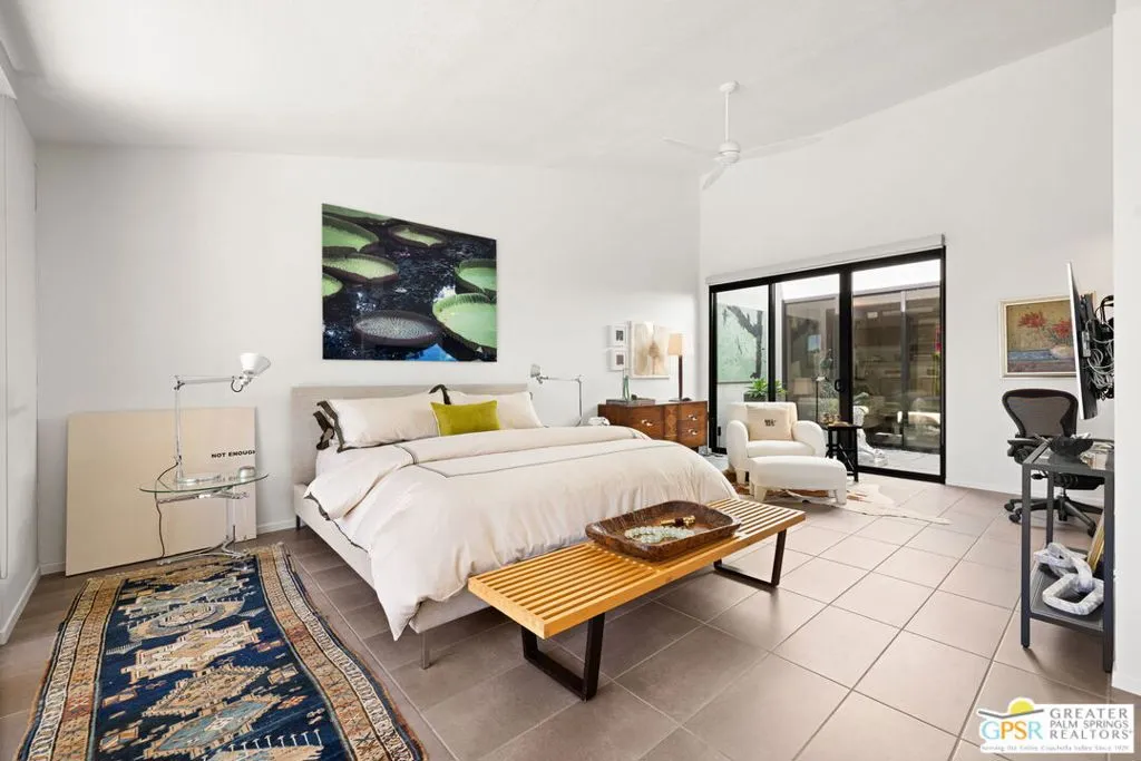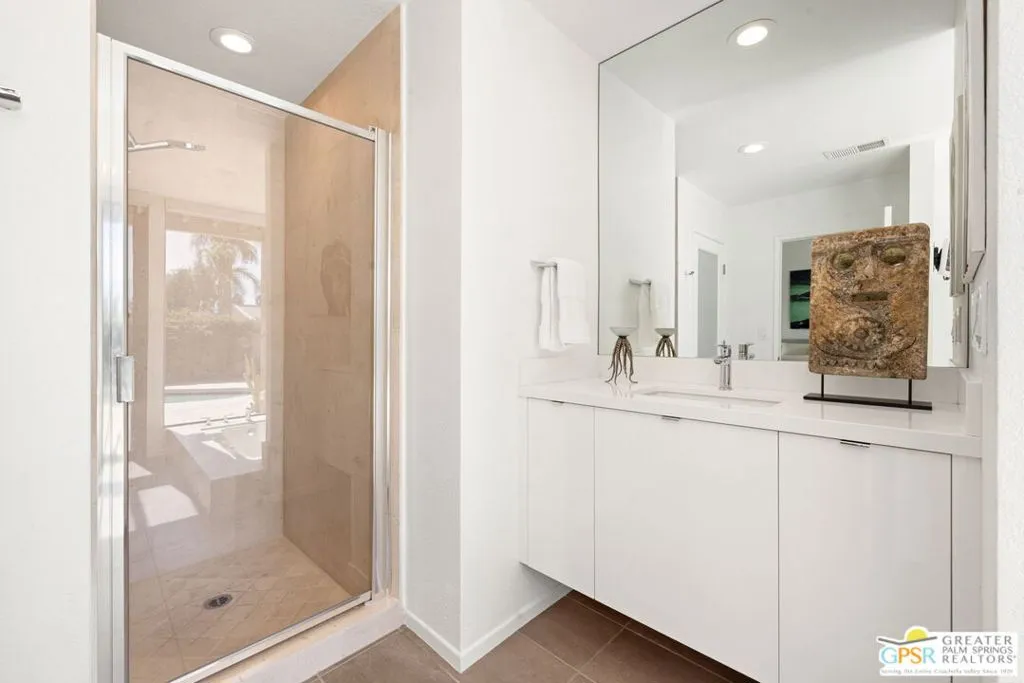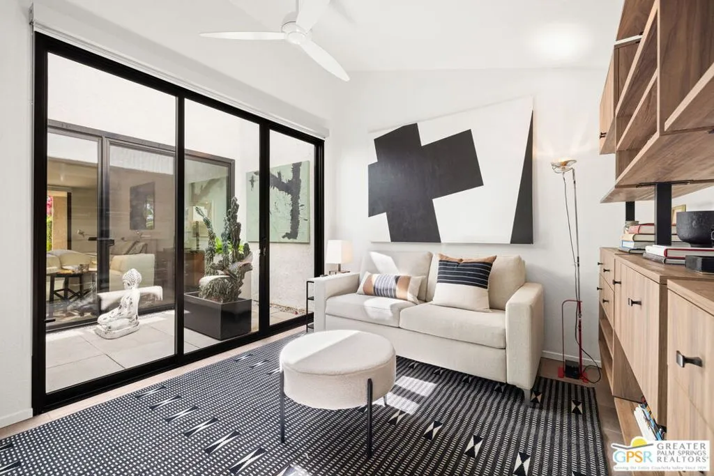 RARE to market. DESIGNER done. BIG views. The San Jacinto Mountains take center stage poolside at this reimagined residence within Sundance Resort, a low density collection of just 60 homes where every residence enjoys its own private pool and spa. Short Term Rental friendly on Fee land (you own it). Originally developed in the early 1980s by Clint Murchison Jr. as a private weekend retreat for players and their families, the setting today remains quietly special with expansive greenbelts, tennis, clubhouse, fitness spaces, and dog friendly walking paths, all thoughtfully arranged across two distinct enclaves for added privacy. This residence has been taken to the next level with a comprehensive renovation by its current owner, followed by a 2025 landscape refresh with all new lighting and irrigation across both front and rear patios. Inside, the living room makes an immediate impression with vaulted ceilings and a fireplace, while also being dialed in for entertaining with a built in bar, beverage cooler, and bar sink, all opening beautifully to the outdoors. The kitchen features custom European cabinetry finished in white melamine along with a premium appliance suite including KitchenAid Chef Series appliances and a Bosch dishwasher, while Hansgrohe fixtures bring a refined, modern edge throughout. A breakfast bar connects seamlessly with both indoor and outdoor dining areas, all positioned just off the kitchen for easy everyday living and entertaining. The design story continues into the baths with the same elevated cabinetry and finishes. The primary suite opens to the private saltwater pool with mountain views and features a double vanity and custom built ins. There is also a nicely integrated office alcove, adding flexibility for work or creative space. The guest bedroom is currently enjoyed as a den with its adjacent full bath. Fleetwood glass and slider doors enhance the seamless indoor outdoor flow and the atrium is a definite focal point, creating that desert lifestyle this home delivers so well. A private backyard gate opens directly to one of the community's expansive greenbelts, making outdoor living and dog walks especially enjoyable. HOA dues cover earthquake insurance, roofing, exterior maintenance and paint, water, waste, and landscaping, making for an easy lock and leave option in one of the desert's more unique communities.