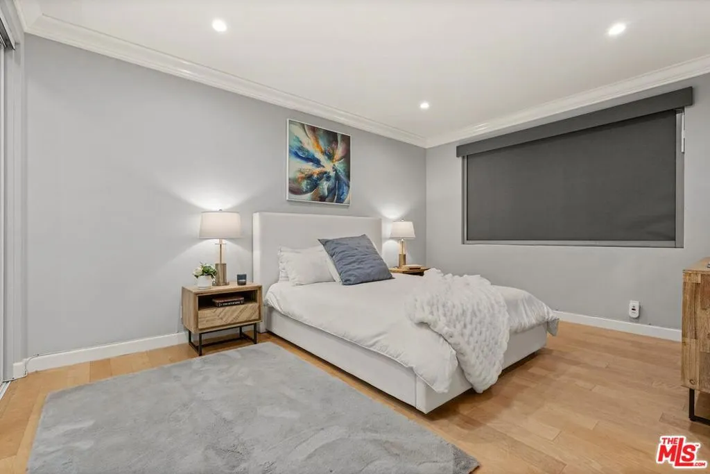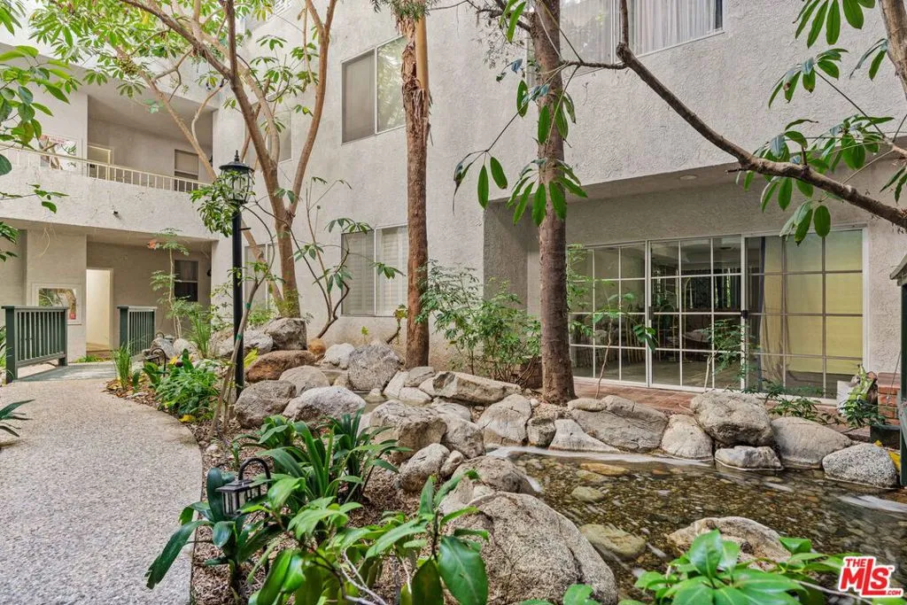 Exquisite and spacious updated one bedroom with west facing windows framing lush greenery views. The living room opens seamlessly to a sunny private patio, perfect for afternoon coffee or evening relaxation. A marble fireplace, built-in bar, recessed lighting and lovely dining area add warmth and sophistication. Gorgeous kitchen with stainless steel appliances, brand-new refrigerator, white quartz countertops, and abundant cabinet storage. The serene master bedroom includes generous closet space, updated shower/ tub and separate vanity area. Throughout the home, beautiful wood floors and crown molding create a timeless, cohesive aesthetic. This quiet home provides private laundry - including stacked washer/dryer; central A/C - new HVAC system installed in 2025; and two parking spaces. Extra storage and guest parking spaces available in the gated security garage. This exceptional community offers a charming landscaped courtyard with running stream, outdoor pool, spa, and gym. Located on a quiet street in the most desirable Westwood neighborhood, this home is just moments away from shopping, restaurants, parks and the UCLA campus.