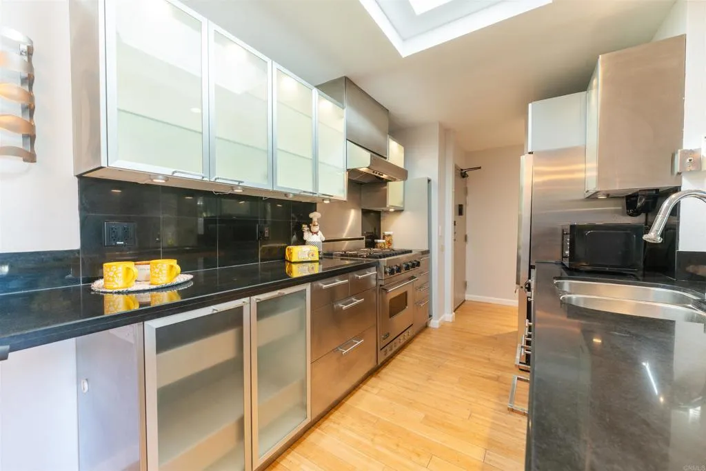 Top-floor contemporary condo in the heart of Mission Valley offering style, comfort, and valley views. The 1-bedroom, 1-bath residence spans approximately 700 square feet and features vaulted ceilings in both the living room and bedroom—an exclusive benefit of its premier top-floor location in a three-story building. Beautifully upgraded just a few years ago, the home showcases bamboo flooring throughout, a stunning custom-designed walk-in shower, and a remodeled kitchen complete with a Viking stove. Natural light fills the space through multiple skylights enhancing the open and airy feel. The living room centers around a cozy gas fireplace with smart home controls for lighting and fireplace operation, and opens to a private deck/balcony—perfect for enjoying Mission Valley views and evening city lights. Additional highlights include central heating and air conditioning, an EV charger at the assigned covered parking space. The building offers elevator access for added convenience. Residents enjoy resort-style amenities including a swimming pool, spa, tennis and pickleball courts, basketball court, fitness center, and a recreation room with two pool tables. Ideally situated in the Fashion Valley area with quick access to Interstate 5 and Interstate 8, the central location offers close proximity to shopping, dining, and everything San Diego has to offer. Experience elevated Mission Valley living in this thoughtfully upgraded, move-in ready home.