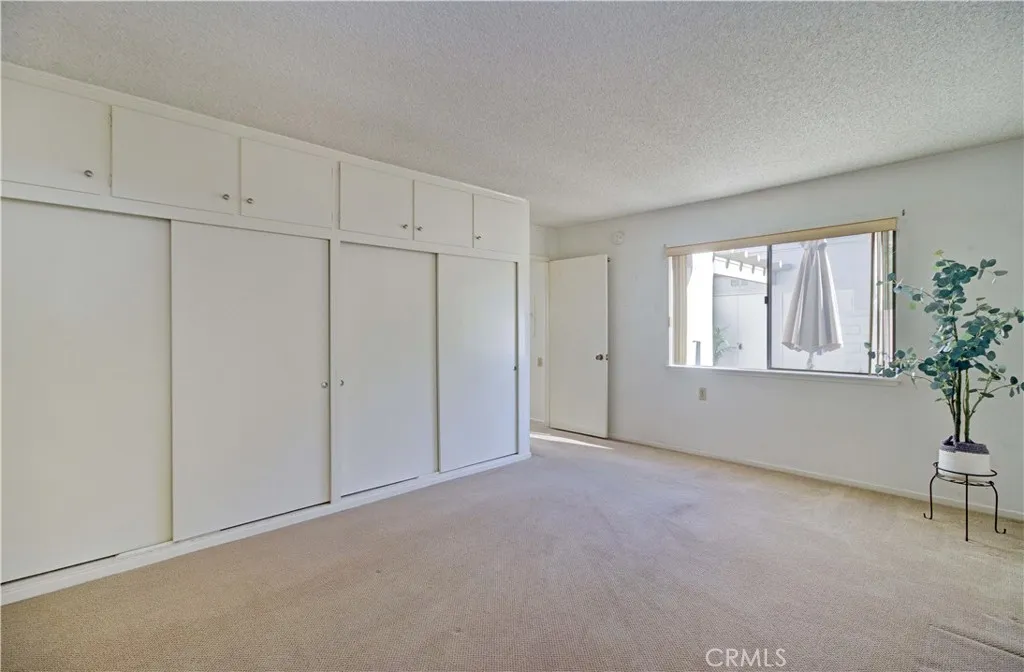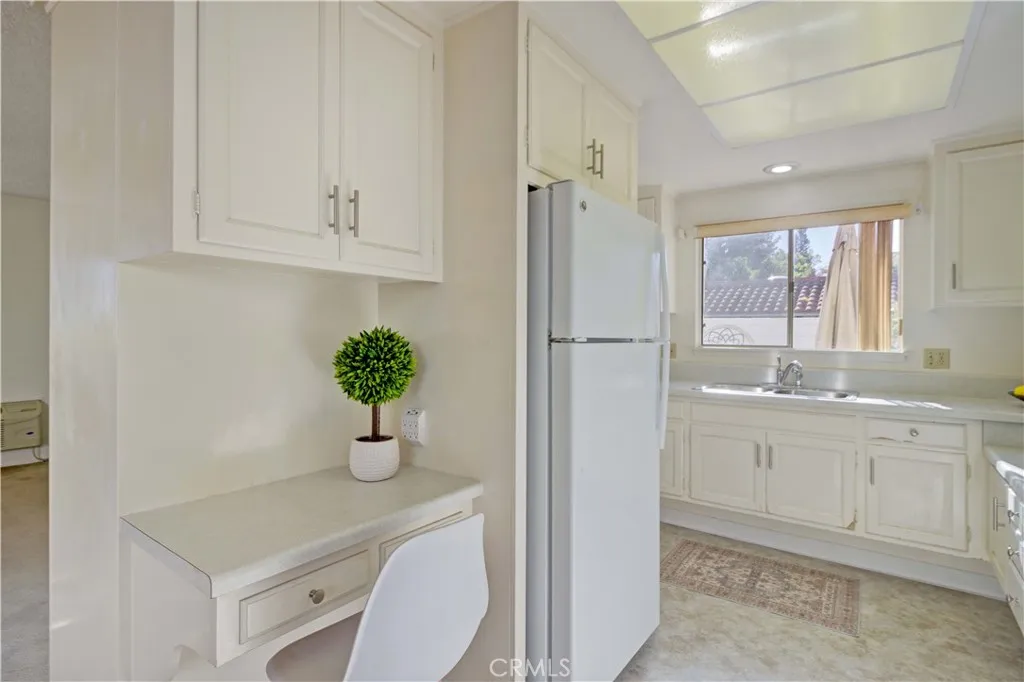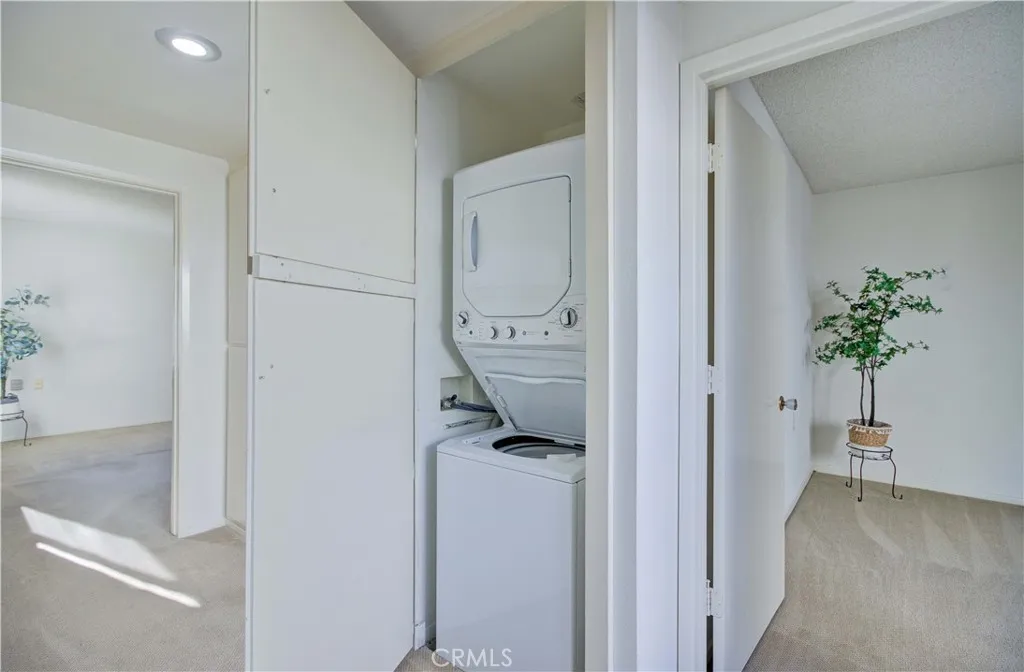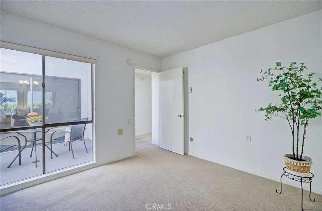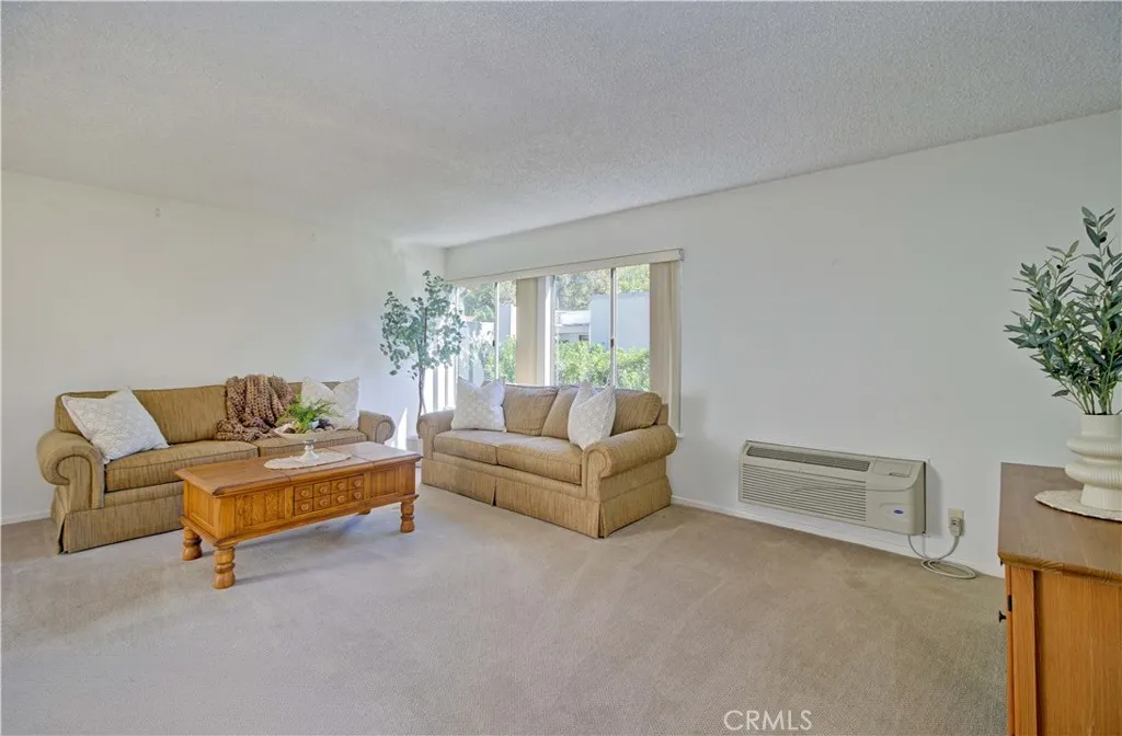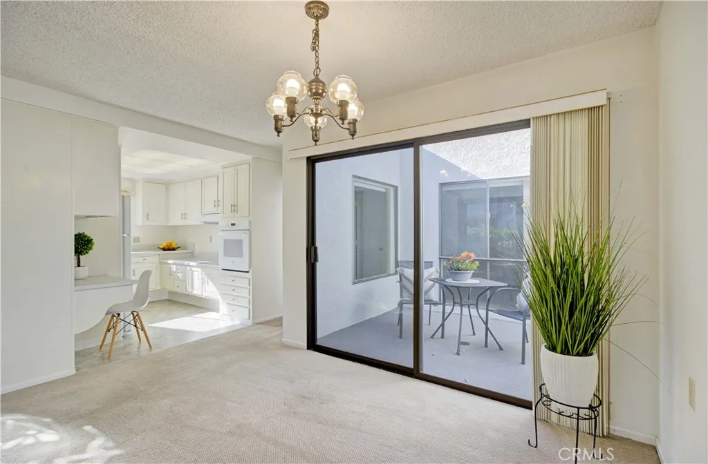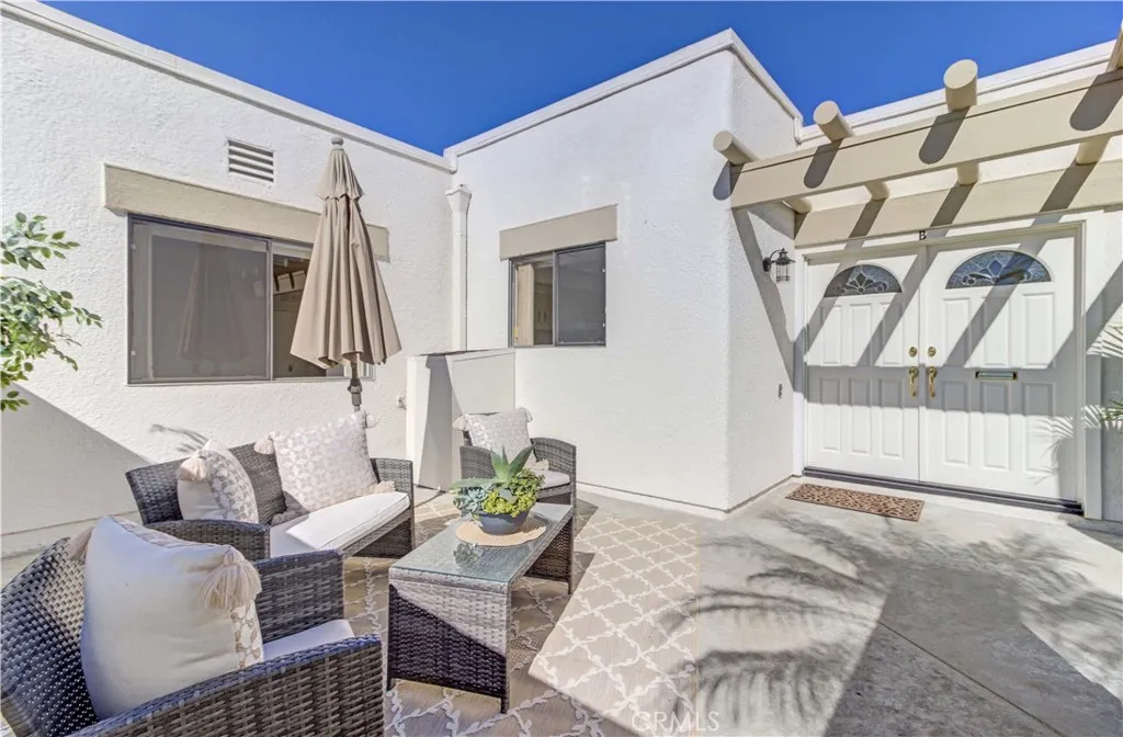 Bright and sunny southwest facing "Valencia" cottage - no steps, no one above or below. This popular patio home features a large, private front patio area with 2 spacious storage closets and adobe style beams over the front door. Upgraded double door entry with half moon windows provides extra light. Inside, you'll find a mostly original co-op recently upgraded by the HOA with countertops, fixtures and flooring in both kitchen and bathroom. Spacious living room area has wall heat pump and large south facing window. Adjacent is the dining area and atrium, the atrium supplies morning light and air flow for 3 areas - dining, hallway and guest bedroom. Kitchen features white appliances maintained by the HOA and window over the sink looking out to the front patio. Both bedrooms enjoy ample closet space and windows looking into private patio areas - no sidewalks. Large bathroom houses dual sink vanity, tub/shower combo + additional walk-in shower. STACK WASHER/DRYER in hallway closet! Carport is close, easy access to gates and shopping and Clubhouse 4 - the arts and crafts center for Laguna Woods with workshops and classes to enjoy plus lap swimming pool. Residents enjoy access to an unparalleled array of amenities, including championship and executive golf courses, multiple swimming pools, fitness centers, pickleball and tennis courts, lawn bowling, equestrian facilities, gardening centers, art studios, computer labs, classes, and over 200 clubs and social organizations. HOA LANDSCAPING IN PROCESS