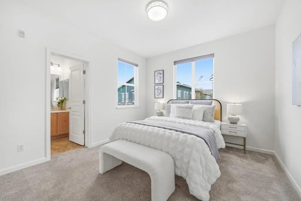 Gorgeous, move-in ready townhouse steps from Newhall Park and walking distance to Santa Clara University! Tucked away from the main street for maximum privacy, this bright, quiet unit is in one of the community's best locations and offers ample nearby guest parking. It features a fresh interior paint, and newly upgraded modern light fixtures throughout. The main level features high ceilings, recessed lighting, central AC and a convenient powder room. The chefs kitchen is appointed with stain-grade maple cabinetry, granite countertops, a pantry, and premium appliances. Upstairs, enjoy two spacious primary suites, one has a walk-in closet, dual sinks, and a separate soaking tub. The ground level offers a versatile den/office and an indoor laundry room equipped with a new Samsung washer and dryer. The attached 2-car side by side garage with a 220V Level 2 EV charging outlet. Outside, enjoy a private front patio perfect for grilling and gardening. Incredible location with low HOA fees that include water! Less than 1 mile to Caltrain and minutes from SJC, PayPal Park, SAP Center, Valley Fair, and Santana Row. Easy access to 880/87/101 and major tech hubs. Enjoy the best of San Jose living with uncrowded parks and dining just outside your door!