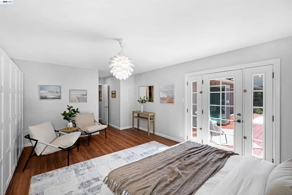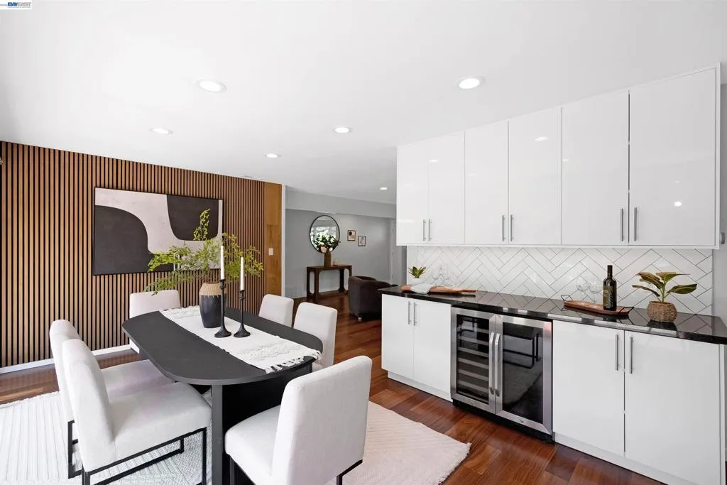 Single-story home nestled in the desireable neighborhood of Woodland Estates. Enter to a bright living room with recessed lighting that flows seamlessly into the dining room, featuring a stunning acoustic slat wall & modern expansive bifold doors. Providing a picturesque view of the exterior deck & lush backyard views. Gorgeous remodeled modern kitchen boasts new IKEA cabinets, sleek countertops, stainless steel appliances including built-in microwave/oven, electric cooktop, under-cabinet lighting, & illuminated drawers. Counter-to-ceiling backsplash adds an extra touch of elegance. Dining Room offers additional cabinets, counter & wine/beverage cooler. Luxury flooring throughout with durable Andes Brazilian solid hardwood floors. Four bedrooms including a luxurious extended primary suite with French doors to the private yard, freestanding custom closet system, and spa-like bath with soaking tub + separate stall shower. Expanded 4th bedroom offers an extra-long closet & private sliding doors to the side yard. Raised panel interior doors & fresh interior touch-ups throughout. Two full baths. Energy-smart upgrades include fully owned solar panels with batteries. Shed refurbished to an office (w/electrical + A/C). Short walk to community pool & club house