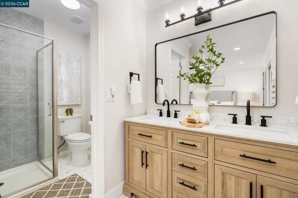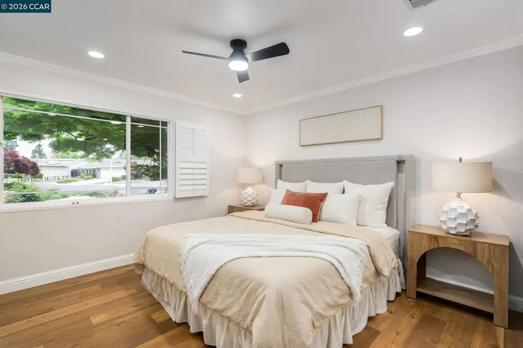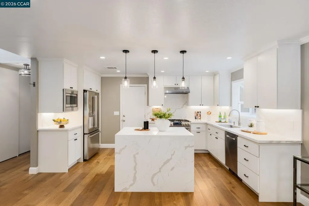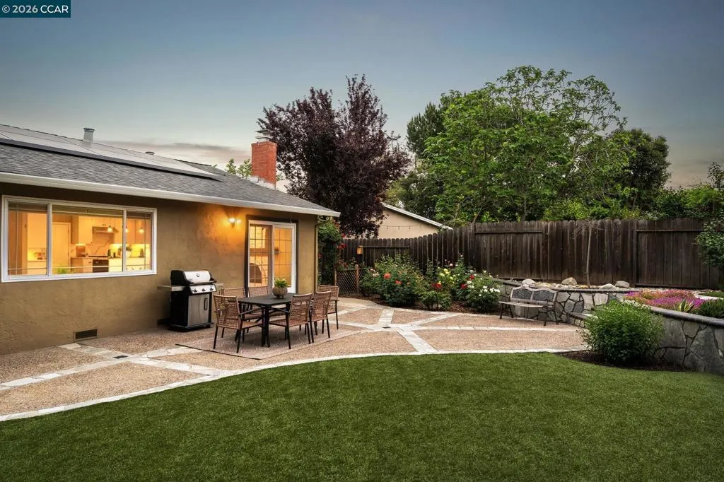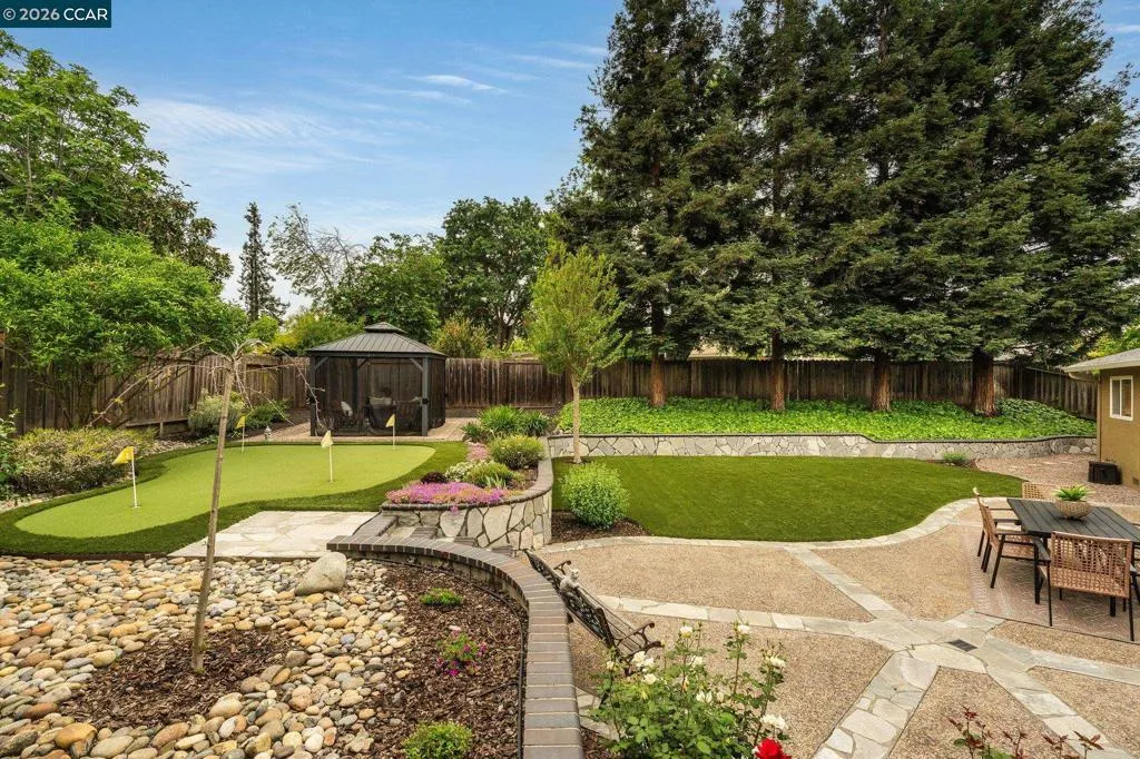 North-facing and located on a quiet cul-de-sac in one of San Ramon’s most desirable neighborhoods, this beautifully updated home offers the perfect blend of comfort, functionality, and modern upgrades. The home was extensively renovated approximately seven years ago and has been meticulously maintained since. Features include a newer roof, newer HVAC system, paid-off solar, hardwood floors, and a fully updated kitchen with custom cabinetry, quartz countertops with waterfall island, designer backsplash, and stainless steel appliances. The open-concept layout is enhanced with recessed lighting and flows seamlessly from the kitchen into the dining and living areas, ideal for both everyday living and entertaining. Both bathrooms have been tastefully upgraded with new vanities and tile flooring. A two-car garage and laundry hookups add everyday convenience. The backyard is designed for relaxation and entertainment, featuring a wrap-around paver patio, low-maintenance artificial turf, a custom putting green, and a gazebo seating area. Generous side yards on both sides provide additional space and flexibility. Just minutes from Pine Valley Middle School & Boone Acres Park, w/ quick access to I-680 & the Iron Horse Trail, this home offers comfort, flexibility, & everyday convenience.