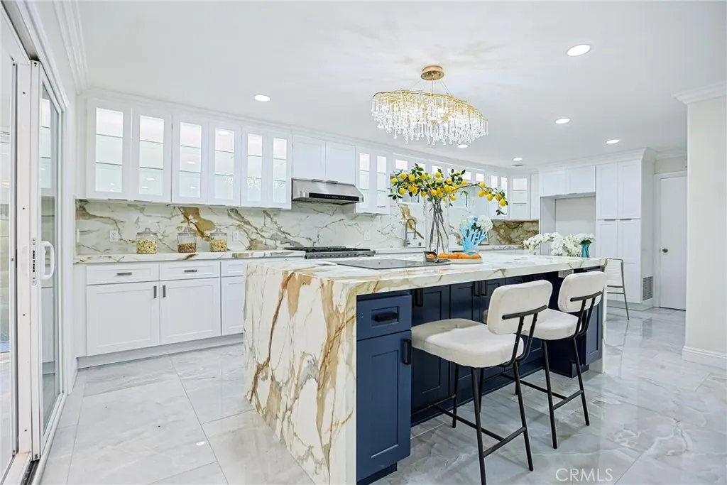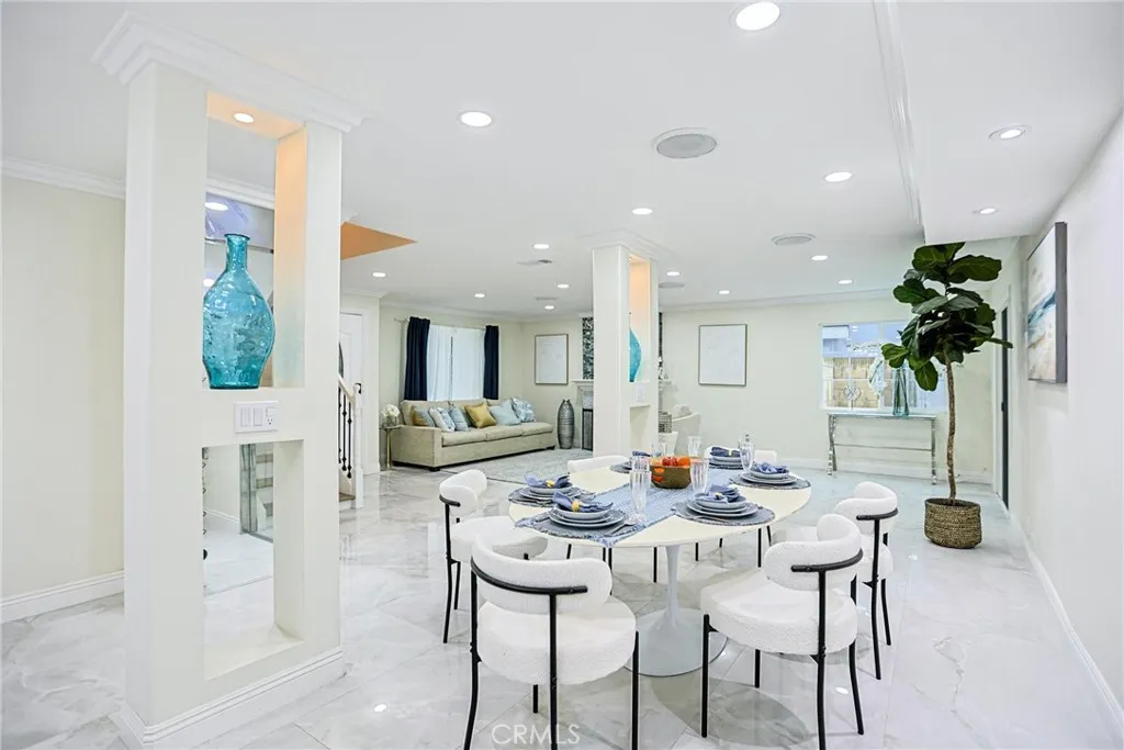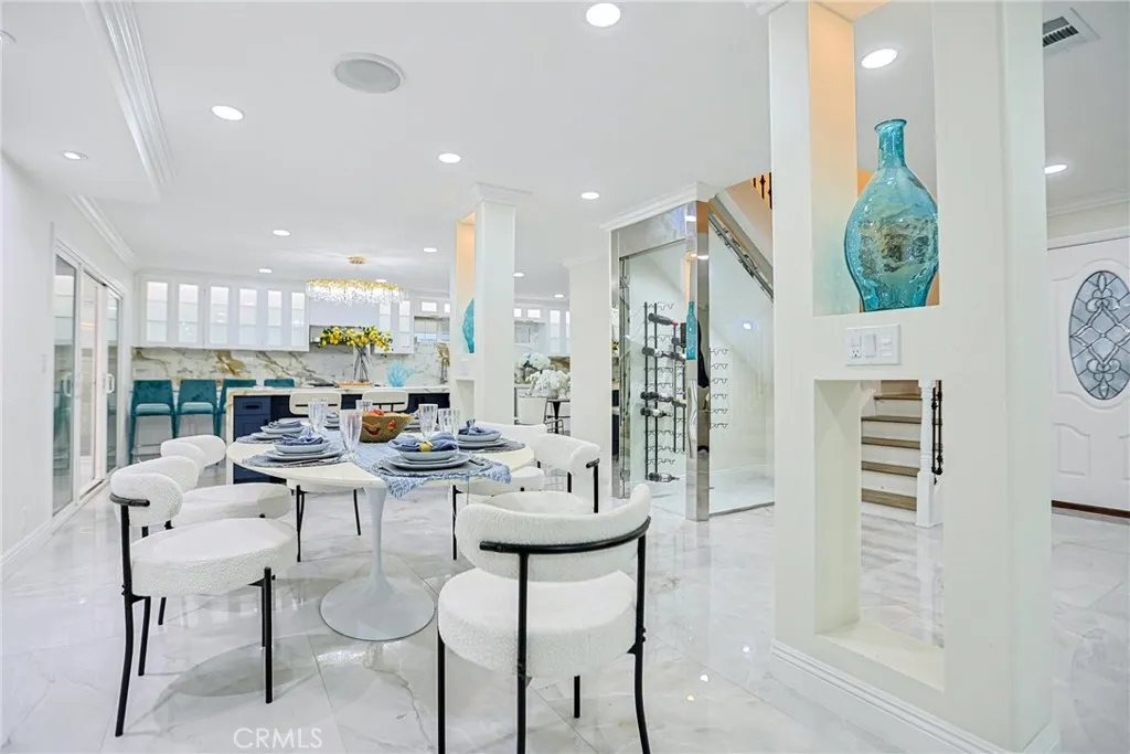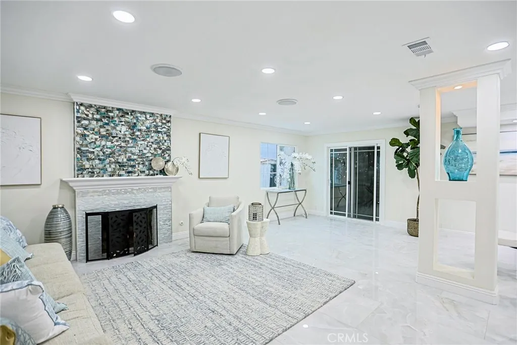 Property is being offered via auction. Welcome to 17230 San Lorenzo Circle—a statement of modern elegance and refined living, nestled in the highly sought-after Green Valley enclave of Fountain Valley. This fully reimagined residence offers 4 bedrooms, 3 bathrooms, and a versatile bonus room spanning approximately 2,288 square feet on a 5,400 sq ft lot. Every detail has been curated to evoke sophistication and comfort. The open-concept design bathes the interior in natural light, accentuated by custom recessed illumination and sleek contemporary finishes. The gourmet chef’s kitchen is a centerpiece of artistry and function, showcasing a dramatic waterfall island, integrated high-end appliances, and flawless cabinetry. The living area sets the stage for unforgettable entertaining with a bespoke illuminated wine cellar and a designer-crafted feature wall that elevates the home’s ambiance. Upstairs, retreat to the luxurious primary suite, a serene sanctuary complete with a private balcony, expansive walk-in closets, and a spa-inspired ensuite designed for indulgence. The enclosed glass patio extends the living space effortlessly, leading to a lush tropical garden adorned with mature longan trees, creating a tranquil oasis for year-round enjoyment. Additional features include solar panels, a low $45/month HOA with access to community pools and clubhouse, and proximity to Mile Square Park and acclaimed local schools. Masterfully blending luxury, innovation, and timeless style, this Fountain Valley gem offers an unparalleled lifestyle in one of Orange County’s most desirable neighborhoods.