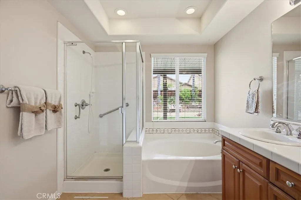 Welcome to this lovely home with a highly desirable floorplan boasting a DOWNSTAIRS PRIMARY BEDROOM and 2 additional downstairs bedrooms, 3 downstairs bathrooms, and a Jr. Primary Bedroom upstairs w/a Full Bath! This floorplan is so versatile and can support a multitude of living situations. The downstairs primary bedroom has a spacious walk-in closet, large bathroom vanity area with a separate tub & shower, and a privacy door for the commode. The 2 additional downstairs bedrooms share the large hall bathroom with dual vanity sinks and a privacy door for the commode and shower/tub. The guests have their own powder room. The living space is open and light with high ceilings open to the loft and windows throughout, allowing natural light to flow seamlessly. The loft is a great space that can be utilized as an office, a gym, a tv area, or even an extra bedroom if needed. From the loft area, there's a short hallway with storage cabinets leading to the Jr. Primary Bedroom and Bath. The backyard is adorned with many seasonal flowers, grapevines, alumawood patio cover that stretches the entire length of the house, and a large shed. The indoor laundry has a sink and a counter for folding clothes. The roomy 3 car garage nearly completes this fabulous house... it's just looking for you to make it your new home.