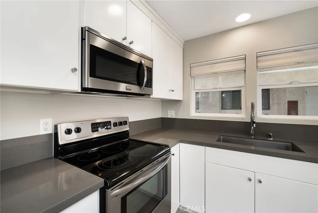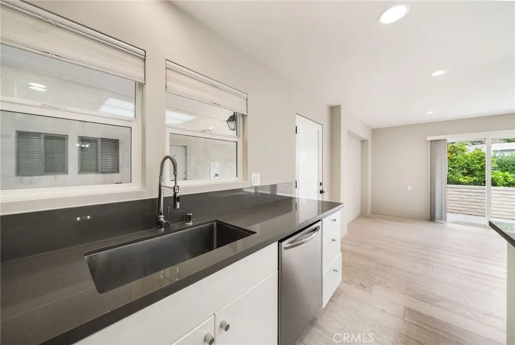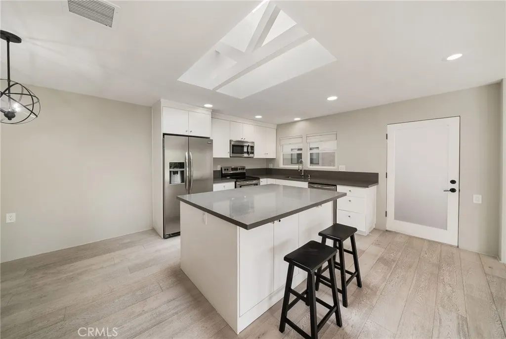 Completely remodeled single level home in Laguna Woods a 55+ community. Greenbelt location, no one above or below. The kitchen features quartz countertops & stainless steel appliances and is perfect for entertaining with a center island that opens to the family room and dining areas. A skylight was added over the island & brings in extra light. The floor plan was completely redesigned. The primary bedroom now contains a spacious walk-in closet, all ceilings raised to one level & a new laundry area. Both bathrooms have sleek touches including designer ceramic tile, lighting, & two-toned designer paint. Both showers are Walk-in showers with no steps to climb over. Triple sliding glass doors lead out to a delightful patio that captures the morning sun & offers shade in afternoon. Beautiful greenery surrounds the patio area. The home offers an opaque glass front door, wide plank engineered wood floors, recessed lighting, dual panel vinyl windows, TV & cable hookups in bedroom & living room, forced air heating and air conditioning, new electrical throughout! All the Laguna Woods Amenities too!