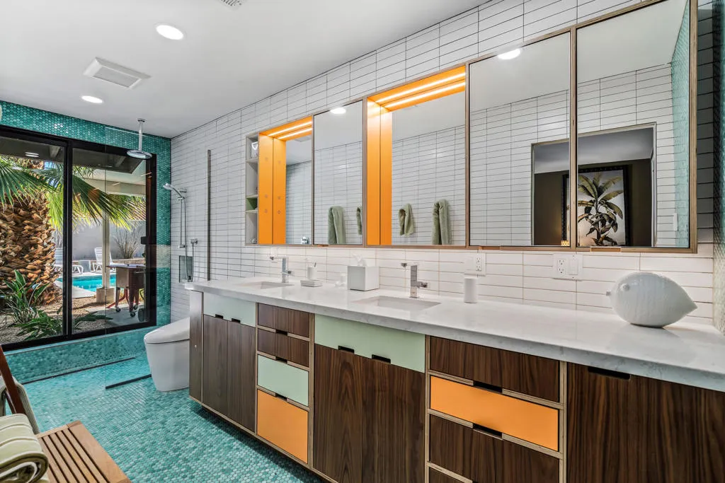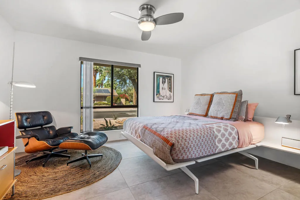 Welcome to a beautifully reimagined desert retreat, where architectural character meets elevated modern living. This 4-bed, 3-bath home makes an immediate impression with its striking curb appeal--clean lines, desert landscaping, and iconic double entry doors in a signature Palm Springs hue that set the tone for what's to come. Inside, the light-filled interior is defined by vaulted ceilings and large-format tile flooring throughout. The open-concept living and dining areas are both sophisticated and inviting, anchored by a dramatic double-sided gas fireplace that serves as a dramatic centerpiece. A spacious dining area sits just off the patio, creating a seamless indoor-outdoor connection ideal for entertaining, while the living room is complemented by a stylish wet bar--perfect for hosting or unwinding in comfort. The chef's kitchen is equally impressive, featuring sleek quartz countertops, custom Kerf cabinetry, a GE induction cooktop with range hood, GE Cafe double ovens (including convection and speed oven), a 36' Sub-Zero refrigerator, Fisher & Paykel DishDrawer dishwashers, and a full suite of thoughtfully integrated appliances. Walls of glass open to a private South-facing backyard designed for true resort-style living. Enjoy a saltwater pool and spa, fire table lounge, gas BBQ, and multiple seating areas--all framed by mature citrus, olive, and palm trees. Lush grass contrasts beautifully with desert landscaping, while block walls provide privacy and tranquility. The bedroom wing includes a large primary suite with a dramatic walk-in shower with picture window, refined finishes, and a generous walk-in closet. Two additional bedrooms share a well-appointed bath and offer flexible space for an office or studio. A fourth bedroom on the opposite side of the home has its own en-suite bath, ideal for guests. Comfort and efficiency are seamlessly integrated with Milgard energy-efficient windows and sliders, a central Carrier heat pump, Mitsubishi mini-splits in the guest suite and garage, two tankless hot water heaters, and a Culligan water softener. Additional features include ceiling fans throughout, two EV chargers, a finished attic space, and a storage shed. Offered furnished (outside of escrow/artwork excluded) with select electronics including TVs and a Sonos sound system, this home is move-in ready and perfectly suited as a full-time residence, vacation escape, or income-producing investment in one of the desert's most sought-after locations.