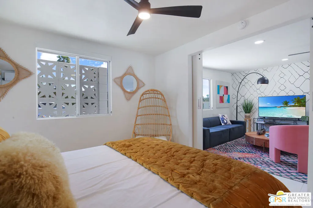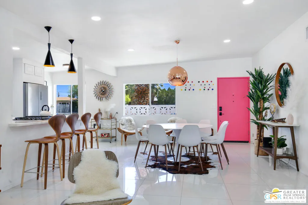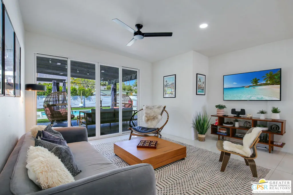 Looking for the perfect ready to enjoy, furnished Palm Springs home? Recently renovated, furnishings included and great short term rental potential! Welcome to 631 S El Cielo, where mid-century allure perfectly blends with modern luxury in the vibrant heart of Palm Springs! This Mid-century Modern gem, with 21 owned solar panels, sits in the coveted Little Beverly Hills neighborhood of central Palm Springs. This home blends architectural character with contemporary sophistication and has the perfect layout for both indoor/outdoor entertaining. The home features two separate living rooms both flanked by two guest bedrooms (4 bedrooms in total), ideal for multiple families to enjoy their privacy while also enjoying the common entertaining spaces. This backyard boasts a large pool and spa, bocce ball court, fire pit, life-sized chess board and a covered patio complete with a built-in BBQ with breathtaking panoramic views of the surrounding mountains. Located close to a public park which includes a dog park and pickleball courts. This home is an especially distinctive offering for those looking for an expansive primary residence, perfect weekend vacation home or a short term rental - investment property!