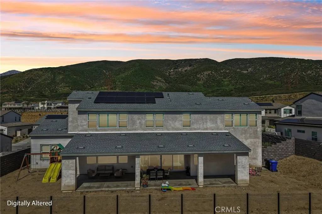 Welcome to this stunning, turnkey residence in the highly sought-after gated community of Narra Hills, where resort-style living meets modern comfort. Residents enjoy exceptional amenities including a gated entrance, pool, spa, lap pool, clubhouse, park, playgrounds, pickleball courts, and scenic mountain views. A charming front porch welcomes you into a bright interior featuring soaring vaulted ceilings and elegant wood shutters throughout. Just off the foyer, a hallway leads to a private junior suite with bathroom and a dedicated office or den—ideal for guests or working from home. The heart of the home showcases a spacious open-concept living room, dining area, and kitchen designed for both everyday living and entertaining. The kitchen is beautifully outfitted with abundant white cabinetry, striking blue marble countertops with dramatic veining, a walk-in pantry, and a convenient office nook with built-in desk. A mudroom adds functionality, while a sliding glass door opens to a large covered patio and a backyard ready for your personal vision. Upstairs, a generous loft provides versatile living space, along with three additional bedrooms, two bathrooms, and a laundry room. The expansive primary suite features a walk-in closet and a luxurious en-suite bathroom with dual sinks, a soaking tub, and a separate shower. Additional highlights include owned solar, offering energy efficiency and long-term savings and an oversized 3 car garage for parking and storage needs. This home offers the perfect blend of space, style, and resort-inspired community living.