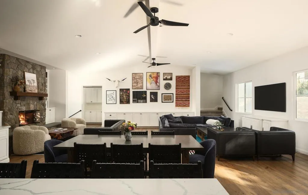FIRST TIME ON THE MARKET: A property that often leaves its visitors breathless, this contemporary home hosts an array of cozy spaces as well as large, high-ceiling'd rooms fit to host large gatherings for family and friends. Nestled amidst .68 acres of mature native oaks and pecan trees as well as curated plantings, 9777 Grosalia is located on one the most amazing blocks in all of La Mesa and Mt. Helix. Engaging Sierra Vista to the south, the backyard hosts historic remains of a water tank that now hosts a a family pickleball court with amazing views to the north. The owned solar array faces south atop a standing-seam metal roof. Additional rooms include a converted fourth bedroom, office and loft.