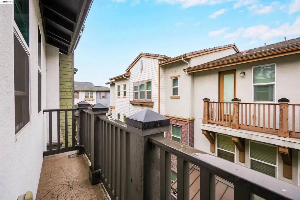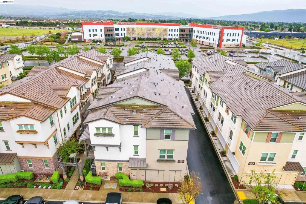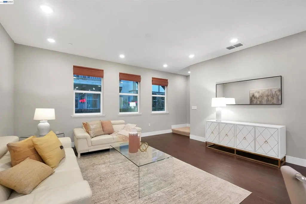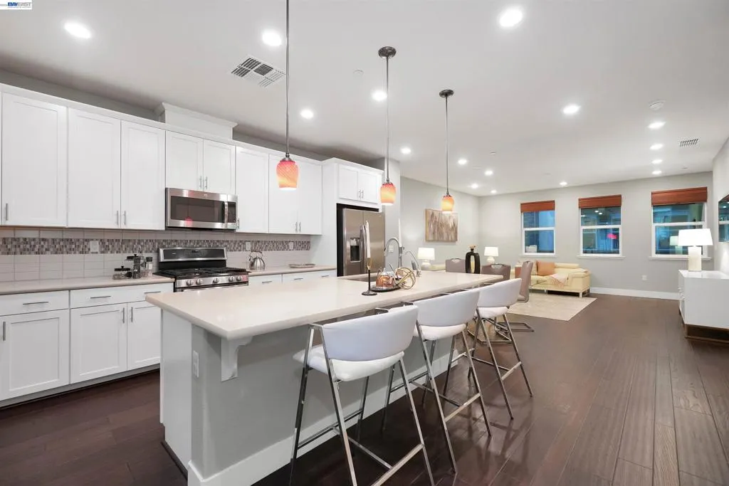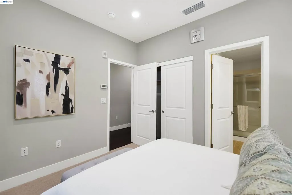 Welcome to this beautifully upgraded EAST Facing, 3-bedroom, 3.5-bath townhome-style condo offering the perfect blend of style, functionality, and convenience. Step into a spacious, open-concept living space featuring elegant hardwood flooring and a spacious island kitchen—ideal for cooking and entertaining. The kitchen showcases quartz countertops, Full backsplash, premium white cabinetry, and GE stainless steel appliances, combining both beauty and practicality. Each bedroom features its own attached bathroom, ensuring comfort and privacy for all. A desirable first-floor bedroom with a full bath is perfect for guests, extended family, or a home office. The primary and secondary bedrooms include custom closet systems for added organization. Enjoy outdoor living on the large balcony patio—perfect for relaxing or hosting gatherings. This home is packed with premium upgrades, including a Tesla charger, water softener, reverse osmosis drinking water system, and Hunter Douglas window shades. The garage is a standout feature with epoxy flooring, built-in storage cabinets, and a projector setup for added versatility. Conveniently located near schools, shopping, dining, hospitals, BART, and major freeways, this home offers exceptional accessibility for commuters and everyday living.