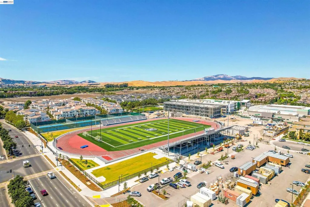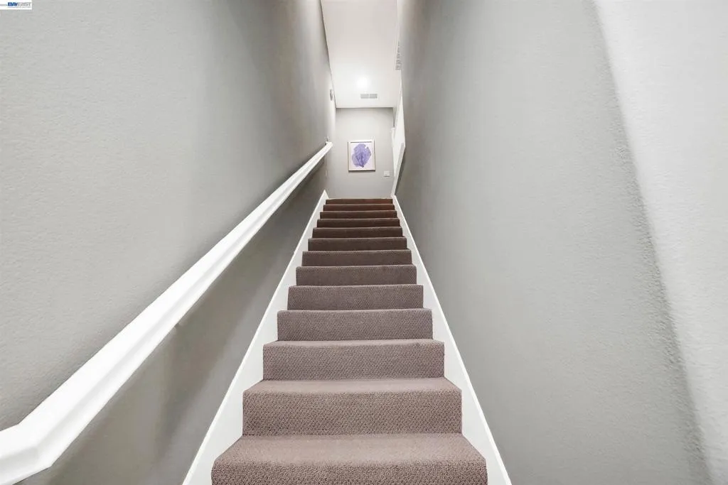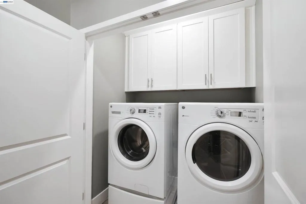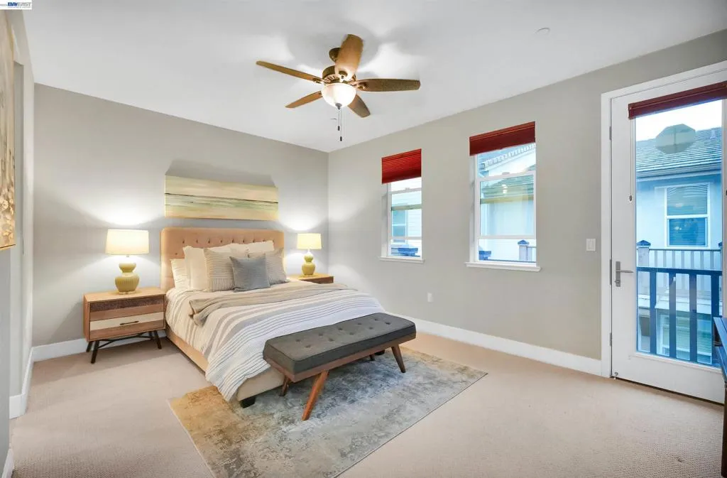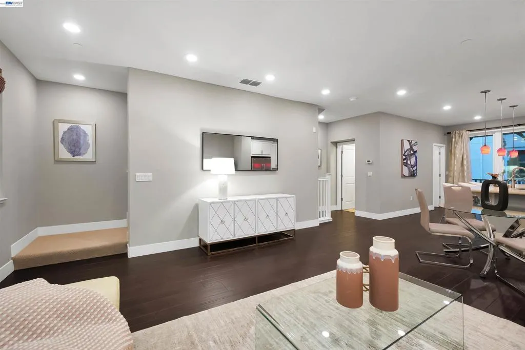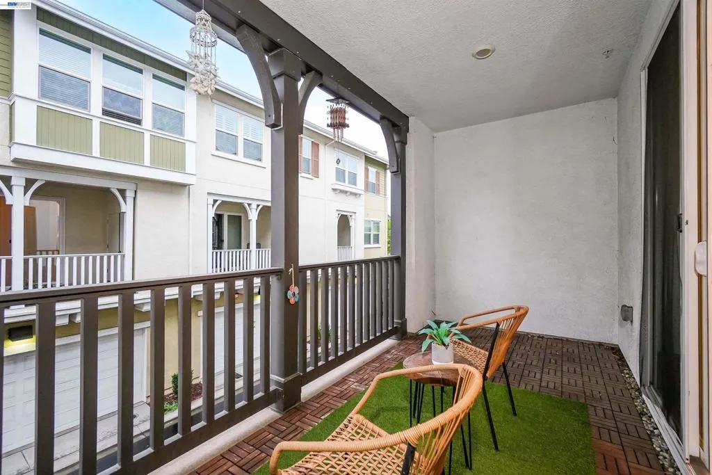 Welcome to this beautifully upgraded EAST Facing, 3-bedroom, 3.5-bath townhome-style condo offering the perfect blend of style, functionality, and convenience. Step into a spacious, open-concept living space featuring elegant hardwood flooring and a spacious island kitchen—ideal for cooking and entertaining. The kitchen showcases quartz countertops, Full backsplash, premium white cabinetry, and GE stainless steel appliances, combining both beauty and practicality. Each bedroom features its own attached bathroom, ensuring comfort and privacy for all. A desirable first-floor bedroom with a full bath is perfect for guests, extended family, or a home office. The primary and secondary bedrooms include custom closet systems for added organization. Enjoy outdoor living on the large balcony patio—perfect for relaxing or hosting gatherings. This home is packed with premium upgrades, including a Tesla charger, water softener, reverse osmosis drinking water system, and Hunter Douglas window shades. The garage is a standout feature with epoxy flooring, built-in storage cabinets, and a projector setup for added versatility. Conveniently located near schools, shopping, dining, hospitals, BART, and major freeways, this home offers exceptional accessibility for commuters and everyday living.