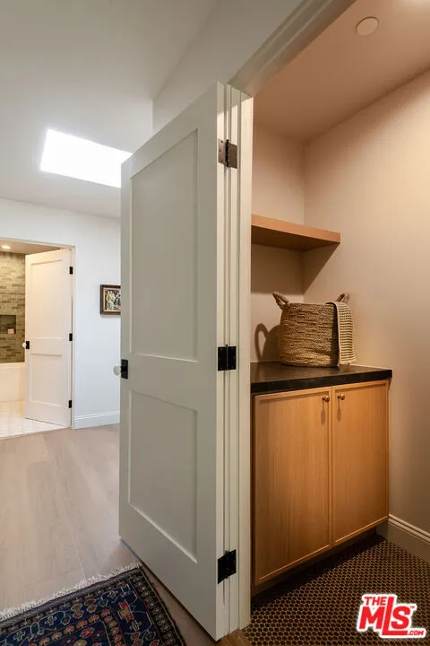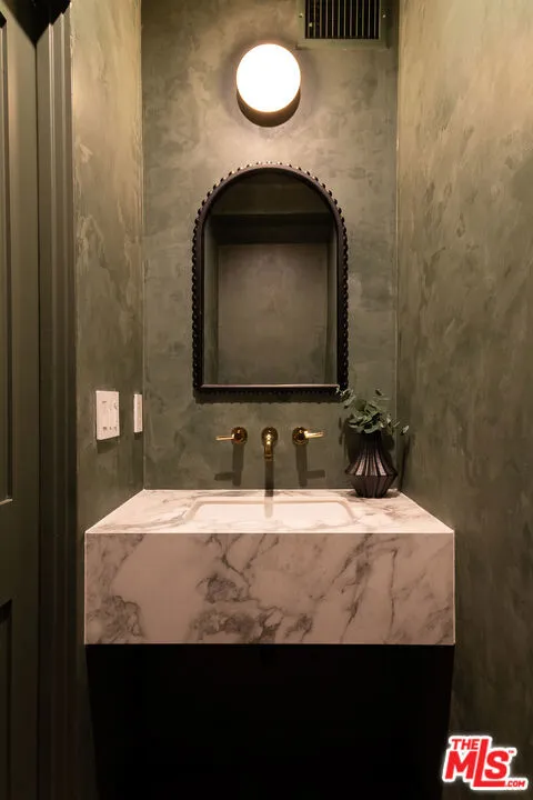 This newly constructed 3-bed, 3-bath Spanish-style residence by Cassa Design Studio blends timeless architectural character with a refined, design-driven vision in the heart of Mid-Wilshire. Light-filled interiors offer an effortless flow, with the main level anchored by a designer kitchen ideal for entertaining. Dark granite countertops, a striking Arabescato porcelain backsplash, brass pot rail detailing, and a custom Portola Roman clay range hood introduce depth and texture, while a built-in dining nook adds both function and thoughtful design. The private outdoor patio extends directly from the living and dining areas, creating a seamless indoor-outdoor connection ideal for everyday living and entertaining, all set against lush, Mediterranean-inspired landscaping. A moody green Roman clay powder room adds a rich, design-forward moment on the main level. Upstairs, three generously sized bedrooms offer comfort and privacy, including a spacious primary suite with a customizable walk-in closet and a private balcony finished with zellige-inspired terracotta tile. The primary bath is designed with intention, featuring a double vanity and an oversized walk-in shower with black penny marble flooring and refined Arabescato porcelain surfaces. A full third bath is equally considered, incorporating sage green zellige-inspired tile and classic Spanish flooring. Curated brass fixtures and statement lighting bring warmth throughout. Additional features include HVAC, hardwood flooring, a full laundry room, Integrated A/V wiring (Cat6), paid off solar panels, Ring doorbell, and Nest thermostat. The property is gated and secured, with dedicated parking and an EV charging outlet. Situated in a highly coveted neighborhood near Museum Row and the upcoming Purple Line, and just around the corner from Lassens, Republique, All Season Brewing Company, Met Her At A Bar, LACMA, and Hancock Park, this residence offers a refined blend of design, comfort, and modern living.
