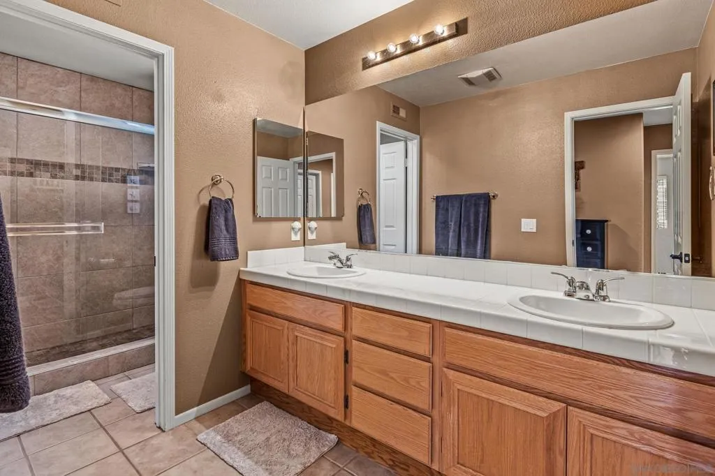 Tucked away on a quiet cul-de-sac in the scenic hills of North Escondido, near Lake Dixon, this beautiful two-story home offers a rare combination of privacy, tranquility, and natural separation from the surrounding city. Set against gently rolling topography, the property enjoys a peaceful, almost secluded feel while still being conveniently close to local amenities. Inside, you’ll find a spacious and inviting open floor plan highlighted by soaring cathedral ceilings and a cozy fireplace. The generously sized walk-in laundry room offers abundant counter space, cabinetry, and a deep basin sink for added convenience. Upstairs, the primary suite features a double-door entry and vaulted ceilings, complemented by a private retreat with French doors that open to a spacious deck overlooking the backyard, capturing refreshing coastal breezes. The ensuite bath features dual sinks, a separate soaking tub and shower, and both his-and-hers closets. Designed for comfort, this light-filled home stays cool with ceiling fans and central air conditioning. With no rear neighbors, enjoy exceptional privacy in a spacious, peaceful backyard—perfect for relaxing or entertaining. A wonderful place to call home!