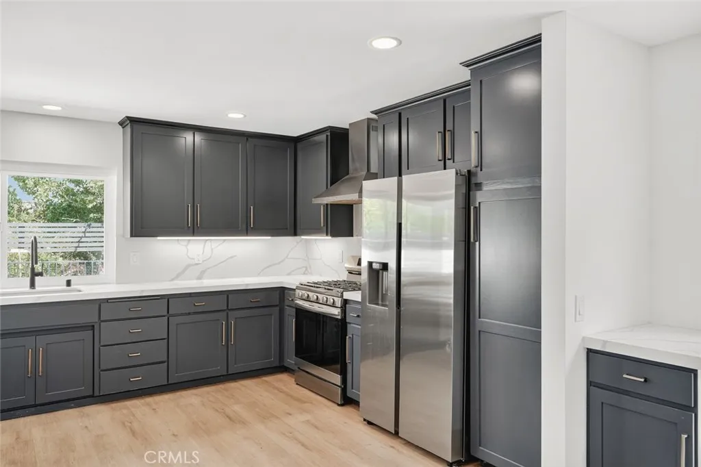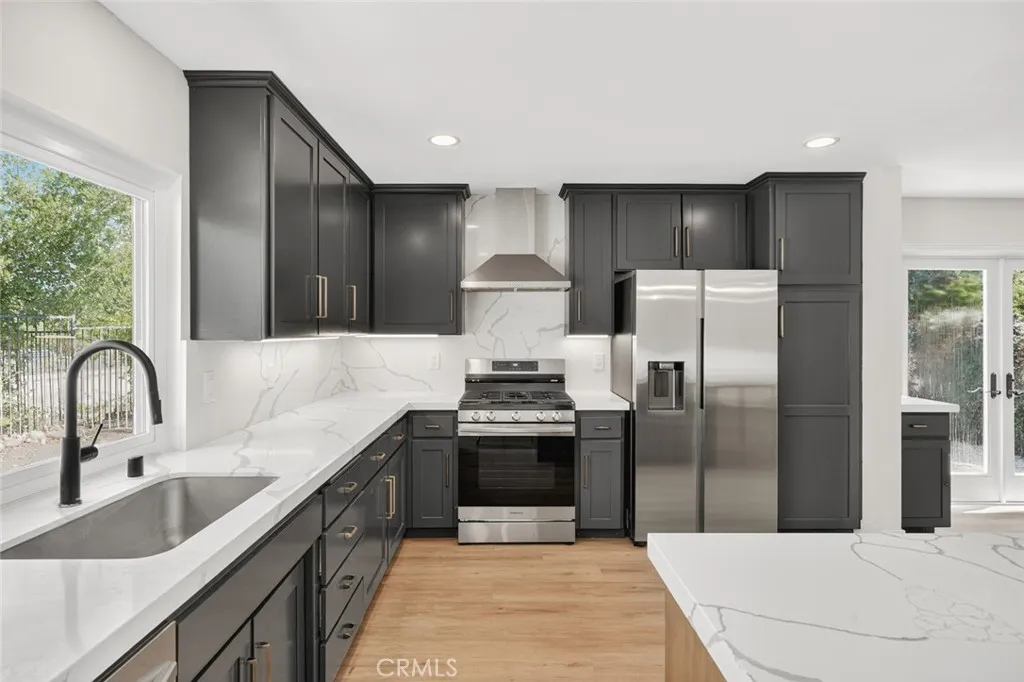 Discover this beautifully designed 4-bedroom, 2-bathroom single-story home offering 2,038 sq ft of open and inviting living space. The open floor plan is filled with abundant natural light from large glass doors and multiple windows, creating a bright and airy atmosphere throughout. The kitchen is both stylish and functional,featuring a center island perfect for casual dining, along with ample counter space and generous storage. The living room serves as a stunning focal point with a dramatic floor-to-ceiling fireplace, ideal for relaxing or entertaining. Situated on a spacious 9,583 sq ft lot, the exterior is equally impressive with a modern permeable patio and a large in-ground pool that thoughtfully wraps around the corner of the home, maximizing outdoor living space. This home seamlessly blends comfort, design, and indoor-outdoor living.