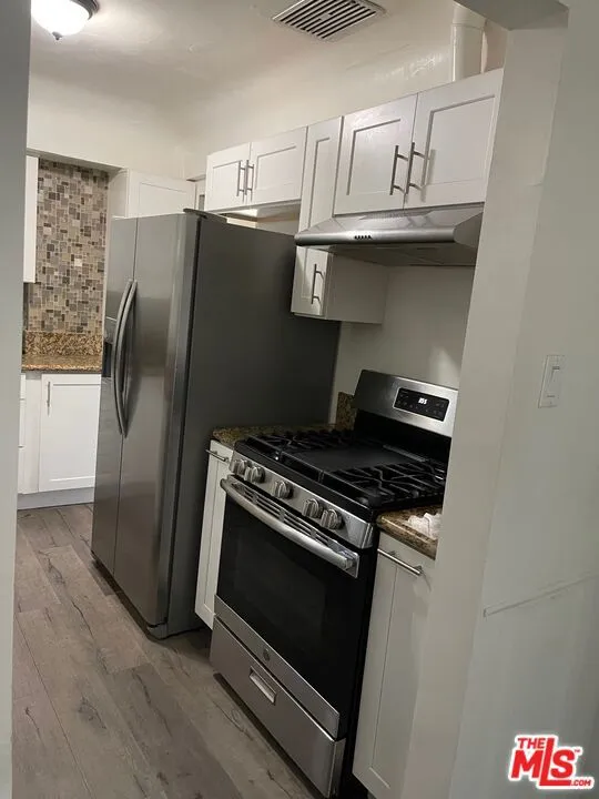 A remodeled unit of about 1,550 sq ft in the downstairs duplex, with two bedrooms and a den that can be used as a bedroom. The kitchen has beautiful cabinets with new granite countertops. Refurbished hardwood floors plus laminated floors, a washer and dryer, a wall air/heater, plus another central heating system. It requires a good credit history. There is a discount for fewer people.