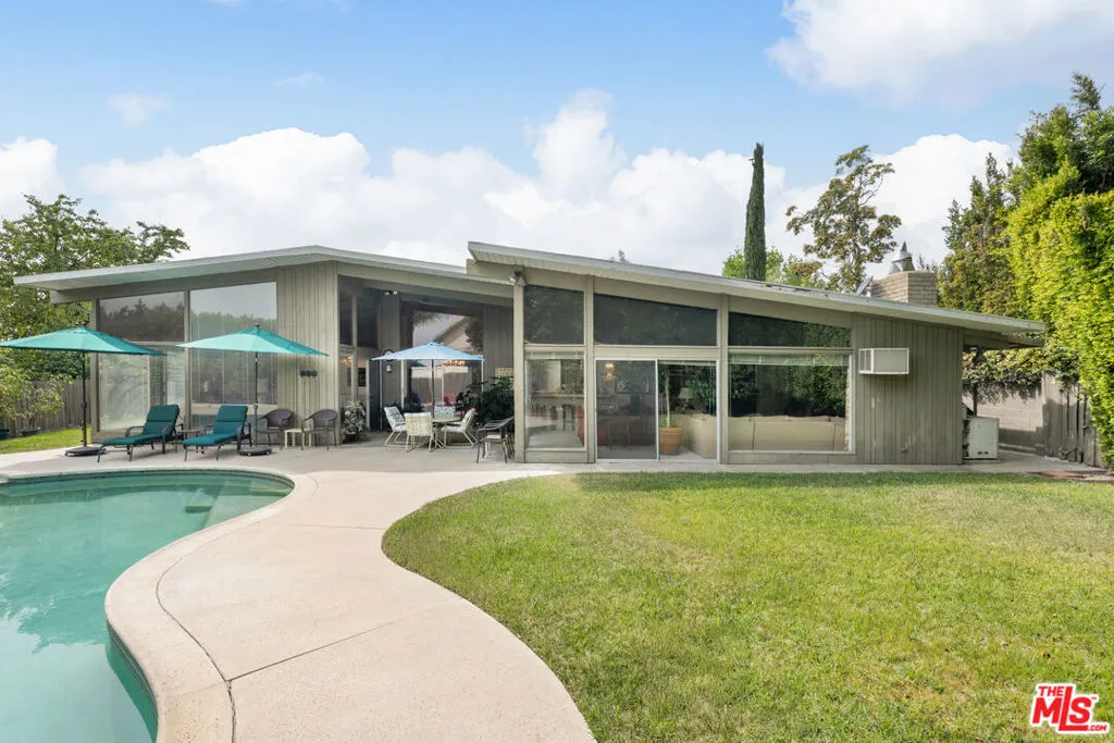 Offer deadline April 23rd at 5pm. First Open House Saturday April 4th 2pm-5pm. Mid-century residence on a nearly 10,000 SF flat lot in Brentwood, offering 4 bedrooms, 2.5 bathrooms, plus an office and den. Marked by great ceiling height, expansive windows, and abundant natural light, the home retains the warmth and character of its original design while providing a well-balanced layout for everyday living. The main living spaces open seamlessly to the backyard, where ample yard space, a pool, and multiple seating and dining areas create an ideal setting for both family living and entertaining. The generous scale of the outdoor areas, including a spacious side yard, offers rare flexibility to expand, enhance, or reimagine over time.Complete with a 2-car garage, this is a rare opportunity for a family to thoughtfully update and personalize a home with volume, character, and exceptional outdoor space in one of Brentwood's most desirable settings.