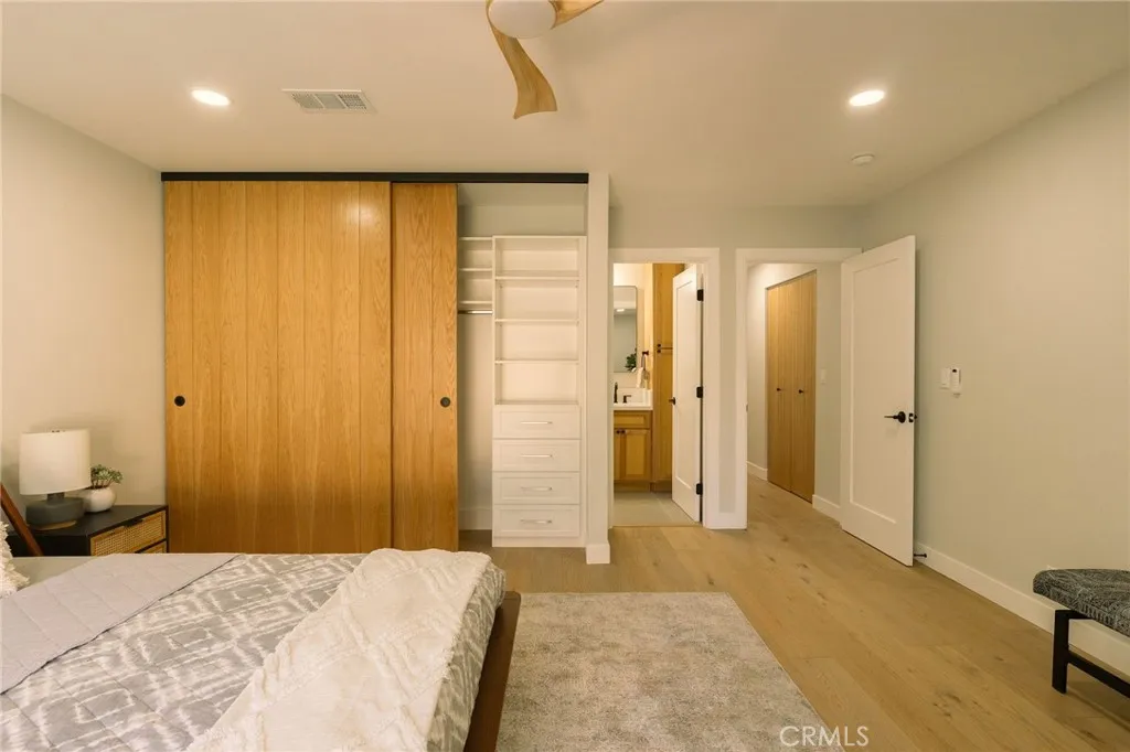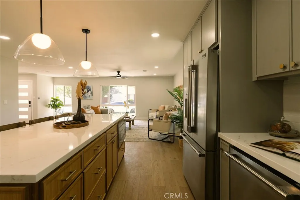 Welcome to this beautifully renovated 3 bedroom, 2-bathroom home located in prime Los Altos neighborhood. This corner home has an inviting curb appeal featuring drought tolerant landscape. Featuring a bright open floorplan the front living area flows through to the kitchen and then to another spacious living/dining area. The kitchen has been updated with new two-tone cabinets, sleek quartz counter tops, tile backsplash, stylish fixtures, stainless-steel appliances and has a large center island with plenty of countertop seating. The spacious primary bedroom has a large closet with custom built-ins, and ensuite bathroom and access to outdoor covered patio. Both the primary and hall bathroom feature new double sink vanities, stylish new fixtures, and custom tile work. Other features include freshly painted interior and exterior, new luxury engineered hardwood flooring throughout the living area, bedrooms and tile flooring in both bathroom and back living area, new energy efficient vinyl windows, new roof, plumbing and light fixtures, upgraded electrical panel, HVAC, new garage door and motor. spacious indoor laundry room and tankless water heater. This home is great for fun and entertainment with a great outdoor space. The private enclosed backyard has a large, covered patio and a manicured yard. There is a two-car garage with additional off-street driveway parking as well as small storage room attached to the garage. Tax rolls show different bedroom count.
