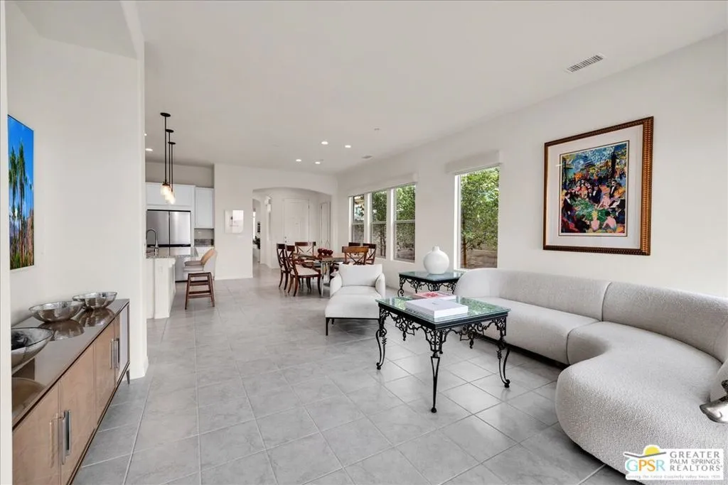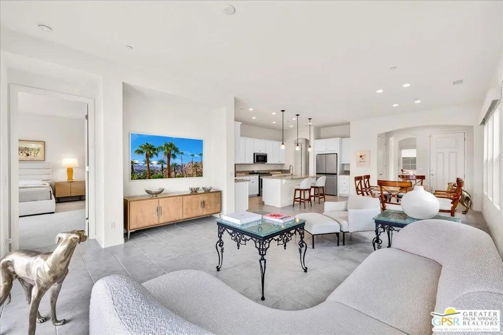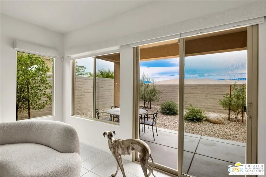 Perimeter View Home with Mountain Backdrop in Del Webb Rancho Mirage. Ideally positioned along the perimeter of the community, this Phase 6, Plan 3 Expedition with Tuscan facade offers unobstructed mountain views and a peaceful setting within the highly sought-after Del Webb Rancho Mirage community. This newer, energy-efficient home features 2 bedrooms, 2 baths, and a versatile flex space, thoughtfully designed for comfortable everyday living. Inside, the home showcases expanded 12-inch tile flooring, custom designer window treatments, and the desirable Arch package throughout, creating a warm and inviting atmosphere. The centrally located kitchen serves as the heart of the home, featuring natural granite countertops, 42-inch upper cabinetry, and additional pendant lighting above a generously sized island with ample seating. A stainless steel Whirlpool appliance suite with convection oven and microwave, along with a convenient walk-in pantry, adds both style and functionality. From here, the kitchen flows effortlessly into the dining and living areas, where natural light and beautiful views of the surrounding mountains enhance the open-concept design. The primary suite is spacious and relaxing, offering mountain views and a well-appointed ensuite bath complete with a glass-enclosed stall shower with bench seating, dual undermount sinks, and a large walk-in closet. Located toward the front of the home, the flex space/den is currently used as an office but can easily serve as a media room, hobby space, or wellness retreat. Just beyond, you'll find the upgraded pass-through guest bathroom, featuring a glass-enclosed shower-over-tub combination and generous linen storage, which is conveniently located near the secondary bedroom with its own walk-in closet. Step outside to a fully landscaped backyard designed for easy desert living, featuring a covered patio ideal for outdoor dining and relaxation, along with drought-tolerant trees and shrubs, decorative river rock accents, and a clean, low-maintenance landscape that complements the beautiful mountain backdrop. The laundry room is well equipped with additional upper cabinetry, a utility sink, and Samsung Smart washer and dryer with steam functions. Additional highlights include leased solar ($120/month), an epoxy-sealed garage floor, ample built-in garage cabinetry, and a NEMA 50-amp outlet ready for a future EV charger. Located within the prestigious 55+ Del Webb Rancho Mirage community, residents enjoy access to exceptional amenities including a large clubhouse, state-of-the-art fitness center, resort-style pool and spa, tennis and pickleball courts, and a vibrant calendar of social activities. HOA dues now include a cable and internet package for added value and convenience. A beautifully maintained home with views, comfort, and the best of resort-style desert living.