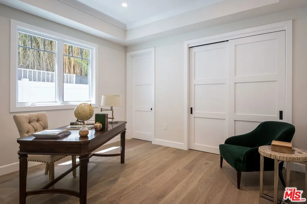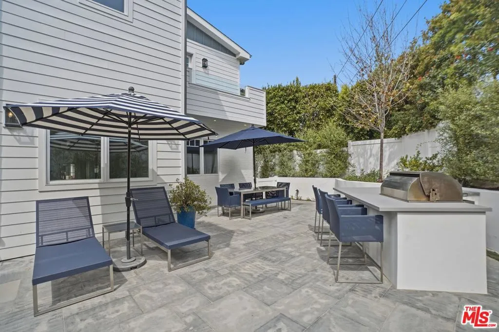 Set in the coveted El Medio Bluffs neighborhood of Pacific Palisades, 530 Arbramar Ave is a beautifully designed 2017 Cape Cod inspired coastal residence that seamlessly blends timeless charm with modern luxury. This 5-bedroom, 6-bathroom home offers an ideal layout for both everyday living and effortless entertaining. A welcoming foyer opens to a warm sitting room with a fireplace, leading into a spacious dining area perfect for gatherings. A striking glass-enclosed, temperature-controlled wine cellar adds a sophisticated focal point. The gourmet kitchen is the centerpiece of the home, featuring a large island, premium Wolf appliances, and a walk-in pantry. The adjacent family room, complete with a second fireplace and accordion-style folding glass doors, opens fully to the backyard creating a true indoor-outdoor living experience ideal for entertaining. The main level includes an en-suite bedroom, ideal for guests or multi-generational living, along with a dedicated theater room for movie nights and gatherings. Upstairs, four additional en-suite bedrooms provide comfort and privacy for all. The luxurious primary suite is a true retreat, showcasing vaulted ceilings, a fireplace, an expansive walk-in closet, and two private balconies that capture the coastal breeze. The spa-like primary bathroom offers a serene space to unwind. The backyard is thoughtfully designed for relaxation and entertaining, featuring lush turf, a fire pit, and an outdoor kitchen perfect for al fresco dining. Additional highlights include an attached two-car garage with an EV charger and direct access into the home.