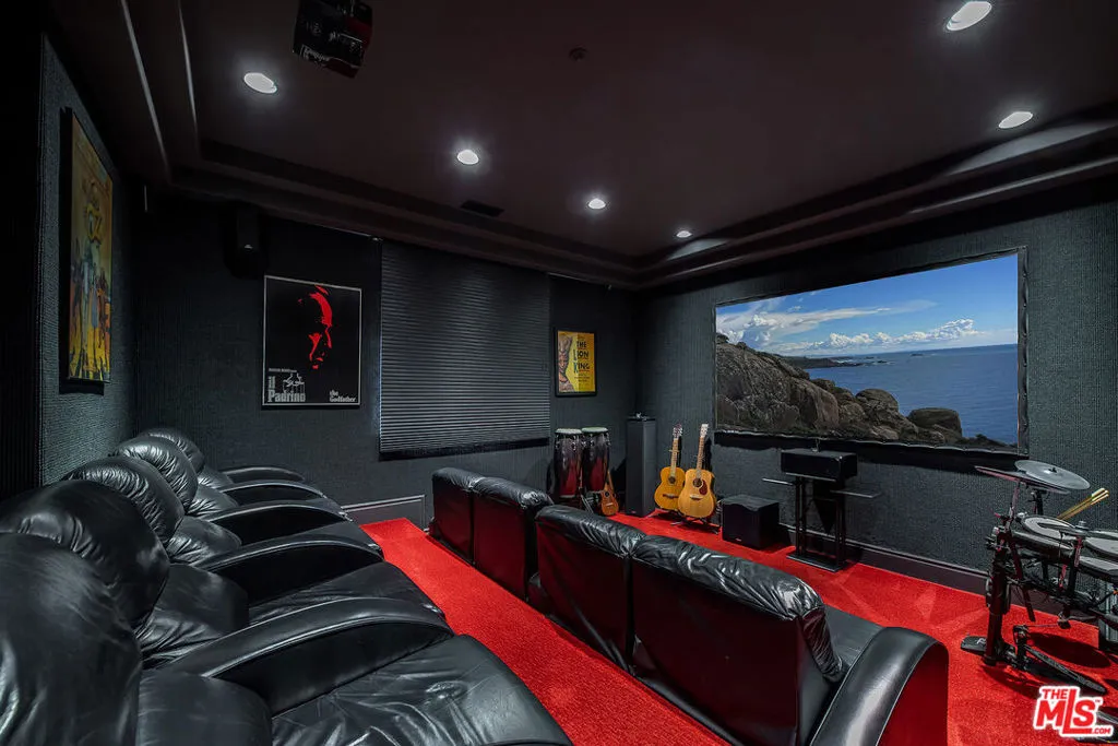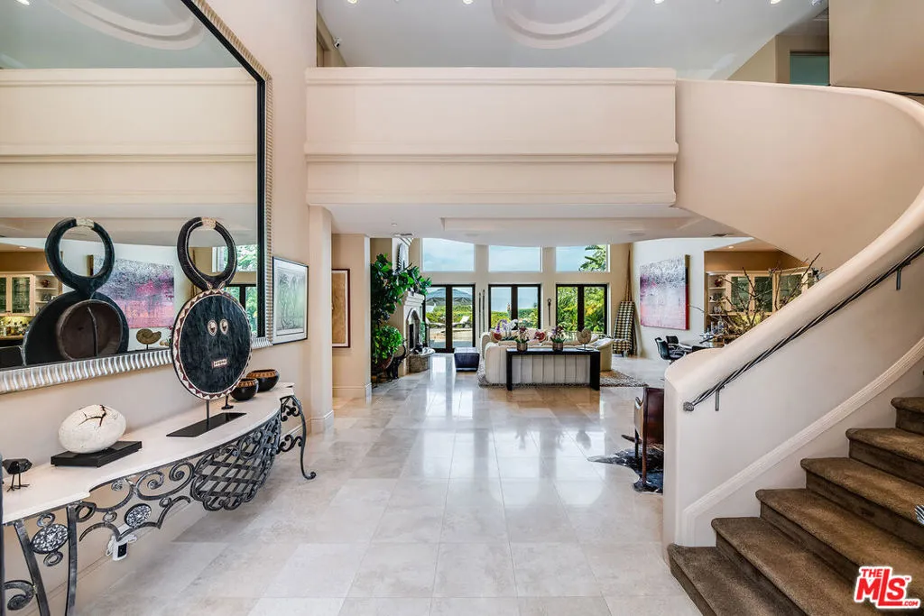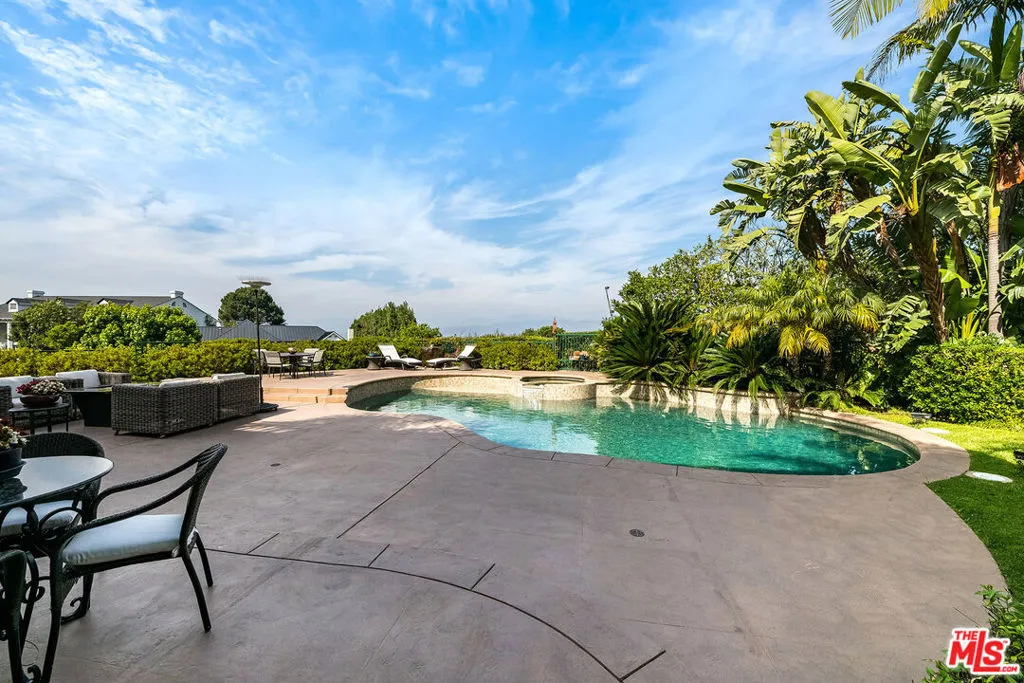Nestled in the exclusive 24-hour guard-gated enclave of The Summit above Beverly Hills, the magnificent Contemporary Villa offers the ultimate in privacy, luxury, and serenity, all just minutes from the vibrant heart of Beverly Hills and Studio City. Situated atop a small knoll at the end of a peaceful cul-de-sac on a premier corner lot, the graceful estate features spectacular city, canyon, and mountain views, providing a sense of tranquility, charm, comfort, and privacy in one of Los Angeles' most exclusive enclaves. This timeless estate spans just under 7,000 sq.ft. on an approx. 16,216 sq.ft. lot, perfectly blending modern luxury with classic architectural detail. A grand arched entry with intricate textured glass and palm frond sculpted iron double front doors open to a formal foyer with travertine floors and a sweeping curved staircase, setting the tone for the sophistication found throughout. The formal living room impresses with soaring two-story ceilings, a stately fireplace, built-in granite bar, and walls of arched windows and glass doors that flood the space with natural light and open to the backyard oasis. Every ceiling is sculptural. Heated floors in both the living room and gourmet kitchen add comfort and refinement. Art lovers will appreciate the abundant wall space and thoughtful niches throughout the home, perfect for displaying a curated collection. The large formal dining room features a long built-in buffet with cabinetry, and matching arched ceiling, ideal for elegant entertaining. The chef's kitchen featuring two clear-span curved glass windows is equipped with professional-grade appliances, a large granite center island, and an adjoining breakfast room that seamlessly flows into the inviting family room. A powder room, guest bedroom and bathroom, media/screening room, and laundry room complete the lower level. Upstairs, two spacious guest or family bedrooms each offer ensuite baths, while the expansive primary suite is a true sanctuary, complete with private balconies overlooking breathtaking vistas, massive dual custom walk-in closets, and a marble-clad bath featuring dual vanities and commodes, a soaking tub, separate steam shower, and an adjoining gym. The resort-like backyard is an entertainer's dream, with generous patio space surrounding the pool and spa, tropical-inspired landscaping, and grass area, all set against the dramatic backdrop of panoramic views. A three-car attached garage provides ample space for vehicles and storage. Offering an exceptional lifestyle in a secure, sought-after community, this remarkable estate embodies peaceful, private living with effortless access to all the best of Beverly Hills and beyond.