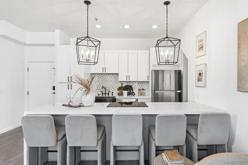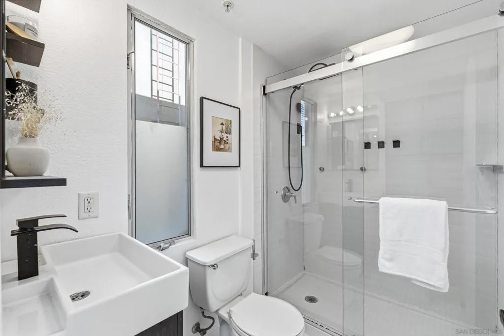 Experience iconic urban living in this beautifully renovated two-story corner loft designed by award-winning San Diego architect Jonathan Segal. Located in the sought-after Moto Villas Condos, this distinctive 1BD/1BA residence offers approximately 660 sq. ft. of thoughtfully designed living space with soaring 15–18 ft ceilings and oversized windows that flood the home with natural light. The open-concept layout blends industrial loft architecture with modern upgrades, featuring a renovated kitchen with stainless steel appliances, sleek cabinetry, and contemporary finishes. A convenient in-unit full-size washer and dryer plus added pantry storage enhance everyday functionality. Comfort is elevated with a mini-split heating and cooling system, providing efficient climate control year-round. Upstairs, the private loft bedroom opens to one of the home’s most unique features—an expansive ~150 sq. ft. private outdoor patio with a wood-burning fireplace and city views, creating an incredible extension of the living space. It’s the perfect setting for entertaining under the San Diego sky. Additional upgrades include modern bathroom fixtures, designer lighting, new concrete patio and stylish finishes throughout. Located within a gated community with one assigned parking space, this home offers privacy and convenience with one of the lowest HOAs around. Situated in vibrant Downtown East Village, just blocks from Petco Park, UCSD Extension, restaurants, coffee shops, and major freeways, this architectural loft offers the perfect blend of style, comfort, and walkable urban living.