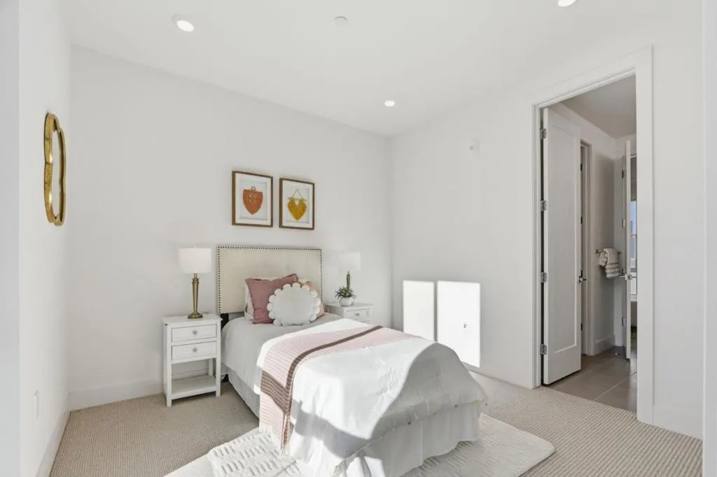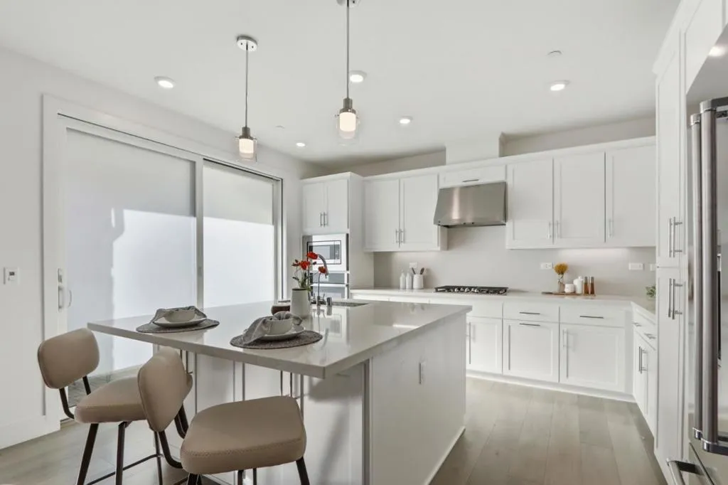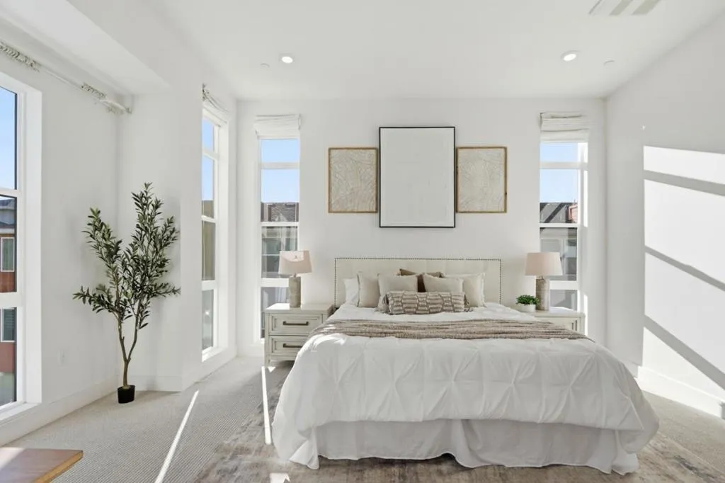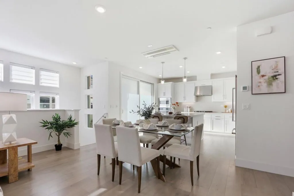 Must-see! Rarely available 3-bedroom plus den townhome in the Nuevo community, built in 2020 and offering 1,924 sq. ft. of modern living space. This stylish home features three bedrooms, a versatile den, and 2.5 baths, thoughtfully designed for both elegance and everyday functionality. The chefs kitchen shines with stainless steel appliances, quartz countertops, and shaker-style soft-close cabinetry. The spacious primary suite boasts an impressive 11-foot ceiling, a walk-in closet, and a luxurious en-suite bathroom with dual vanities and a walk-in shower. Wide-plank engineered wood flooring flows throughout, complemented by smart home features including recessed lighting. The flexible den is perfect for a home office or guest room. Residents enjoy resort-style amenities such as a playground, basketball court, dog park, and beautifully landscaped common areas. Ideally located within walking distance to Costco and Whole Foods, plus dining and entertainment at Santa Clara Square and downtown Sunnyvale. Just minutes from NVIDIA, Apple, Amazon, LinkedIn, and other major tech campuses, with easy access to major highways and the Lawrence Caltrain Station. Dont miss this rare opportunity to own a modern, low-maintenance home in the heart of Silicon Valley!