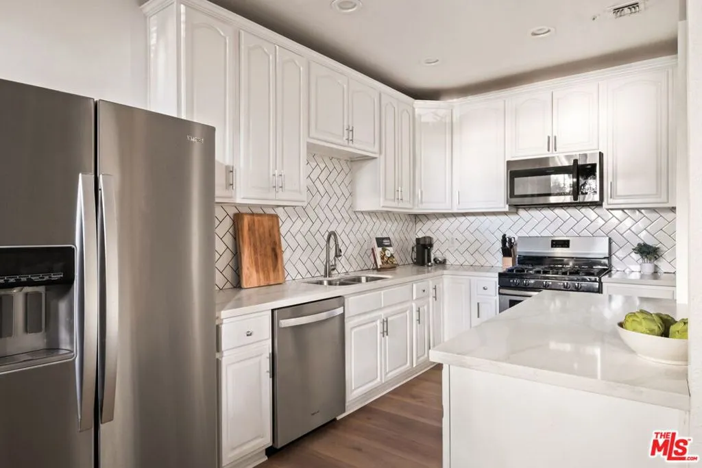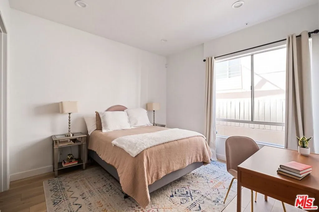 Welcome to this beautifully updated corner rear 2-bedroom, 2-bathroom condo just moments from Hancock Park and Larchmont Village, offering 1,180 SF of bright, open living. The thoughtfully designed layout connects the living, dining, and kitchen areas, creating a space that feels open and inviting. Large windows and sliding glass doors bring in natural light and open to a private patio, enhancing the indoor-outdoor flow. Elevated above street level, the unit offers added privacy while still maintaining convenient access. The kitchen is clean and modern, featuring quartz countertops, a herringbone backsplash, stainless steel appliances, and bar seating ideal for casual dining and entertaining, plus a built-in desk for a convenient work-from-home setup. Both bedrooms are generously sized with walk-in closets, and the primary suite offers direct patio access and an en-suite bathroom with dual vanities, a soaking tub, and a separate shower. Additional features include a dedicated laundry room with storage, new flooring throughout, recessed lighting, a decorative fireplace, and a new HVAC system. The secure building offers gated parking with two tandem spaces and guest parking. A well-designed, move-in-ready home in a central, highly desirable location.