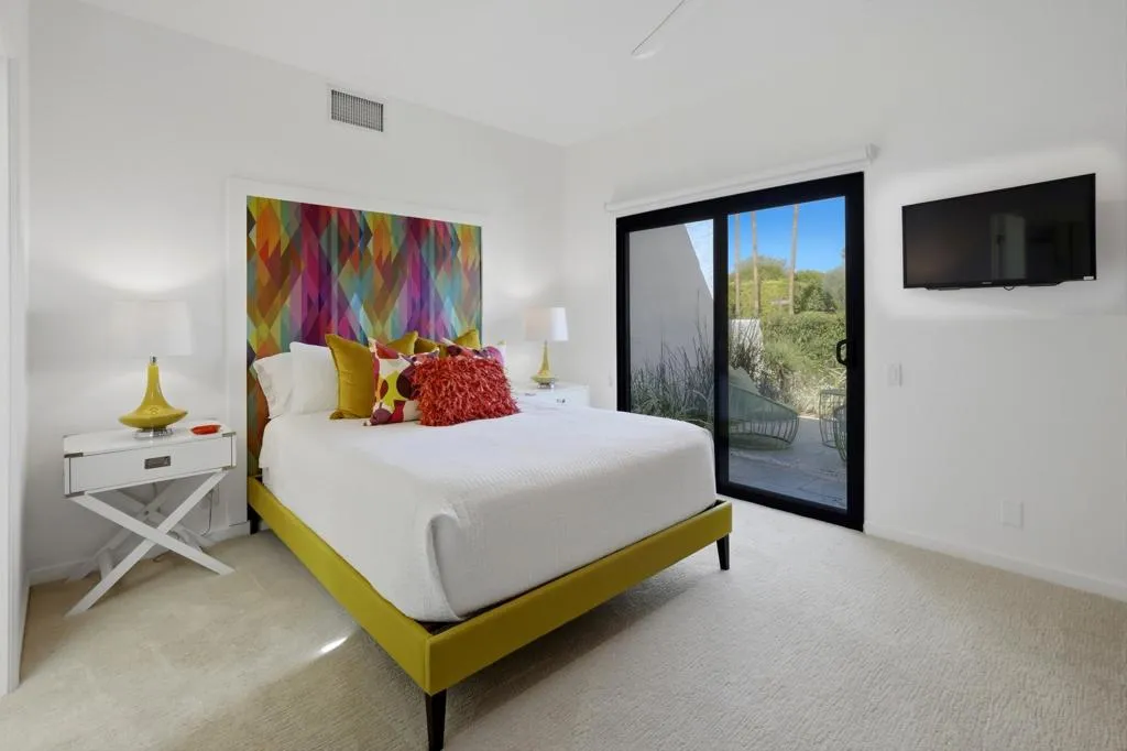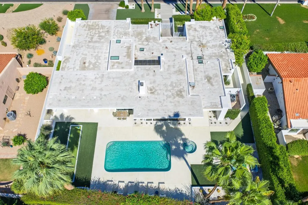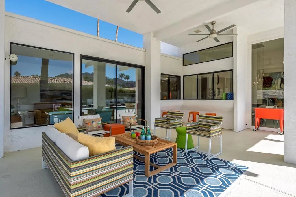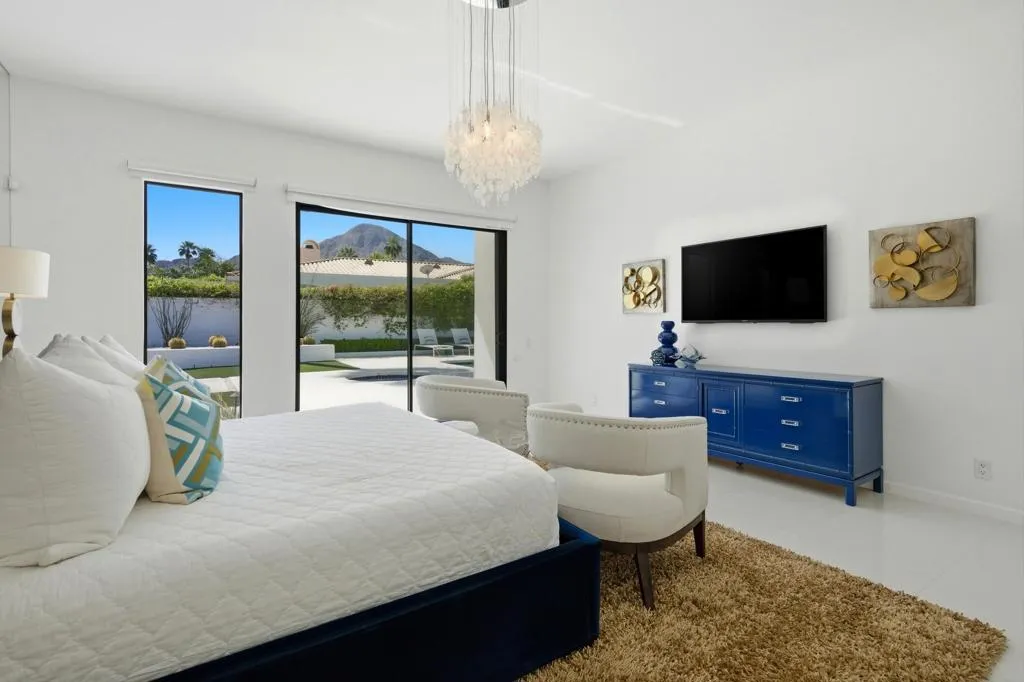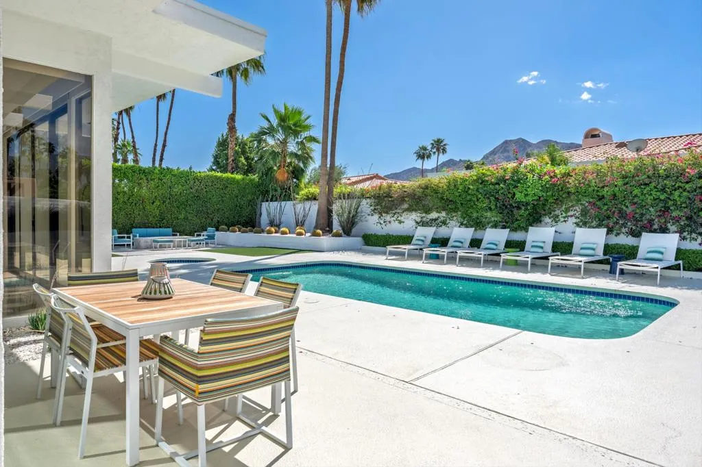 Step into iconic desert living with this stunning Mid-Century inspired remodel in coveted Indian Wells--where design, luxury, and lifestyle converge.Spanning approximately 3,100 square feet, this professionally designed showpiece offers three vibrant and luxurious ensuite bedrooms, each thoughtfully curated with bold character and elevated finishes. The open-concept floor plan seamlessly connects the living room, dining area, family room, and stylish bar--perfect for both entertaining and relaxed everyday living. A gourmet kitchen anchors the space, while the living room showcases dramatic floor-to-ceiling views that bring the outdoors in.The south-facing backyard is a true desert retreat, featuring a sparkling pool with all-day sun exposure and peek-a-boo views of the Santa Rosa Mountains. Enjoy resort-style amenities including a covered patio for shaded lounging, a built-in BBQ area, sleek glass fire feature, and a bocce ball court--all surrounded by beautifully reimagined landscaping.The spacious primary suite is a private sanctuary, complete with a spa-inspired bath featuring a soaking tub, oversized walk-in shower with penny tile accents, and an open-air outdoor shower for a true indoor-outdoor experience.Additional highlights include a two-car garage with a third golf cart bay and a designer furniture package included for a fully turnkey opportunity. A rare blend of style, comfort, and sophistication--this is desert living at its finest.
