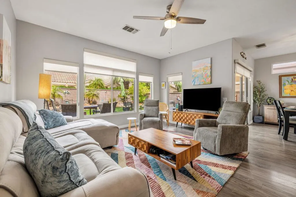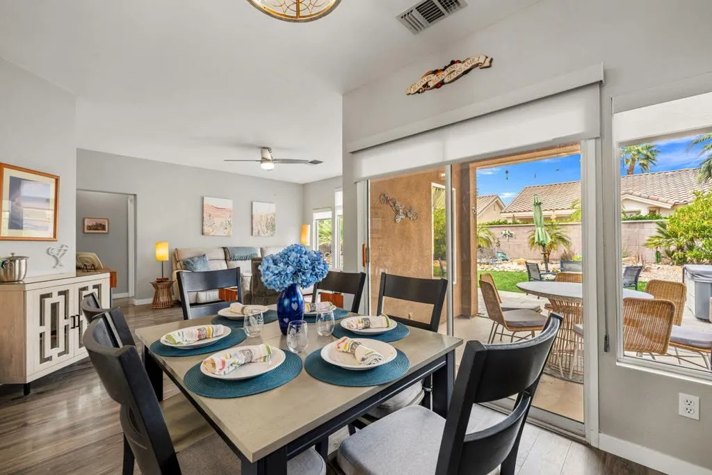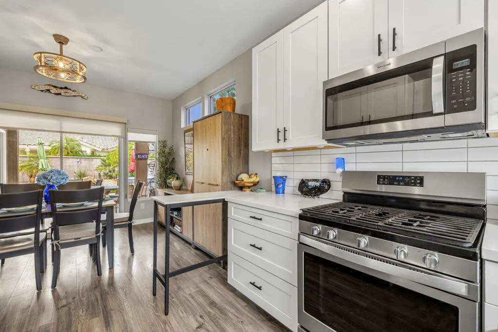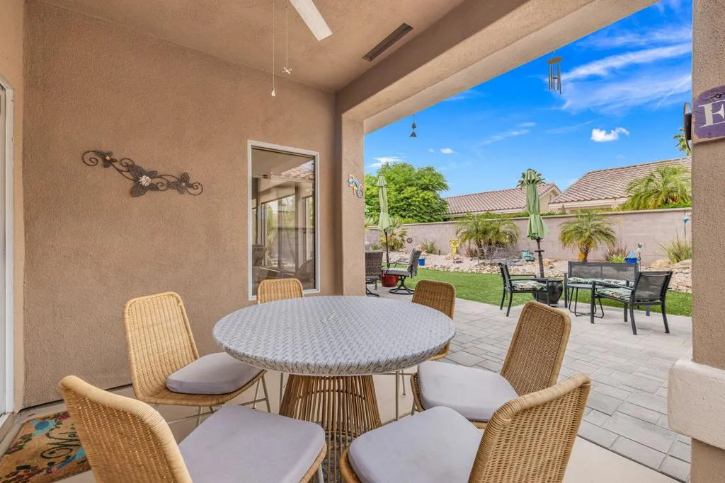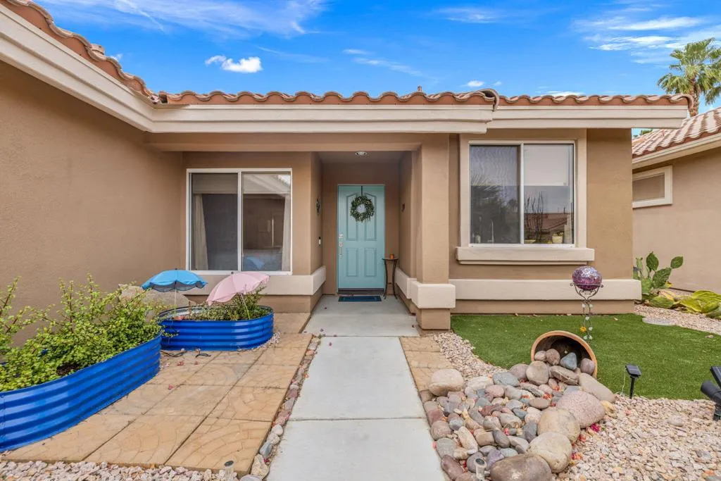 Located in the best 55+community in the valley, Sun City Palm Desert, this adorable Limoges model is a community favorite. This beautifully renovated home has great curb appeal, with new contemporary exterior paint and beautiful desert landscaping. The kitchen has been totally remodeled with quartz counters, subway tile backsplash, new white cabinets with hardware, stainless steel appliances, and recessed can lights. It opens to the dining and living rooms, and all rooms have a view of the large, manicured, cool, north-facing back yard. The HVAC system was installed in 2015. The interior doors and hardware were upgraded, and they look great. You'll love the fabulous wood-look laminate flooring throughout. The master bedroom has a large view window, a new fan/light, and roll-down shades. The bathroom is remodeled with a walk-in closet, quartz counters, new white cabinets and hardware, a gorgeous custom tile shower, and a new highboy toilet. The guest bedroom is inviting, and it has views of the lushly landscaped front yard. The guest bath is upgraded and is adjacent to the guest bedroom. The 2-car garage has a newer washer and dryer, which are included. The large backyard is landscaped perfectly and has an above-ground hot tub for those perfect stargazing evenings. This home stands out in every way and is move-in ready. Come see it, you'll fall in love with your new desert retreat. SUN CITY PALM DESERT IS ALL ABOUT LIFESTYLE!! It has many clubs, activities, amenities, and low HOA dues. Play at 2 championship 18-hole golf courses and practice facilities, pickle ball, tennis, softball, bocci ball, an 18-hole miniature golf course, an honor library, arts and crafts, a ballroom for special entertainment, and 4 saltwater pools kept at 87 degrees with hot tubs. Enjoy 2 great restaurants, a martini/coffee bar, and even a post office. There is a newly renovated, classy indoor/outdoor bar with fire tables to enjoy the awesome views and our beautiful desert weather.