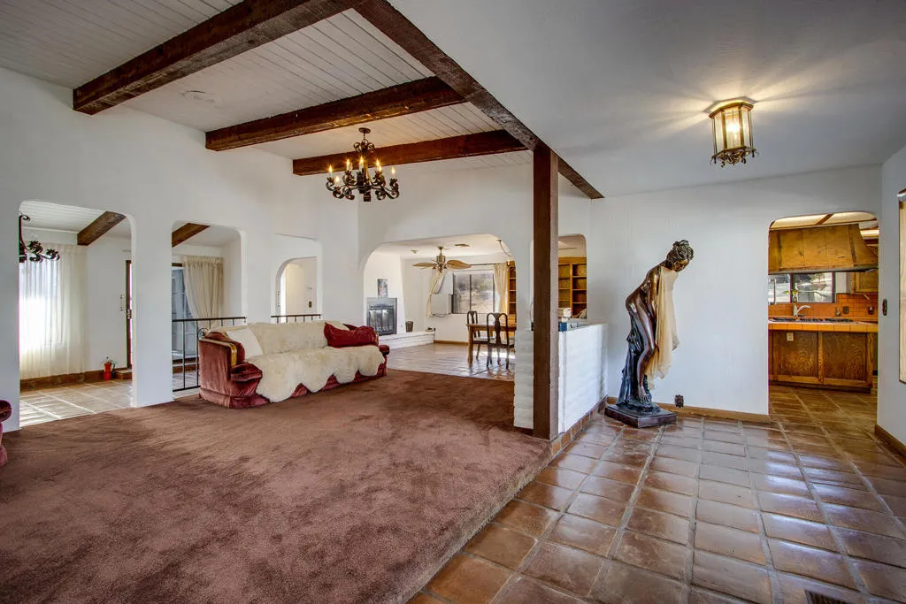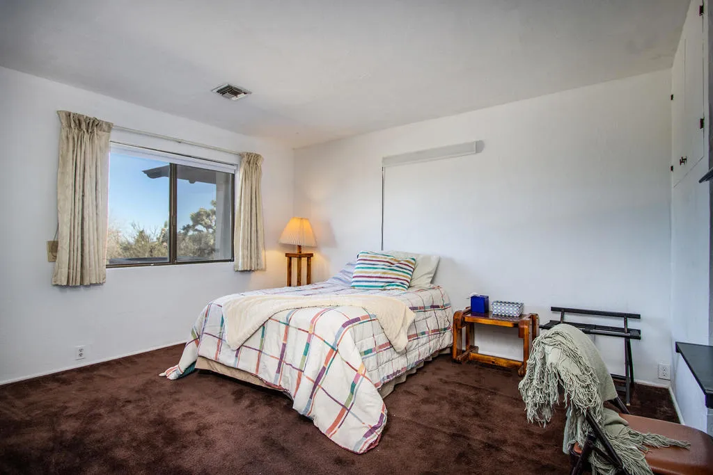 Expansive 2,880sf Spanish Colonial home on a large .48 acre lot in the coveted upper Story Park neighborhood of Yucca Valley. 3 beds, 2.75 baths. Perched in the foothills. This area possesses the most unique & captivating Joshua Trees in the Morongo Basin. Truly inspiring. Set back high on a light slope. Arched entryway with tile, beams, & ornate iron fence terrace. Front door opens to the grand living room with attached sunroom, dining room, & Spanish tile entryway. Brick fireplace & hearth. Beamed ceilings with iron chandelier. Drapes & sun blocker shades. Central heating/AC. Spacious island kitchen, ample cupboards, 6 burner stove, 2 ovens with centerpiece vent hood, refrigerator, microwave, dishwasher, long counters, & an additional back counter with sink for a wet bar. Formal dining area with fireplace & hearth. Traditional private courtyard patio with glass sliders. Master suite with vanity area, bathroom with shower over tub, changing room & inground hot tub room. 2 bedrooms with shared bathroom. Attached 2 car garage with 3 big closets, laundry, & plenty of storage space along with separate storage in the backyard. Wide paved driveway & a secondary driveway. Partially fenced backyard & patio area. Close to many hiking trails. Close to all amenities. Yucca Valley is experiencing a renaissance with new restaurants, shops, grocery stores & bars. About 12 miles to the Joshua Tree National Monument where around 3 million tourists visit annually. 29 miles to Palm Springs.