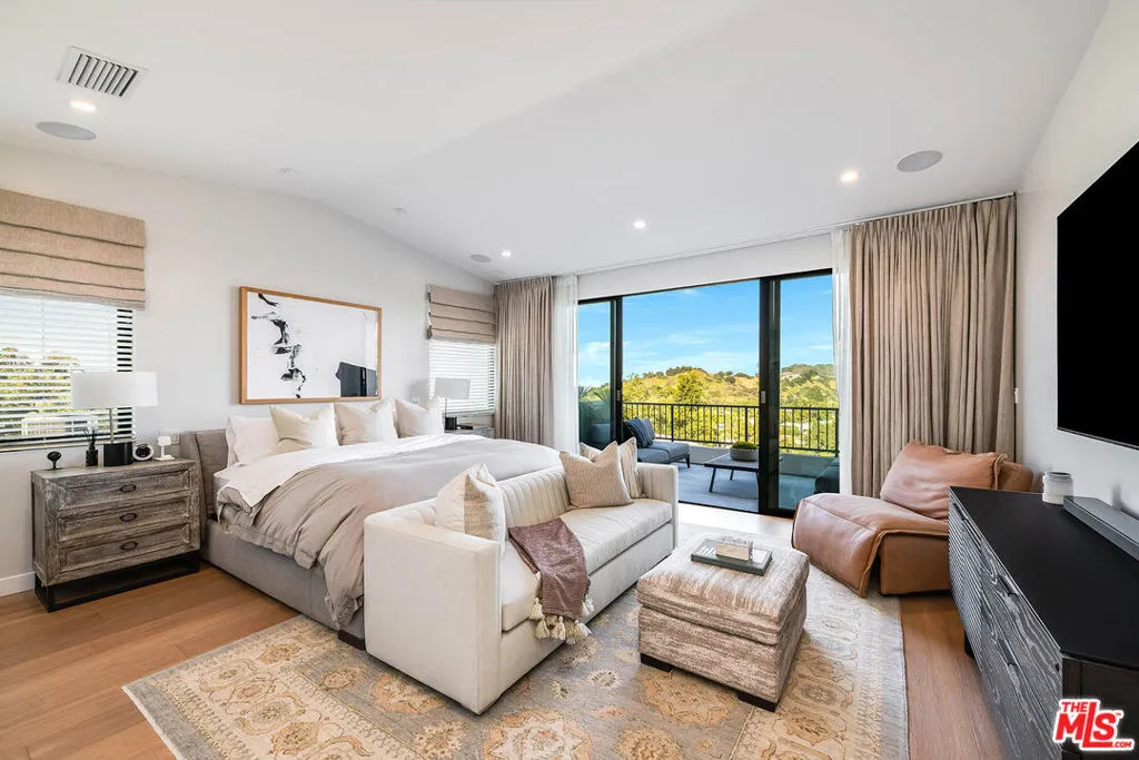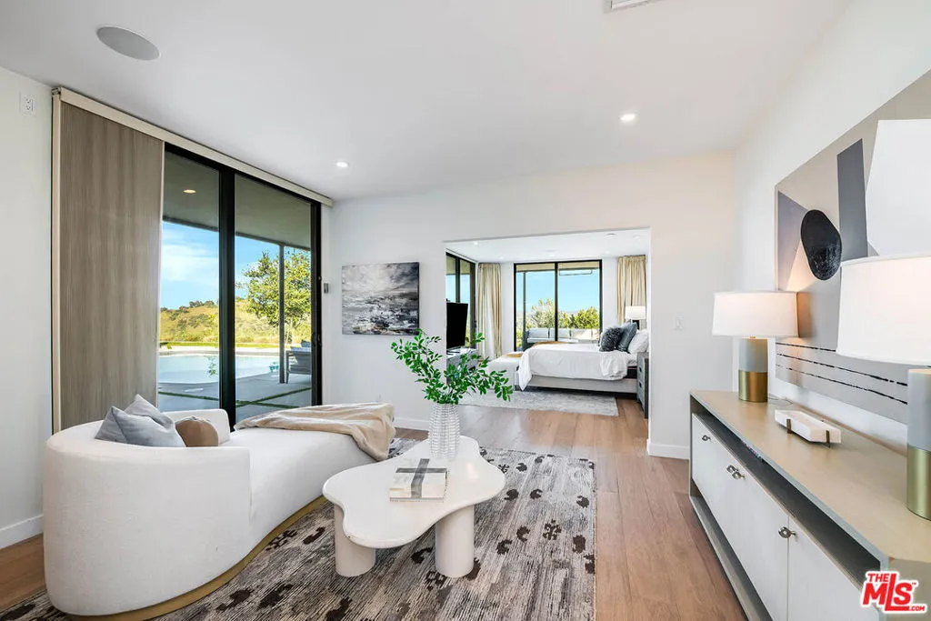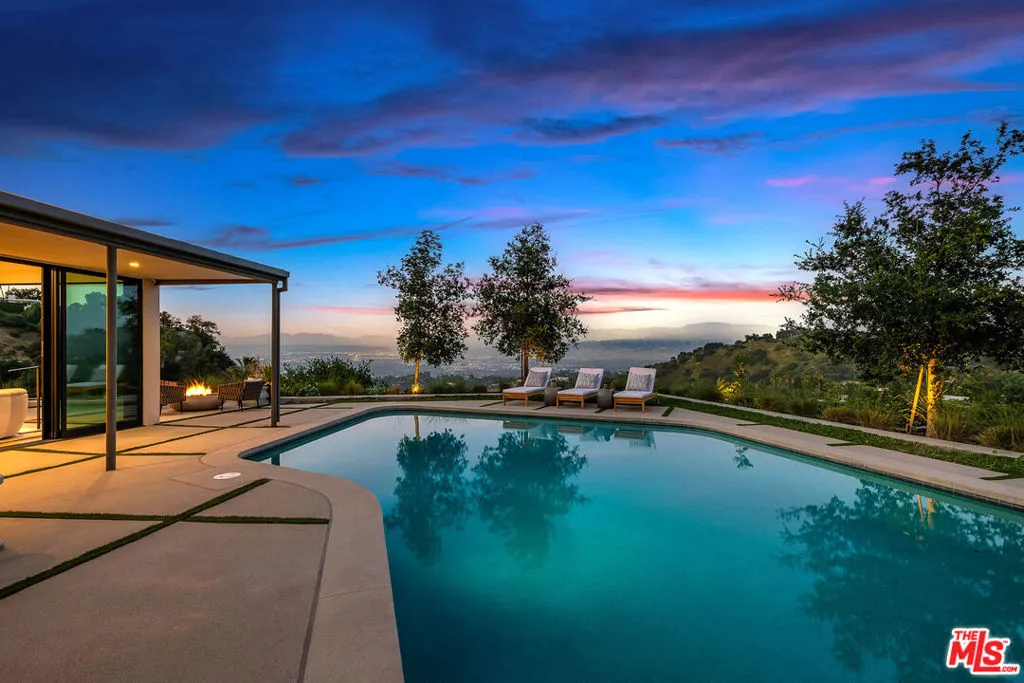 ELEVATED LUXURY WITH SWEEPING PANORAMIC VIEWS. Upon entry, the residence reveals a breathtaking skyline stretching from downtown Los Angeles across the San Fernando Valley to the distant mountains beyond. Walls of Fleetwood glass invite an abundance of natural light, guiding the eye toward vistas that define each living space. The interiors transition with ease and intention. In the great room, the city unfolds as a living backdrop. Just beyond, the pool terrace offers a serene escape, ideal for sunlit mornings or evenings illuminated by the shimmer of city lights. The kitchen serves as both a striking centerpiece and a natural gathering place. European cabinetry, beveled Dekton Rem surfaces, and a full suite of Miele appliances create an environment equally suited for entertaining or everyday living. Every element has been thoughtfully curated. Two primary suites provide a true five-star experience, each opening to a private terrace for quiet sunrise or sunset moments. Spa-inspired baths by Porcelanosa feature glass-enclosed showers, soaking tubs, and expansive walk-in closets, completing the sense of refined retreat. A private theater and integrated smart home system enhance both comfort and convenience. Set on a promontory at the end of a tranquil cul-de-sac, the property offers exceptional privacy while remaining just minutes from Beverly Hills, the Valley, and downtown Los Angeles. Here, each day begins and concludes with extraordinary views and an effortless, elevated lifestyle.
