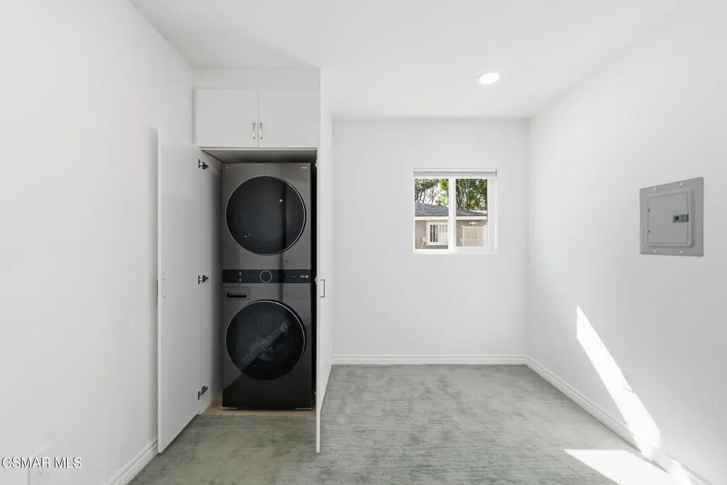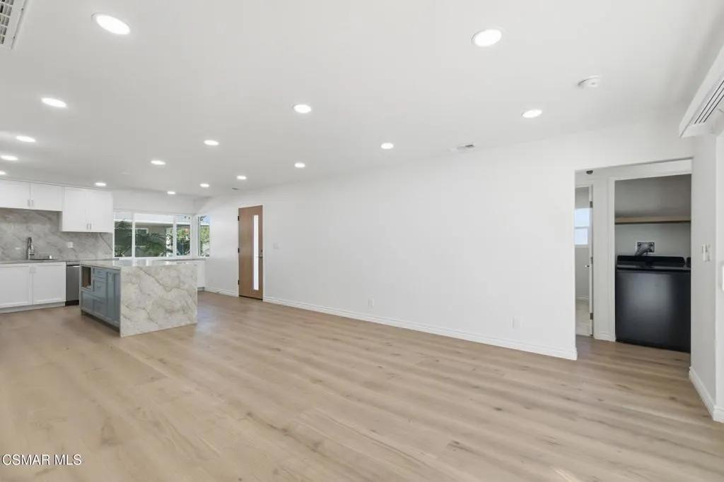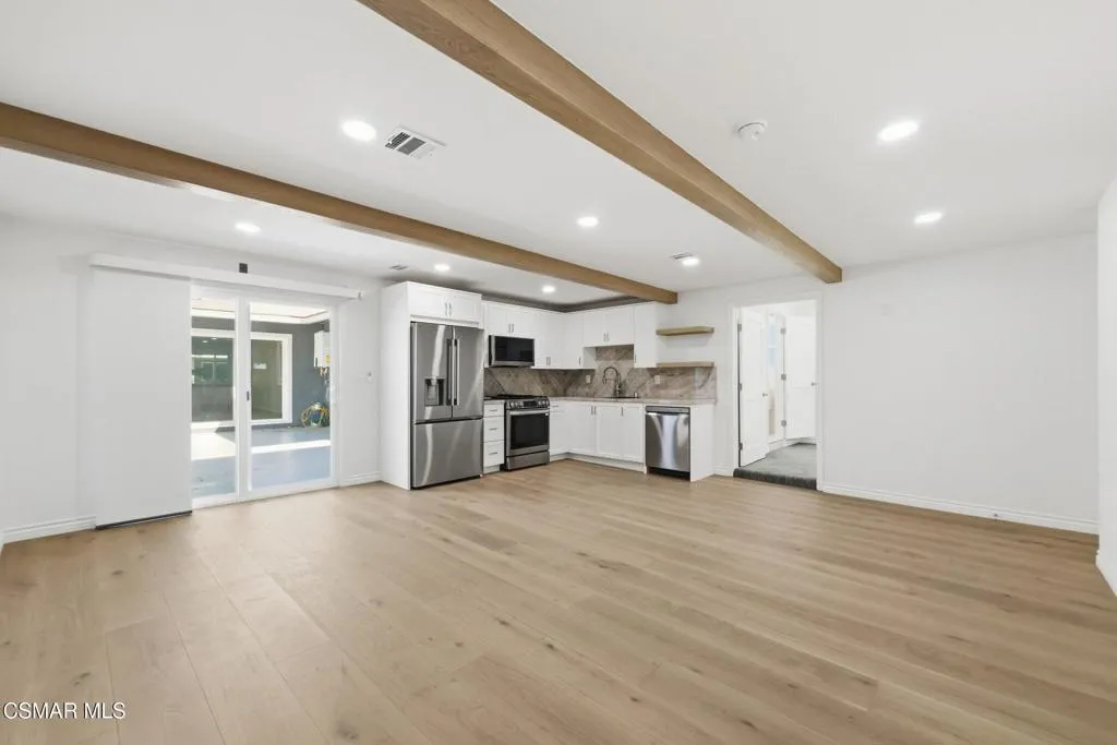 Deluxe Single-Level End-Unit with additional Kitchen/ living room added in the garage! Welcome to this rare offering of two freshly renovated, single-level end-unit condo with two private entries, 2 kitchens, dual heating and air, dual laundry, and 2 bathrooms. Thoughtfully designed with spectacular open floor plans, this residences features expansive living spaces filled with natural light. The main kitchen is a showpiece, boasting a massive quartz island, all-new cabinetry, top-of-the-line appliances, and a walk-in pantry. It flows seamlessly into the spacious living room perfect for entertaining. The main bathroom is a true retreat, complete with a large double vanity, light-up mirror, frameless walk-in shower, and rain shower head with handheld wand. Two additional spacious bedrooms complete this side of the home. The second kitchen offers ample counter space, quartz countertops, a large single-basin sink, and new appliances. It opens to its own generous living area and includes a beautifully remodeled bathroom with a walk-in shower and rain shower head/wand, plus two more bedrooms and a personal stackable laundry. Additional highlights include: All-new flooring throughout Custom blinds, including automatic sliding blinds for the sliding glass doors, fresh paint, updated lighting, and modern plumbing fixtures Enjoy resort-style amenities with a community pool, clubhouse, and 9-hole golf course. All of this, just minutes from shopping, Ventura Harbor, and the beach!