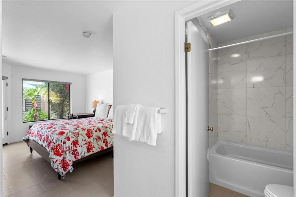 Beautifully maintained, this is the one you've been waiting for - a private, green-belt setting designed for outdoor living! This residence is nestled on a park-like oasis with a pool and hot tub nearby! As you enter through a pristine courtyard with a resort vibe, pause to enjoy the serenity of your desert hideaway! This beautiful patio, complete with mountain views, will quickly become your favorite ''room'' in the house! Inside, soaring ceilings, a cozy fireplace and bar, custom blinds and neutral, easy-care flooring will enchant you. The kitchen features newer wood cabinets, light granite countertops, and updated lighting. The primary and guest bedrooms each feature en suite baths with updated decor. The baths have ben extensively renovated with granite countertops, new cabinetry, and contemporary lighting. The casita has been styled with comfort in mind, and gives your guests enviable privacy. The serene front courtyard is a perfect spot to gather with friends, practice putting, or just recharge under the desert skies! In this serene oasis, you and your guests will enjoy 10 pools and 3 tennis courts, and the proximity to the famous La Quinta Resort and Old Town La Quinta. This wonderful home is the perfect canvas on which to paint your own desert dream - come find your place in the sun!