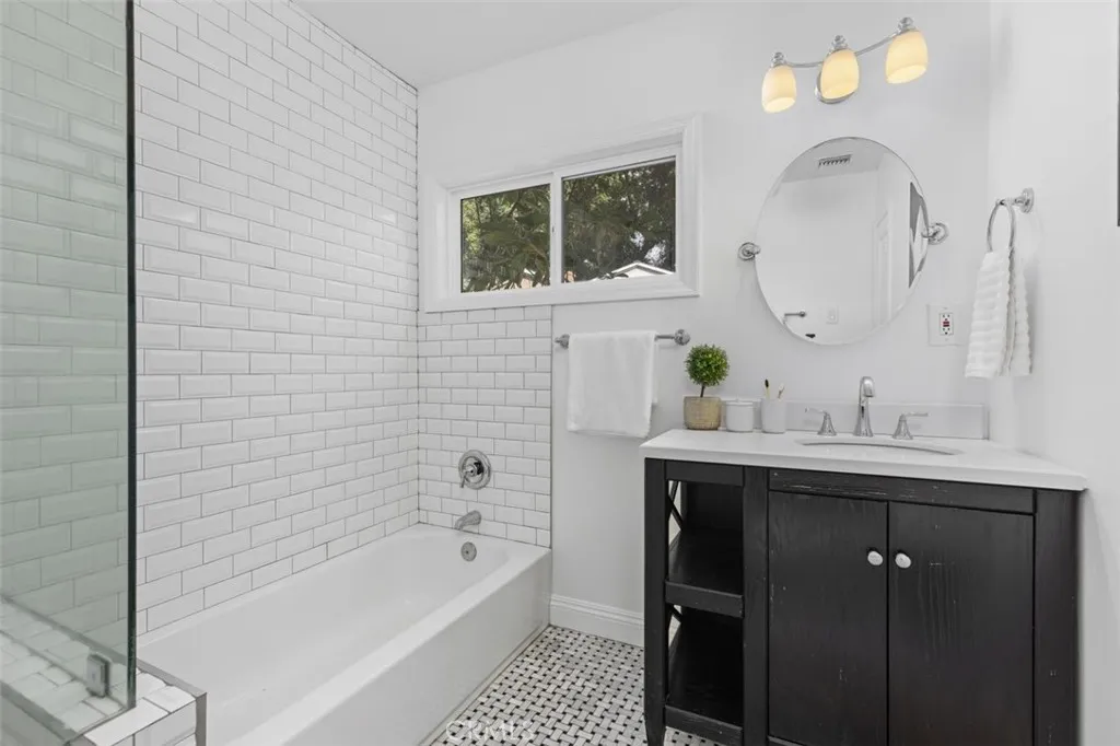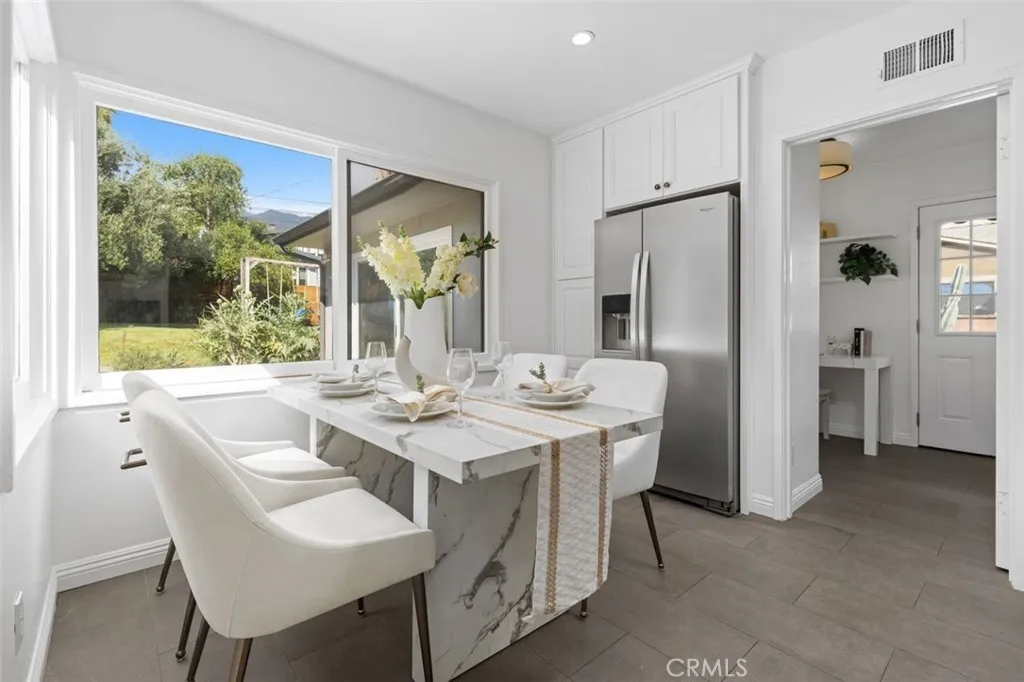 This wonderful mid-century ranch-style house, full of natural light, is perched on a large lot at the end of a quiet cul-de-sac. Step inside through the keyless entry to encounter a bright, open living area that flows seamlessly into an updated kitchen with quartz countertops and brand new, just-installed appliances. The light-filled kitchen is large enough for a dining table overlooking the lush backyard. A bonus room next to the kitchen was updated with custom white wood cabinetry and can be used as a small office and laundry room. The living area opens onto the large patio, inviting you to enjoy indoor-outdoor living. An expansive backyard offers multiple bountiful fruit trees, plus plenty of space for play or entertaining. The primary bedroom, tucked away for quiet relaxation, boasts just-installed carpeting, a vaulted ceiling, sliding glass doors, a walk in-closet, and a full bathroom. Two additional bedrooms are generously sized with ample closet space. Christmas Tree Lane is at the end of the street where you can enjoy the year-end wonder of lights strung across century-old cedar trees. This home is fully remediated and all houses on the street were untouched. Relax on the front porch swing while you enjoy life and tranquility in beautiful Altadena!