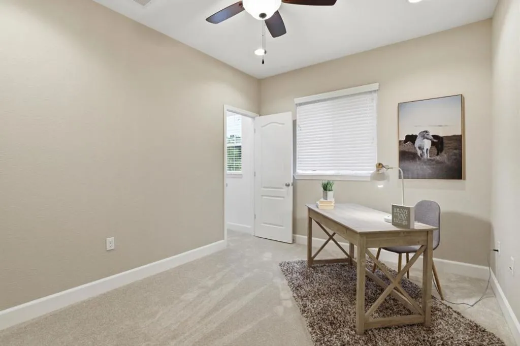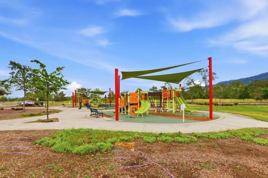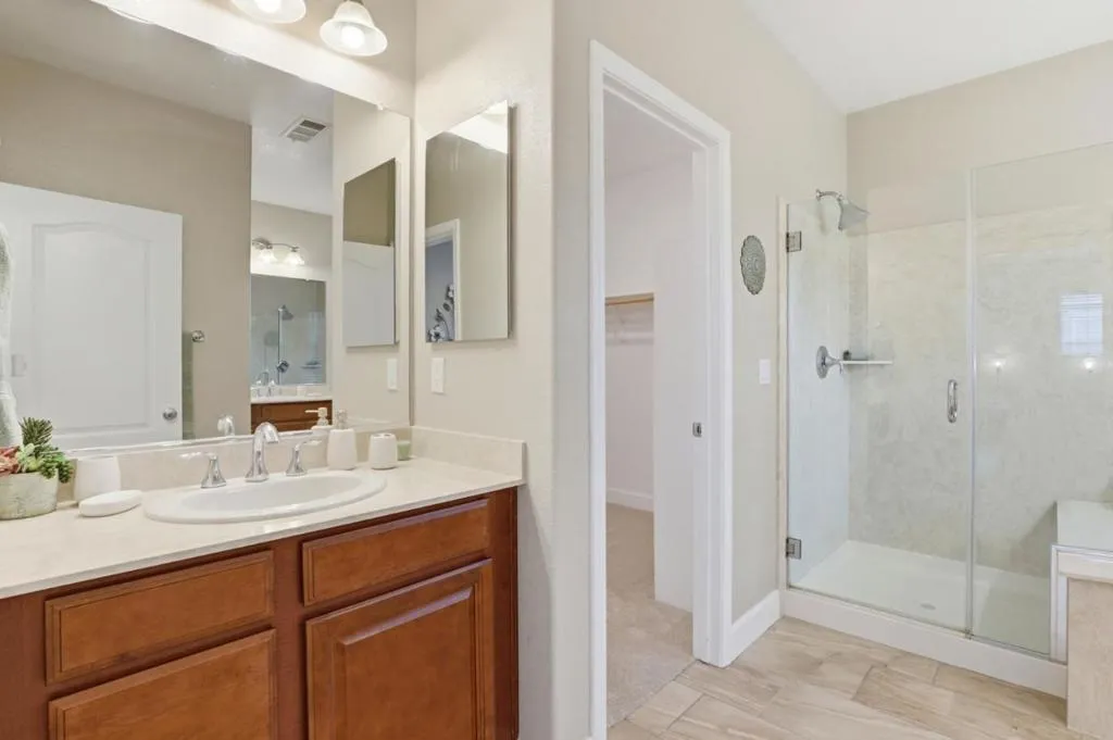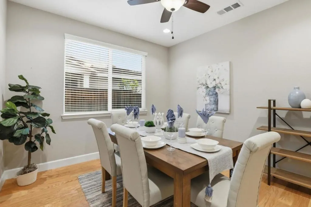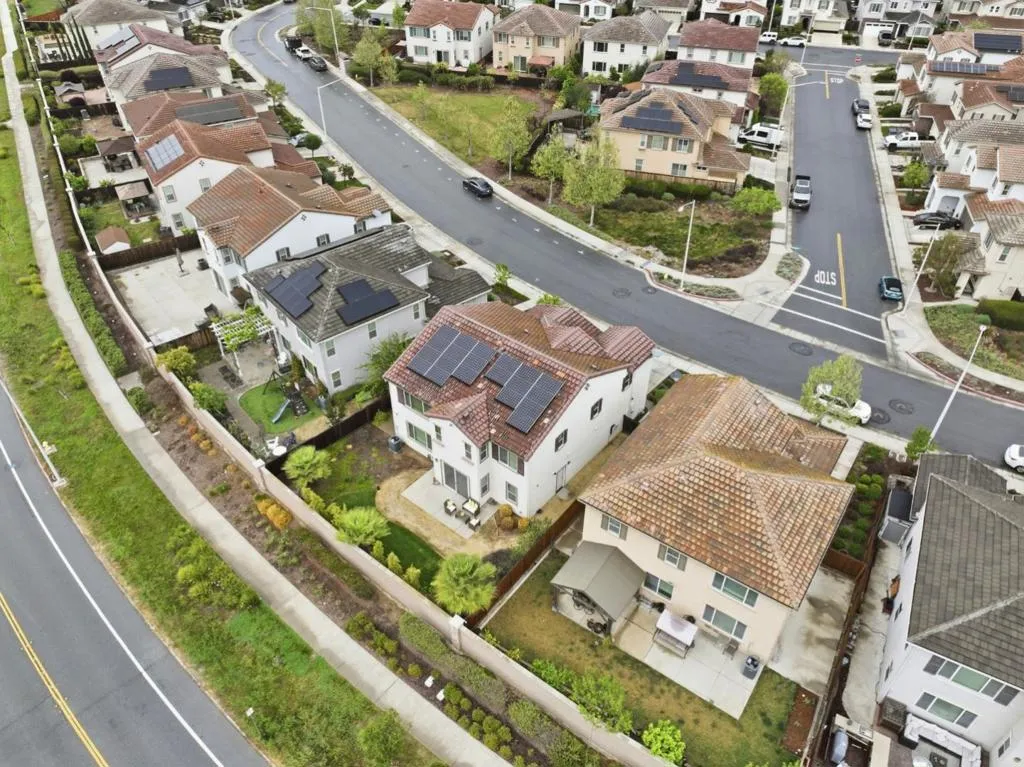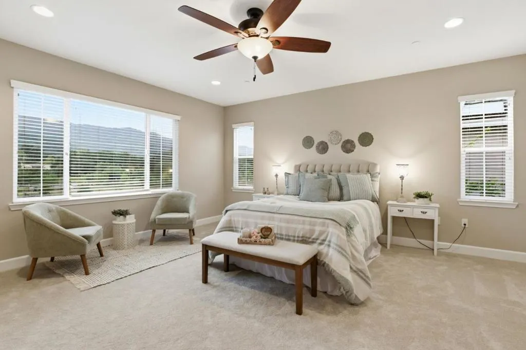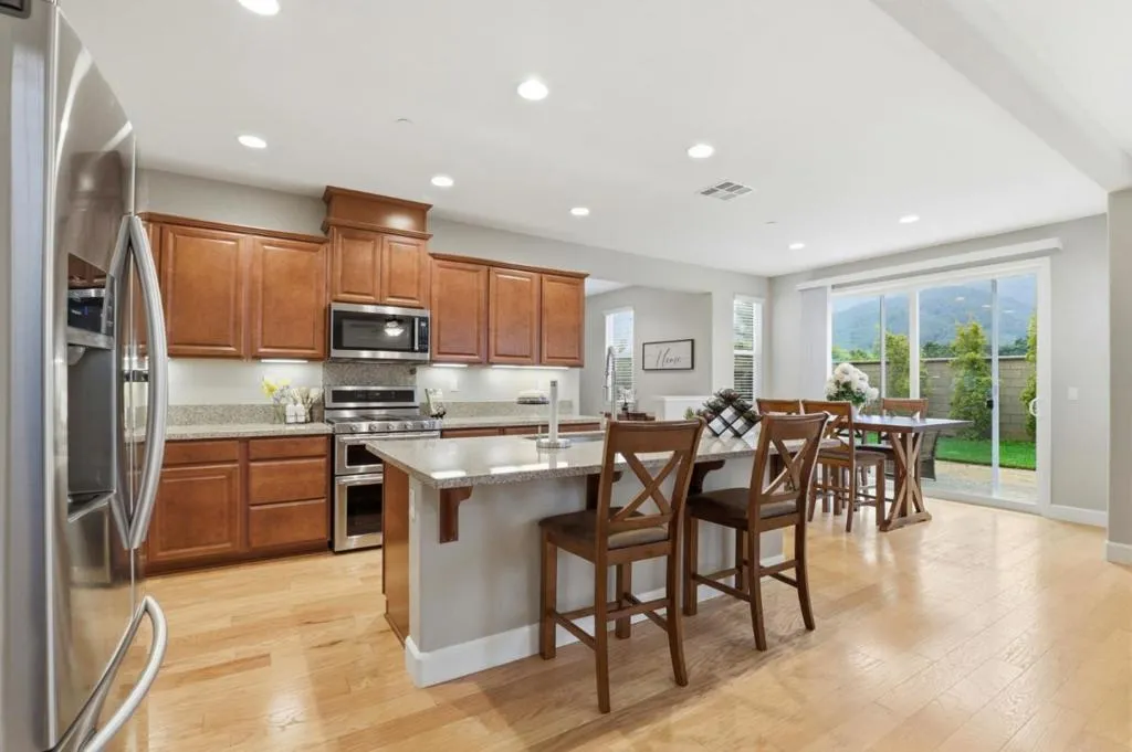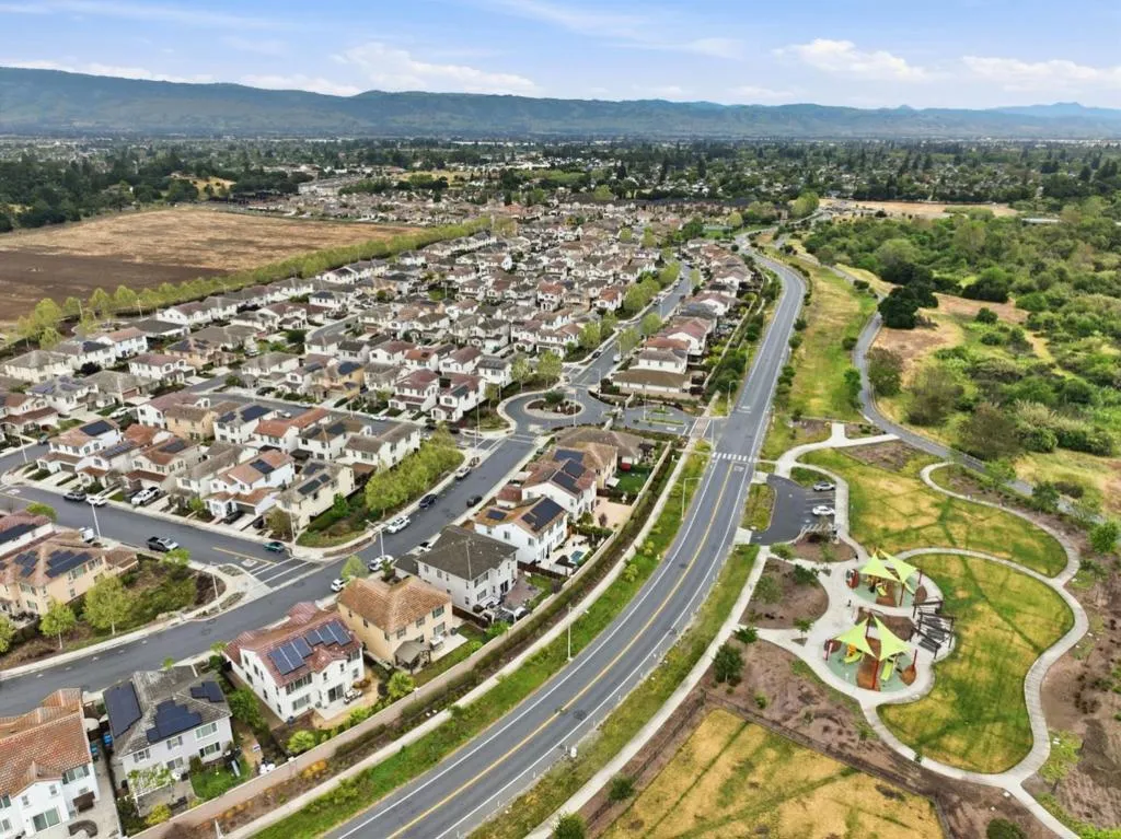 Welcome to this stunning home in the prestigious Heartland. This luxurious home offers red oak hardwood flooring on the main level and a first floor bedroom with en suite bathroom. The kitchen is adorned with sunset gold granite countertops and cognac-stained cabinets, a center island with seating, a large walk in pantry, separate dining area, and upgraded stainless steel appliances including a dual oven range A separate formal dining room with upgraded glass French doors can also be used as a den. Boasting five bedrooms and four and a half bathrooms, the upstairs layout includes a grand primary suite with large walk-in closet and bathroom with Venetian marble in Milano beige, dual sinks, glass enclosed shower and Jacuzzi soaking tub, three additional bedrooms and two bathrooms, new carpeting throughout and a bonus loft area perfect for a family room, office or game area. Other amenities include a three bay tandem garage with level 2 Tesla Universal Charger, dual zone central heating and air, ceiling fans, and owned solar. The exterior features a landscaped backyard with concrete patio and gas line for outdoor BBQ. This gorgeous home sits on a premium lot with breathtaking views of Ousley Canyon and is located across from the Uvas Creek Levee Trail and Hecker Pass park.