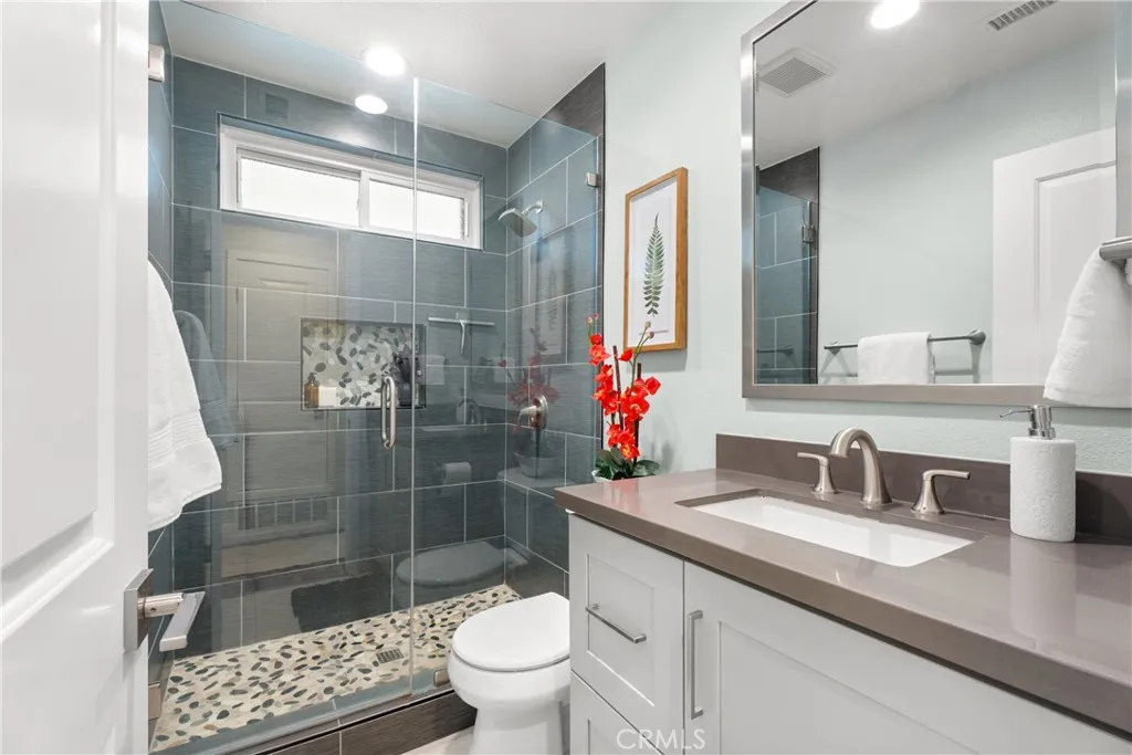 Absolutely stunning oasis on a quiet 40 foot RV access corner lot in a prime location. Entertainers delight. You will fall in love! Upon entering, you are welcomed into a grand foyer with soaring ceilings and an abundance of natural light. The open-concept floor plan seamlessly connects the living, dining, and kitchen areas, creating a harmonious flow throughout the home. The heart of the home is the chef's kitchen, boasting high-end stainless steel appliances, custom cabinetry, quartz countertops, and a spacious island with bar seating. Overlooking the pool make this kitchen as functional as it is beautiful. Whether you're preparing a casual meal or entertaining guests, this kitchen is equipped to handle it all. The primary suite is a sanctuary of luxury, featuring a spacious layout, private access overlooking the pool, and a spa-like en-suite bathroom. The master bath includes a walk-in shower, custom vanity, and a large closet. Additional bedrooms are generously sized, each with its own unique charm and ample closet space. The home's bathrooms are equally impressive, with high-end fixtures, custom tile work, and modern finishes. Step into the backyard, where an entertainer's paradise awaits. The sparkling salt water pool, spa, slide, and waterfall is surrounded by lush greenery, king palm trees, and custom stonework that is perfect for both relaxation and recreation. An adjacent spa offers a tranquil retreat, while the covered patio with built-in BBQ and outdoor kitchen is ideal for hosting gatherings. Gorgeous outdoor kitchen that has a sunken bar with a sink, beer tap, Bull BBQ rotisserie, & fridge. Huge aluminum covered patio with insulation. Stamped colored concrete that exudes luxury. Some of the amazing upgrades include New windows, sliders, skylights, A/C split system, New gates, Tankless water heater, custom block wall, and custom lighting through out. Energy-efficient windows, central heating and cooling, and top-of-the-line security systems ensure peace of mind and year-round comfort. 2-Car attached garage with a custom African Mahogany garage door. Garage has two closets, drywall, custom lighting, quartz counters, New cabinets, Sink, & private access to storage above ceiling. Private 40 foot RV access parking with custom gate. Top rated private and public schools. Located just moments from the pristine beaches of Huntington Beach. Discover the epitome of luxury living where every day feels like a vacation!