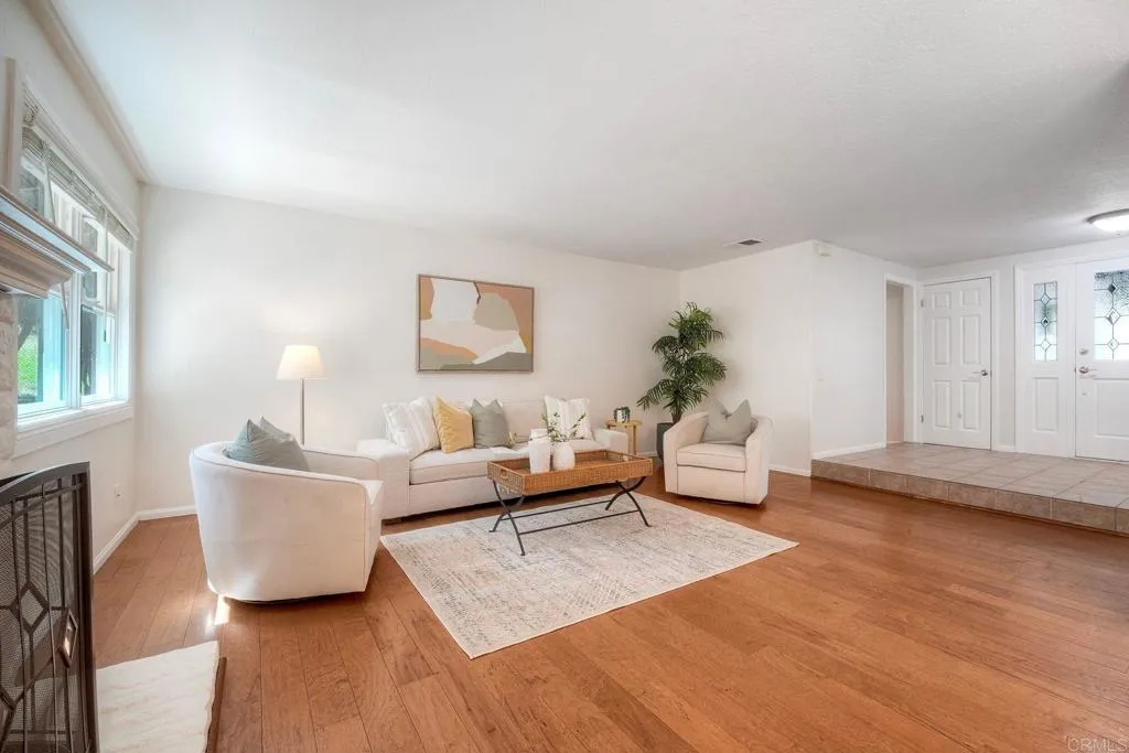 Set on nearly one acre in the quiet rural setting of Fallbrook, this SINGLE-STORY retreat offers a rare blend of privacy, space, and serene natural beauty. Framed by mature citrus trees and lush greenery, the property invites a tranquil lifestyle with picturesque views from nearly every window. A welcoming front porch sets the tone, leading into an airy interior where generous living spaces are designed for both comfort and connection. The open-concept family room and kitchen flow seamlessly to a beautifully finished paver patio with a pergola—ideal for effortless indoor-outdoor entertaining. Two fireplaces, located in the family and living rooms, add warmth and charm, while the adjacent dining area opens to an additional patio for expanded gathering space. Down the hall, three spacious bedrooms provide peaceful retreats, each filled with natural light and garden-like views. The oversized primary suite features a walk-in closet, a versatile nook perfect for a reading lounge or home office and direct access to a private patio. The ensuite bath offers dual sinks and a step-in shower, creating a comfortable and functional space. Outdoors, thoughtfully designed hardscaping with pavers and pathways surrounds the home, while a charming white fence frames the citrus orchard in the front yard. The expansive backyard offers endless possibilities—whether hosting gatherings, cultivating a garden, or creating additional terraced retreats. Enjoy the quiet ambiance of rural living with the convenience of nearby amenities just minutes away, making this Fallbrook property a truly special place to call home.