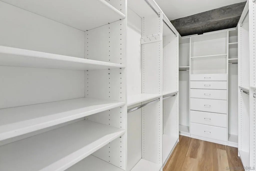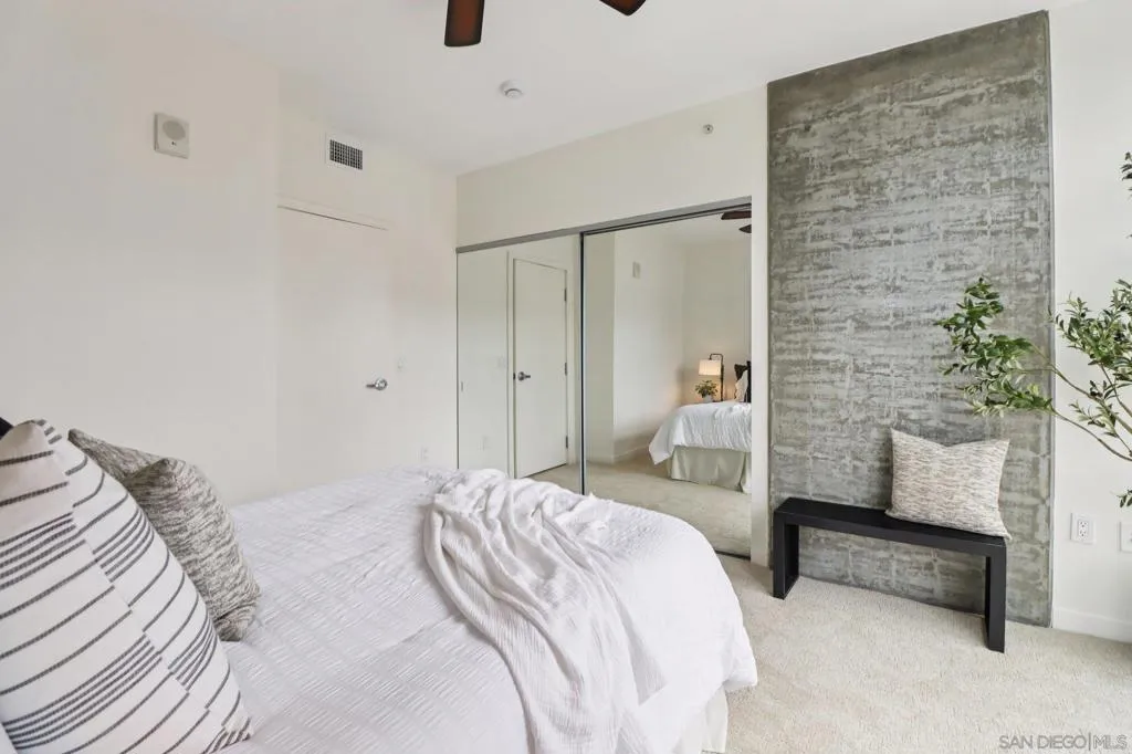 Experience elevated urban living at The Mark in Downtown San Diego’s vibrant East Village. This spacious 2-bedroom, 2-bath residence offers approximately 1,228 sq ft of thoughtfully designed living space, blending modern upgrades with striking architectural elements. An ideal split-bedroom floor plan ensures privacy, with both bedrooms and bathrooms offering generous space and comfort. Inside, an open-concept layout unfolds with floor-to-ceiling windows that flood the home with natural light and city vistas, along with expansive living and dining areas perfect for everyday living and entertaining. The kitchen is well-appointed with quality appliances, dual wine refrigerators, and ample storage, creating a functional and refined culinary space. Both bathrooms showcase distinctive custom rock wall accents, adding a bold, spa-inspired aesthetic, while the large walk-in closet with built-ins offers exceptional organization. Step outside to a private patio overlooking park-like grounds with pool and green space views—ideal for relaxing or hosting guests. Additional highlights include in-unit laundry, a dedicated storage locker, and two side-by-side parking spaces in a secure garage. Residents enjoy resort-style amenities including a pool and spa, fitness center, concierge service, and 24-hour security, all just moments from Petco Park and the Gaslamp Quarter.