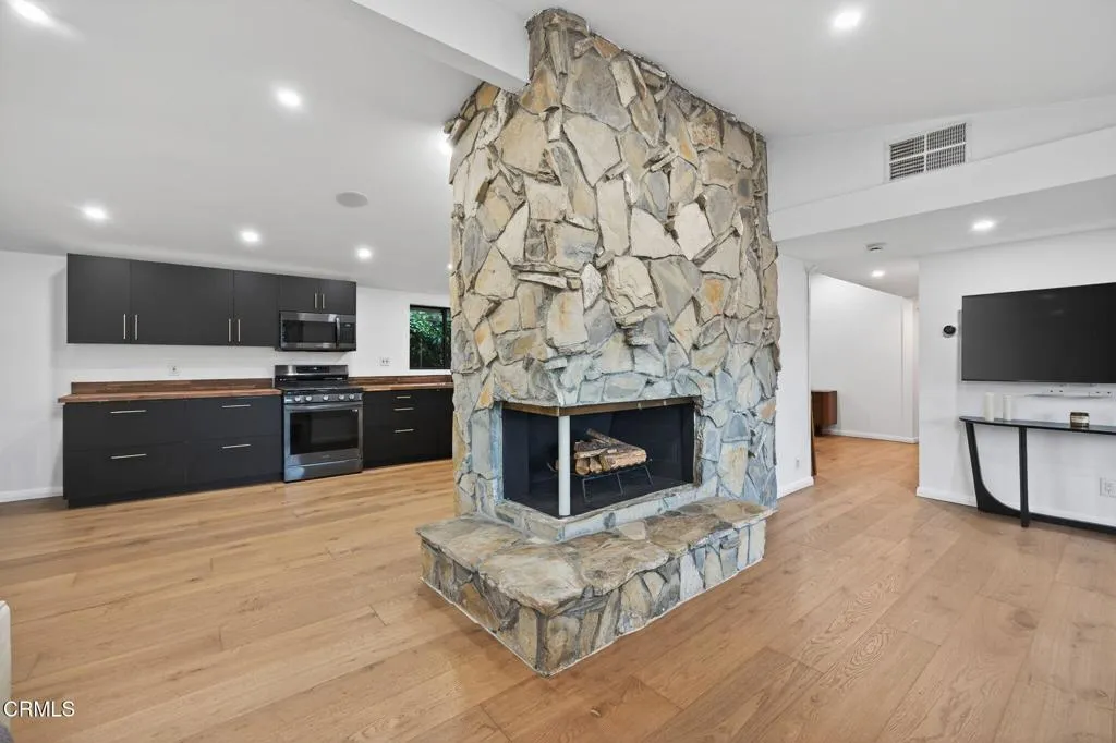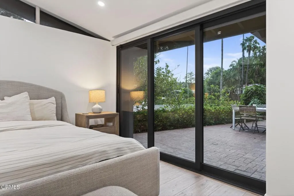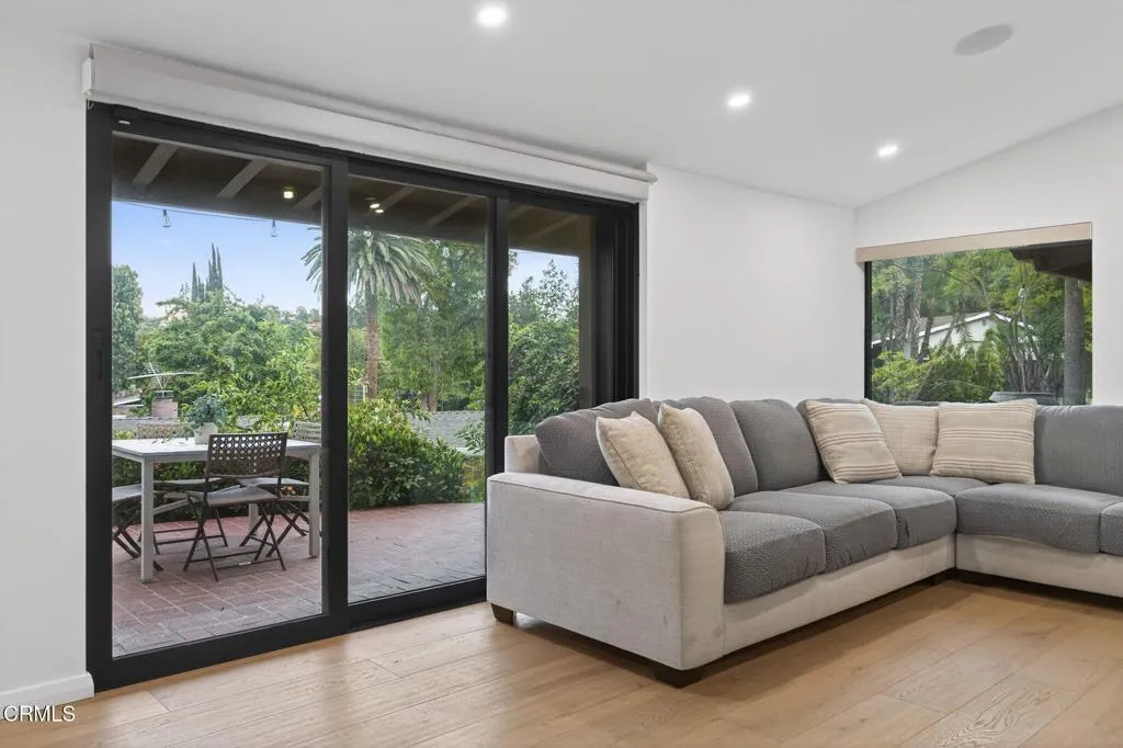 Welcome to 22261 Ybarra Road - an exceptional, single-level modern retreat set in one of Woodland Hills' most sought-after neighborhoods! The home has been thoughtfully redesigned with a sleek, contemporary aesthetic, and the floorplan offers the perfect blend of indoor/outdoor living! As you enter, you're greeted by an open-concept layout filled with natural light, highlighted by expansive windows, clean architectural lines, and vaulted ceilings. The kitchen was previously remodeled and features modern black cabinetry w/satin gold hardware, butcher block style counters, and matching black stainless steel appliances. The kitchen flows in the adjacent dining area, which has a custom built wet bar with wine fridge. The primary bedroom offers a walk-in closet and en suite bathroom complete with custom tiled shower, chic modern vanity, and large marble tiled floor. Both of the guest bedrooms are generously sized and have double doors leading to the backyard. The guest bathroom was also previously remodeled and has a gorgeous modern style vanity, quartz counters, satin gold fixtures, and soaking tub w/tile surround. Other highlights of the home include central heat & AC, flagstone fireplace, built-in surround sound, durable white oak floors, and custom 'accordion' style pocket doors in both the living room & primary bedroom. The home's exterior is the perfect combination of lush landscaping, beautiful views of the surrounding area, and a low maintenance backyard complete with artificial turf & above ground spa. The home's ideal 'south the boulevard' location is just minutes to Topanga Canyon Mall, Warner Center, fine dining restaurants, and top-rated schools. Come take a look before it's gone!