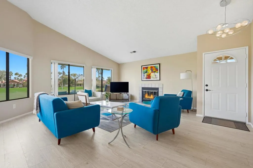 Available for off season rental only from 4/8/26 through 10/31/2026. One of Oasis Country Club's most desirable locations. Open great room layout with sweeping views of the golf course, tranquil lake, and surrounding mountains. Set up as a 2/2 plus den. The residence is filled with natural light and showcases a clean, contemporary aesthetic complemented by high vaulted ceilings and laminate flooring throughout. The kitchen features tasteful updates and flows seamlessly into the main living space, ideal for both everyday living and entertaining. A generous rear patio provides ample room for outdoor dining and relaxation while taking in the remarkable scenery. The home is conveniently situated adjacent to one of the community's pools and spas. The primary suite includes its own private patio, creating a quiet retreat.Oasis Country Club offers an impressive array of amenities with reasonable membership costs, including a clubhouse, an 18-hole executive golf course, tennis and pickleball courts, a fitness center. Shopping, dining, and retail are close by, with Acrisure Arena just 15 minutes away, offering AHL hockey, concerts, and major events.