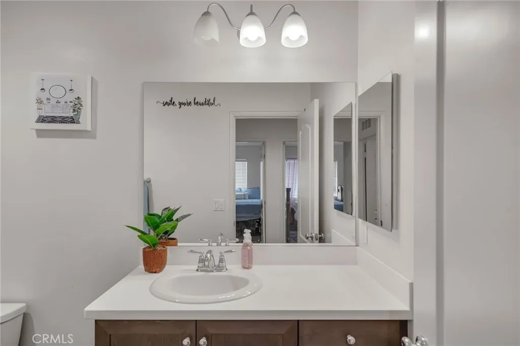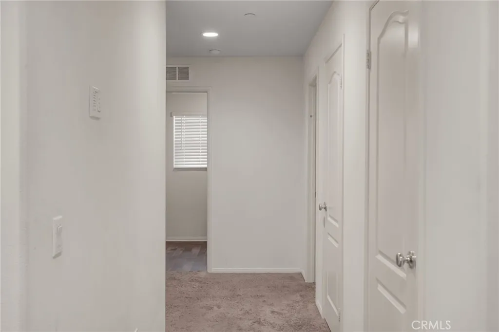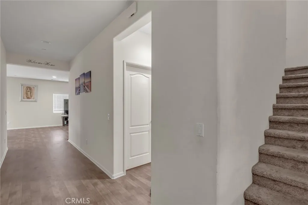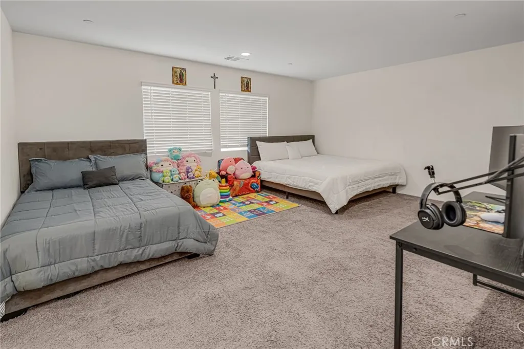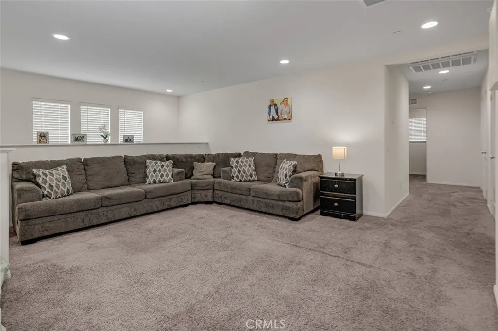 This two-story residence is situated on a generously sized lot and offers a functional layout with ample indoor and outdoor space. The front of the home features a spacious driveway leading to a two-car garage, along with a welcoming covered entry. Inside, the main level is designed with an open-concept layout, where the living room connects seamlessly to the dining area and kitchen. Recessed lighting enhances the space, and sliding doors provide direct access to the backyard, allowing for natural light and indoor-outdoor flow. A full bathroom on the first floor adds convenience. Upstairs, an additional living area provides flexible space that can be used as a family room, or play area,. The primary bedroom offers a comfortable retreat with its own ensuite bathroom and closet space. Two additional bedrooms and a full bathroom complete the upper level, along with a dedicated laundry room. The backyard offers a wide, usable layout with a combination of patio space, partial covering for shade, and open yard area with room for customization. The space extends along both sides of the home, creating a wraparound outdoor setting. With its spacious layout, multiple living areas, and versatile outdoor space, this home presents a practical opportunity for comfortable everyday living.