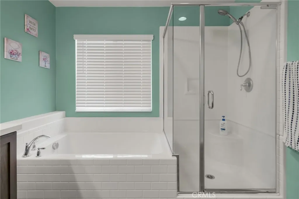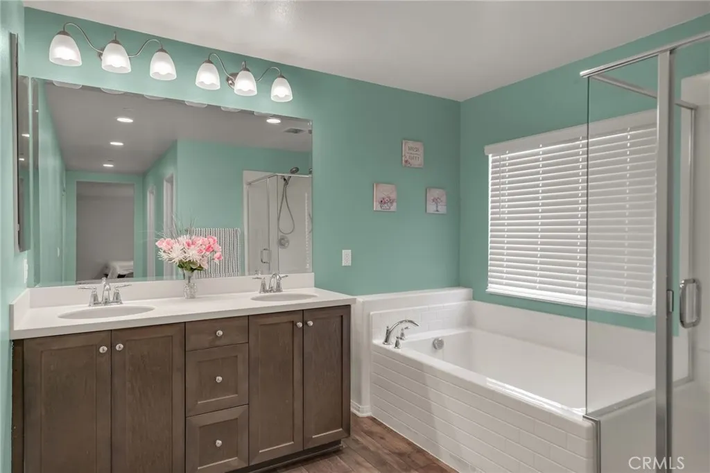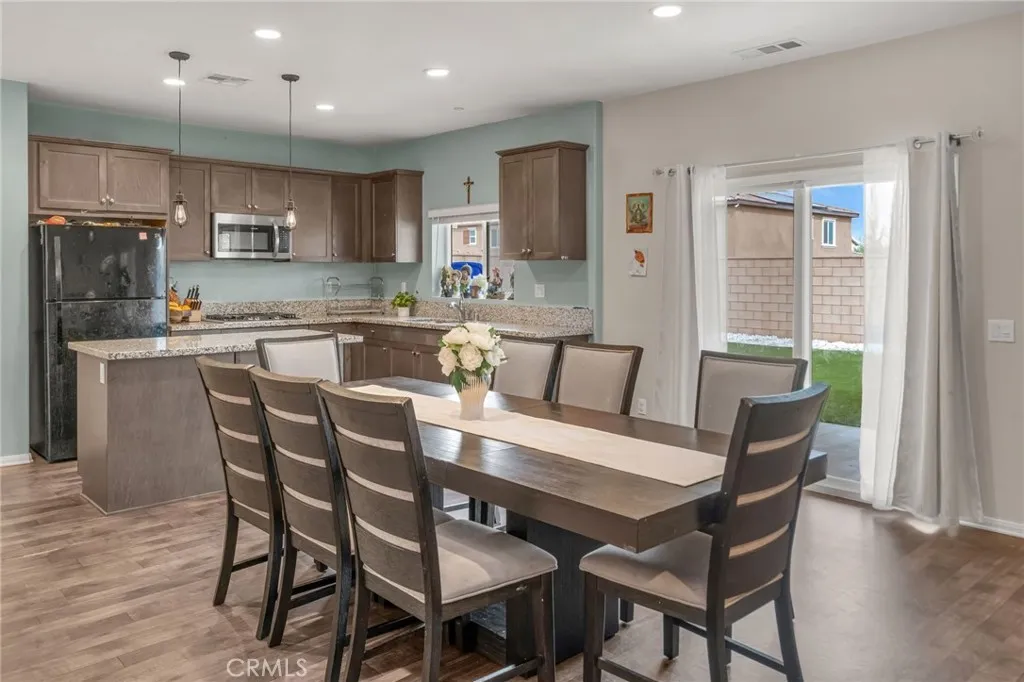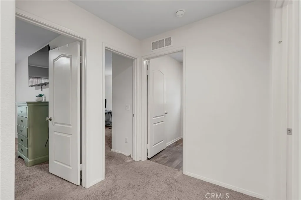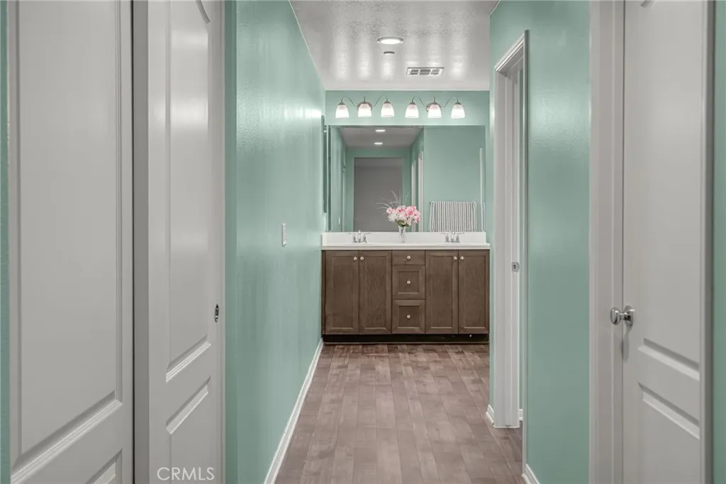 This two-story residence is situated on a generously sized lot and offers a functional layout with ample indoor and outdoor space. The front of the home features a spacious driveway leading to a two-car garage, along with a welcoming covered entry. Inside, the main level is designed with an open-concept layout, where the living room connects seamlessly to the dining area and kitchen. Recessed lighting enhances the space, and sliding doors provide direct access to the backyard, allowing for natural light and indoor-outdoor flow. A full bathroom on the first floor adds convenience. Upstairs, an additional living area provides flexible space that can be used as a family room, or play area,. The primary bedroom offers a comfortable retreat with its own ensuite bathroom and closet space. Two additional bedrooms and a full bathroom complete the upper level, along with a dedicated laundry room. The backyard offers a wide, usable layout with a combination of patio space, partial covering for shade, and open yard area with room for customization. The space extends along both sides of the home, creating a wraparound outdoor setting. With its spacious layout, multiple living areas, and versatile outdoor space, this home presents a practical opportunity for comfortable everyday living.