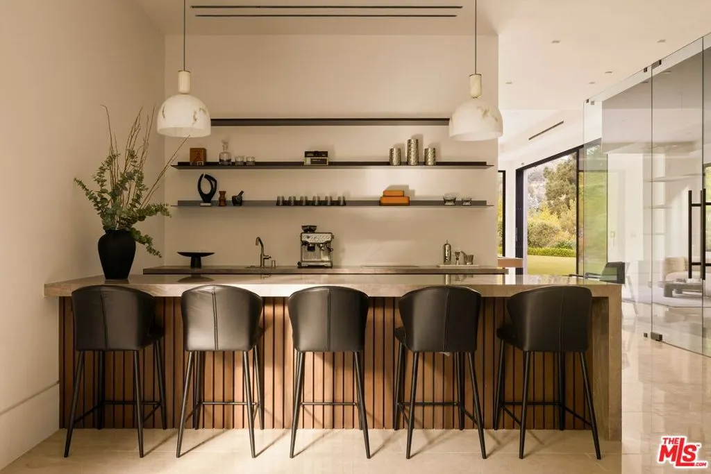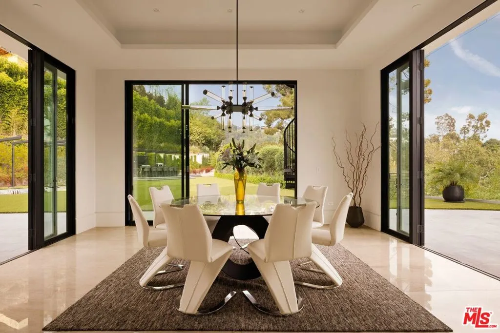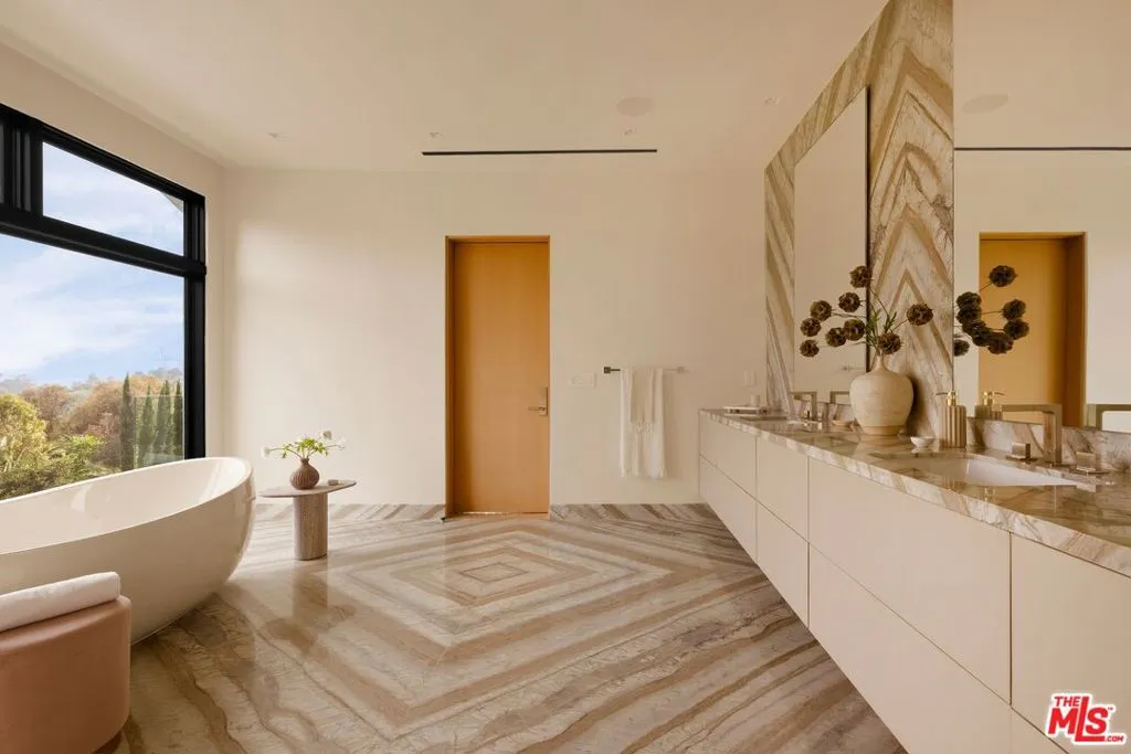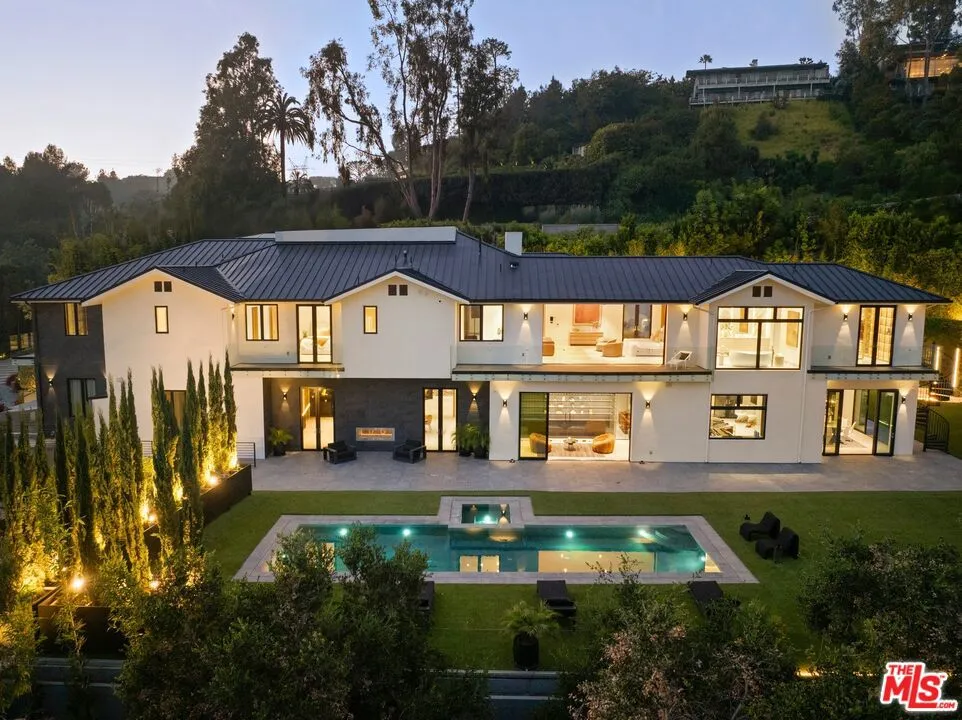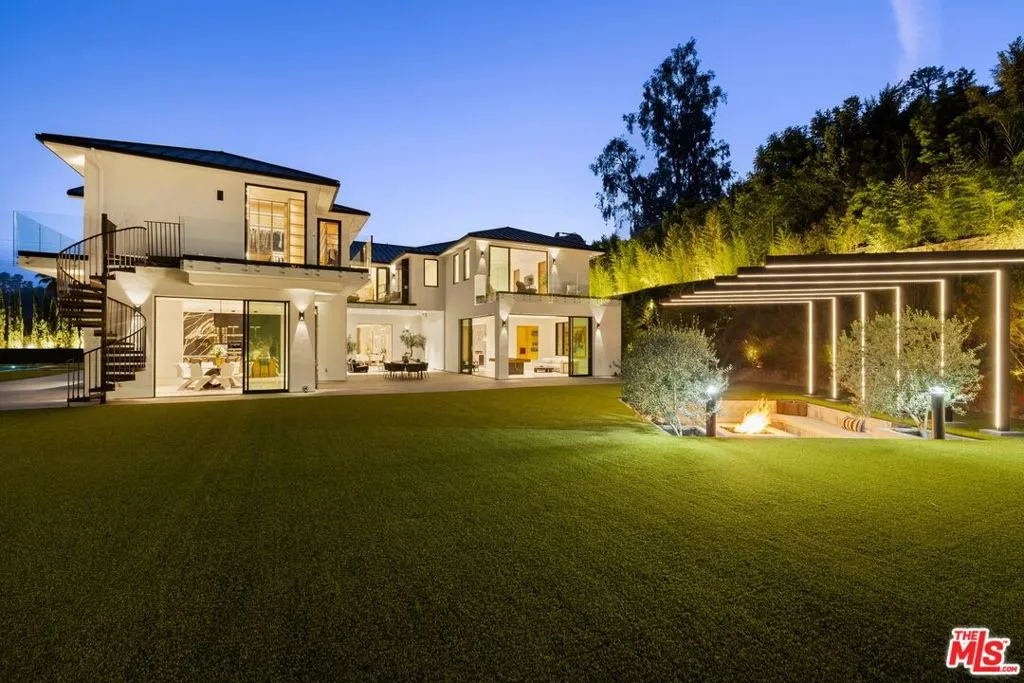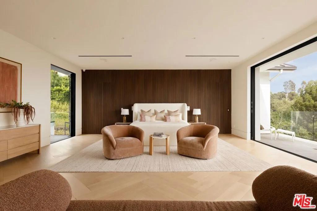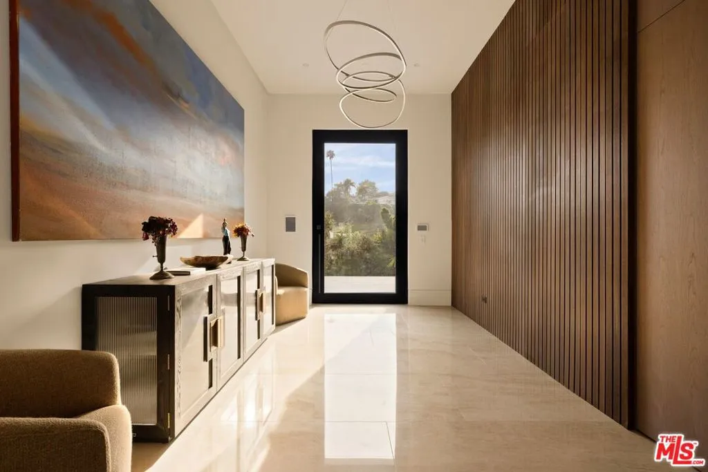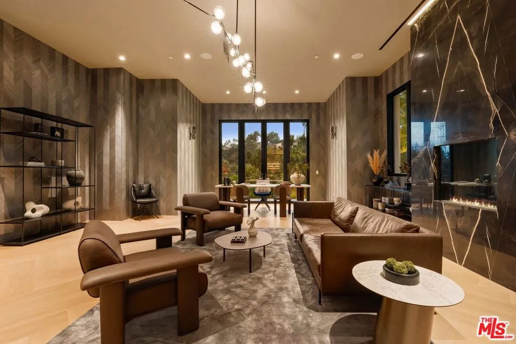 Commanding a private 2.5-acre setting within Crestwood Hills, this newly constructed estate is defined by its scale, architectural clarity, and uncompromising sense of privacy. Concealed behind gates and its own guard house, the property offers a level of seclusion rarely found in Brentwood. A striking double-height arrival sets the tone, where floating staircases, gallery-like volumes, and meticulously selected stone and wood finishes create a refined, modern palette. Light moves effortlessly through the interiors, illuminating expansive living spaces anchored by sculptural fireplaces and walls of glass that dissolve the boundary between indoors and out. The residence is designed with the intention of balancing grand entertaining with quiet retreat. Formal and informal living areas unfold seamlessly, complemented by a private office, a cinema-quality media room, and dining spaces that feel both intimate and architectural. At its center, a statement kitchen pairs bold materiality with precision, featuring Miele appliances and a substantial island designed for both function and presence. Nine en-suite bedrooms are thoughtfully distributed, culminating in a primary suite of significant scale, offering dual baths, expansive dressing rooms, and a private lounge environment. The grounds are equally considered with layered landscaping, open lawns, and curated outdoor spaces that frame a pool and sport court, creating a resort-like setting without sacrificing discretion. A separate 2-bedroom guest house oasis sits at the bottom of the property. A multiple-car garage and parking for 15+ vehicles completes the estate, accommodating a collection with ease. A property of rare composition where architecture, privacy, and scale converge in one of Brentwood's most coveted hillside enclaves.