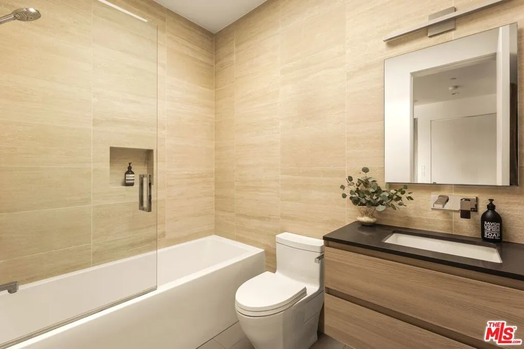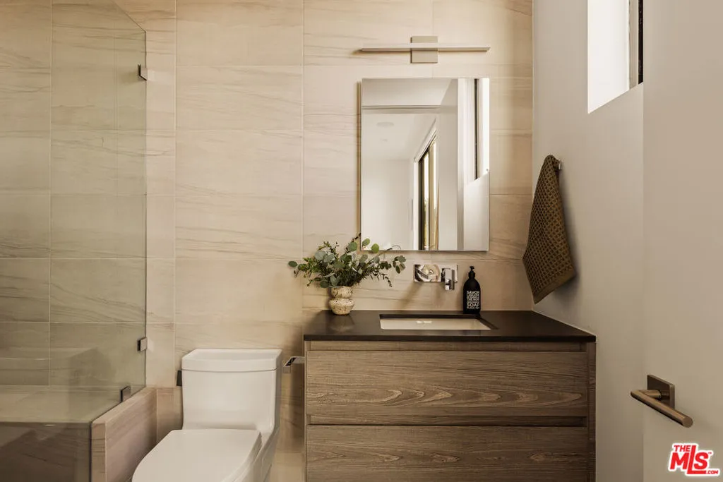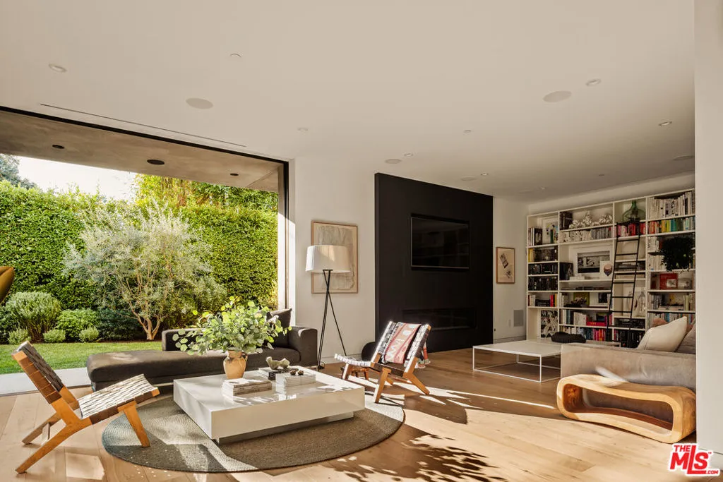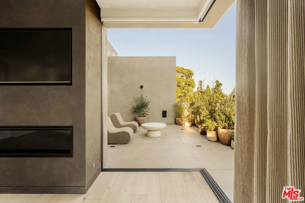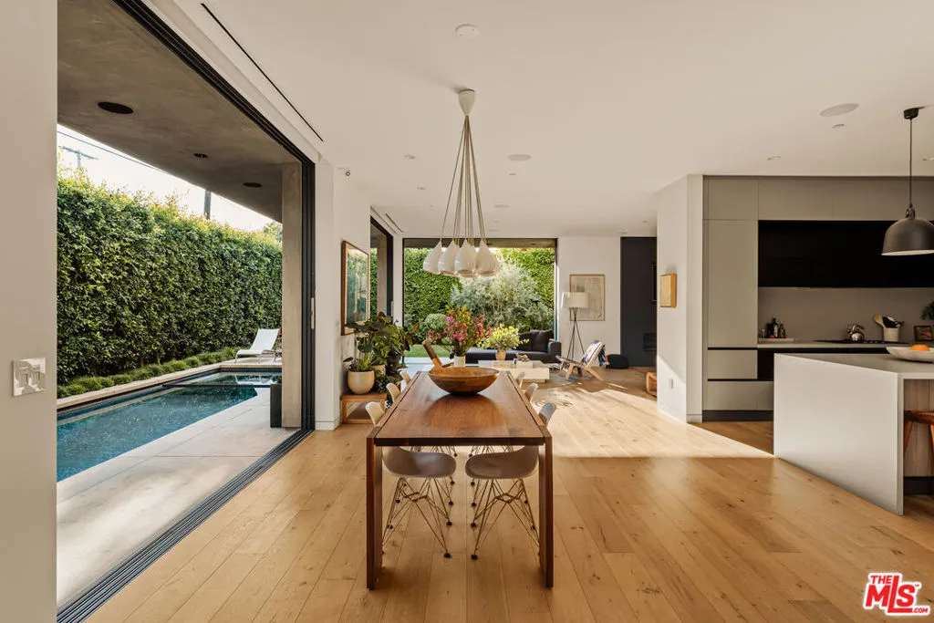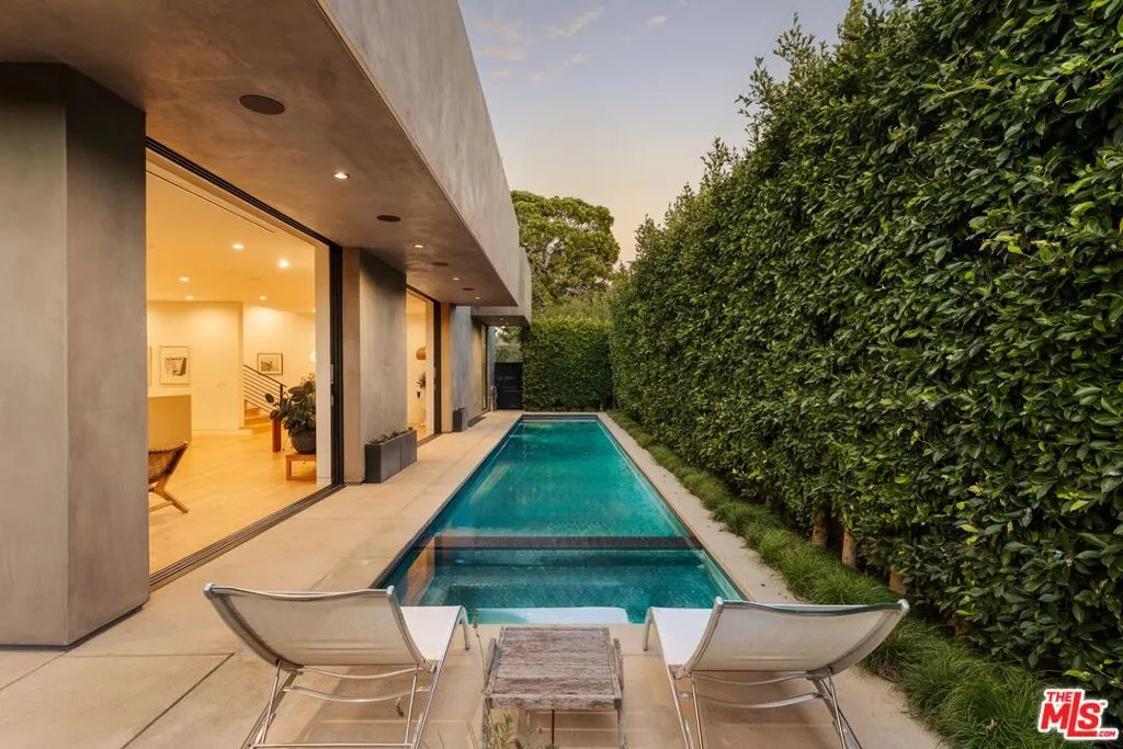 A refined expression of contemporary California architecture, this striking Venice residence has been thoughtfully enhanced and remodeled since its 2018 construction, elevating both its design integrity and livability. The sculptural facade opens to interiors defined by volume, light, and seamless spatial flow. Floor-to-ceiling Fleetwood pocket doors dissolve the boundary between indoors and out, allowing natural light to animate the home throughout the day. The open living and dining spaces unfold around a chef's kitchen appointed with premium Miele appliances, custom Italian cabinetry, and carefully curated materials that balance warmth with modern precision. The living space is punctuated by a wall of custom Porro bookshelves, with a rolling library ladder, offering a streamlined aesthetic and bespoke functionality for book enthusiasts and art collectors alike. Upstairs, three bedroom suites offer privacy and comfort, including a dramatic primary retreat that opens to a private terrace. The Roman clay finished fireplace, generous walk-in closet, and spa-inspired bath complete the suite, creating a true sanctuary within the home. Outdoor living is equally compelling. The backyard features a striking 54-foot saltwater lap pool and spa framed by lounge areas designed for both quiet afternoons and vibrant entertaining. An outdoor kitchen and dining pavilion extend the living experience into the landscape, creating an effortless rhythm between architecture and environment. Above it all, a rooftop deck captures sunset skies and ocean breezes, offering an elevated setting for evening gatherings. Gated and private with a two-car garage and additional off-street parking, the home is ideally located just moments from Abbot Kinney's renowned dining and boutiques, the beach, and neighborhood amenities including Penmar Park and golf course.