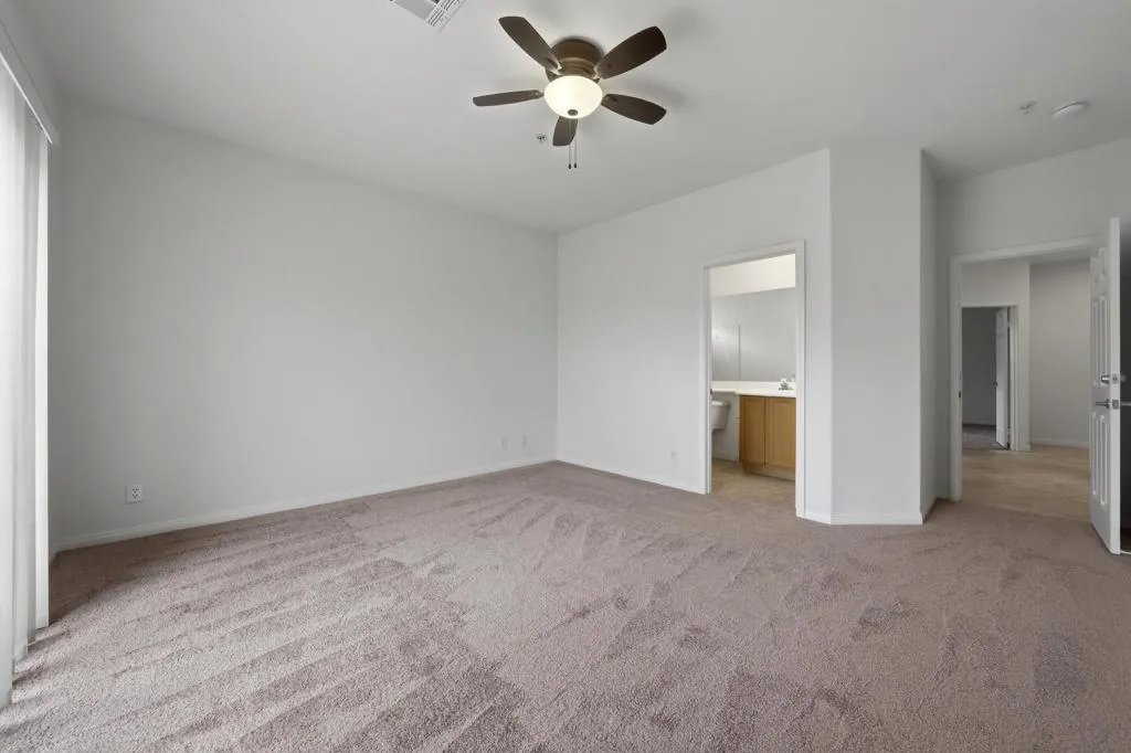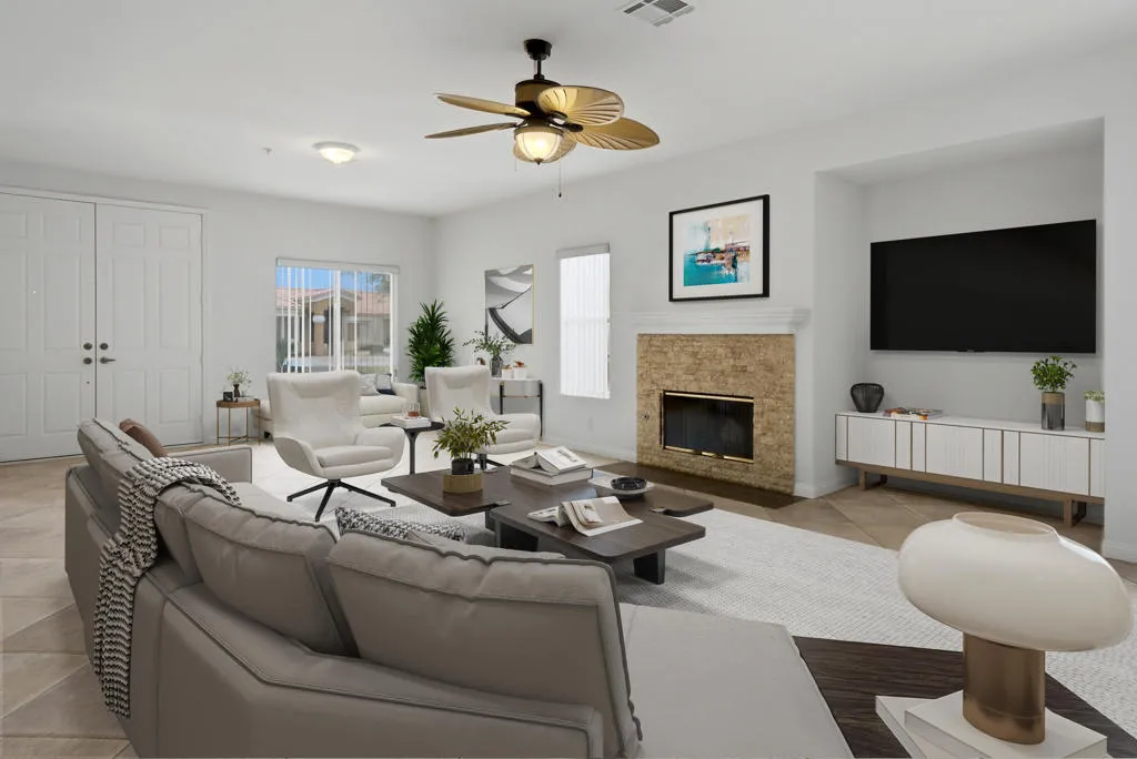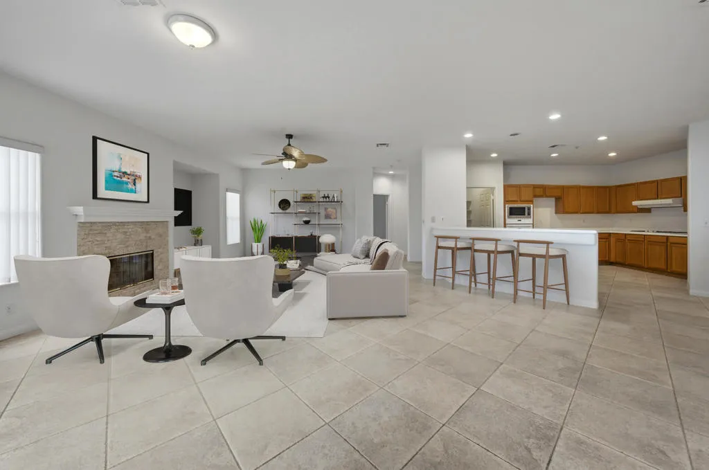 Welcome to this well-appointed 3-bedroom, 3-bathroom home, offering functionality and value. Freshly painted and featuring new carpeting in bedrooms, this property is move-in ready and designed for everyday living. The open great room features a fireplace, creating a warm and inviting focal point. Adjacent to the great room and kitchen is a flexible dining area that could easily be used as a sitting room. The kitchen is equipped with ample storage, a walk-in pantry, generous counter space, and a breakfast bar. It flows seamlessly into the living and dining areas, making it ideal for both daily routines and entertaining. The primary suite includes direct access to the backyard via a sliding door, a large walk-in closet, and an ensuite bathroom with dual sinks, a soaking tub, and a walk-in shower. The second bedroom also offers private access to the rear yard, a walk-in closet, and an attached full bathroom with dual sinks and a tub/shower combination. The third bedroom features mirrored closet doors and easy access to a full hall bathroom, also with dual sinks and a tub/shower combo. Additional features include a dedicated laundry room with utility sink, tile flooring throughout the main living areas, an oversized two-car garage, and dual-zone air conditioning. The private backyard is ready for your design ideas. This home offers an excellent opportunity for buyers seeking quality and value.