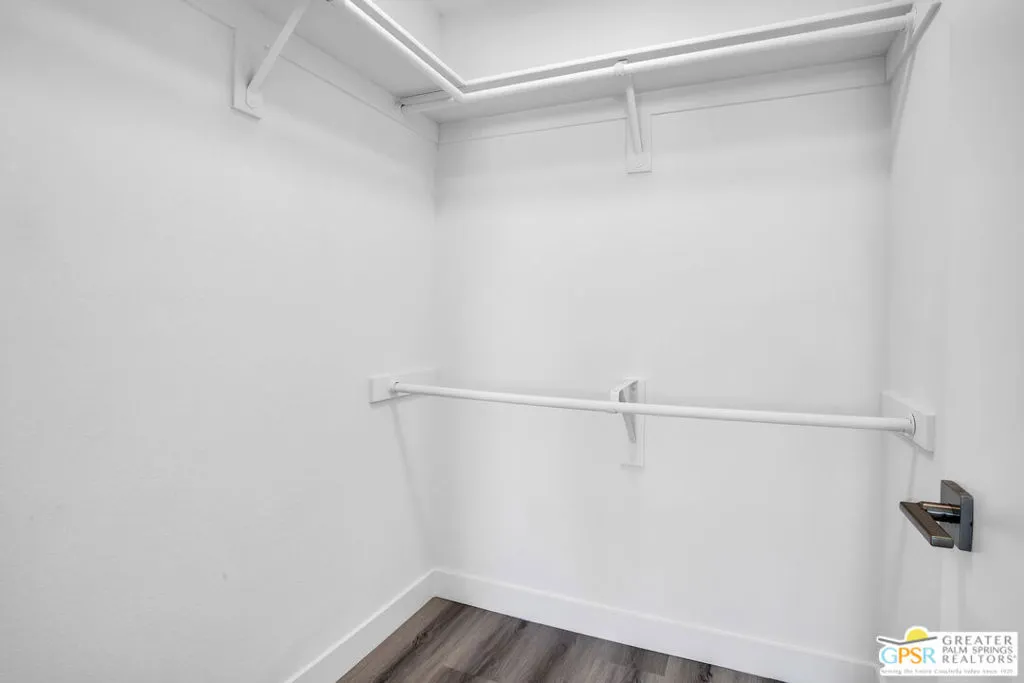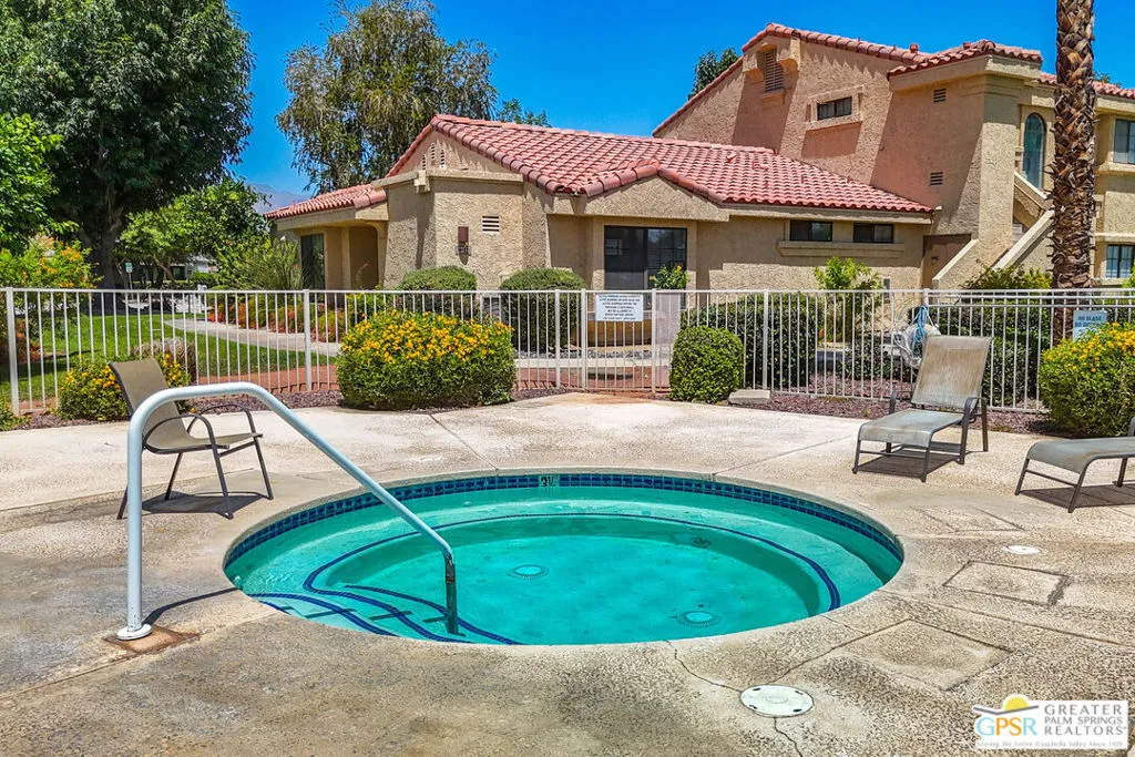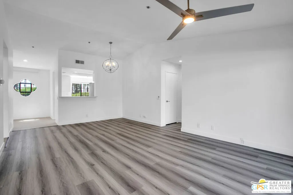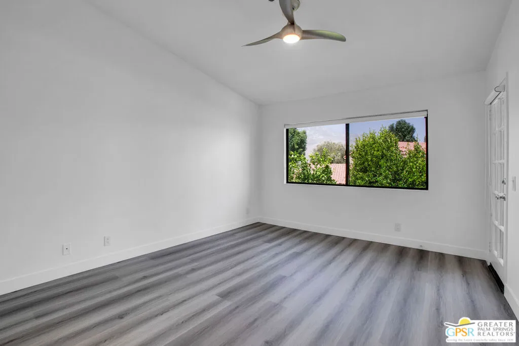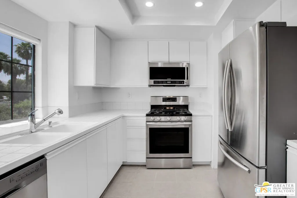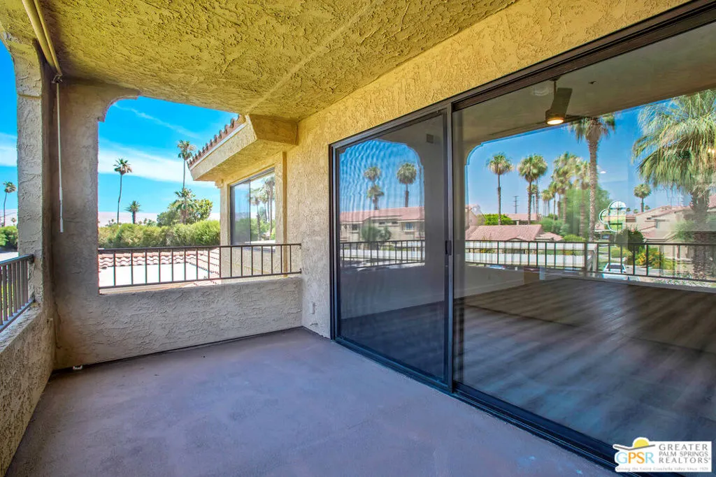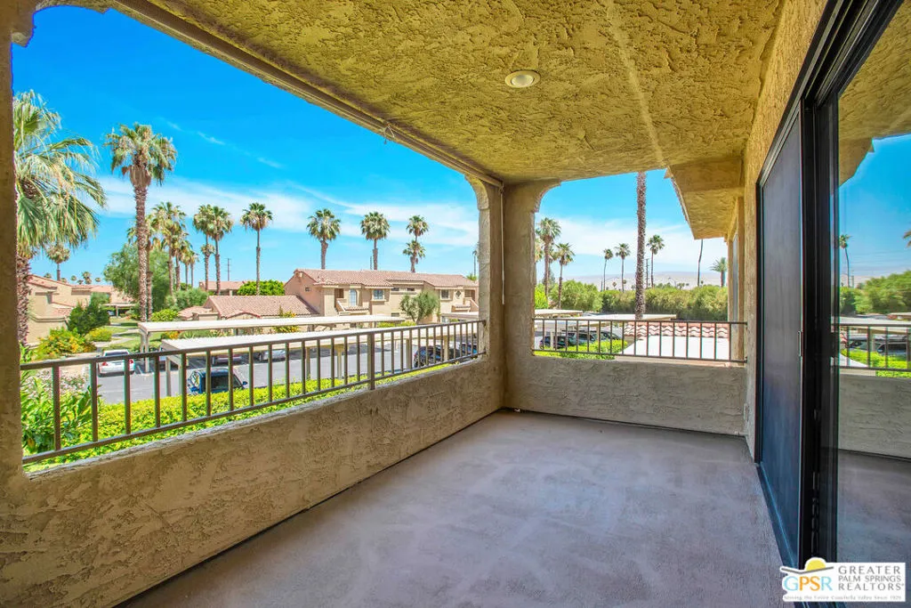At last! Welcome to this spacious and beautifully updated 2-bedroom, 2-bath upper-level condo offering 1,197 SqFt in the highly desirable Cathedral Canyon Country Club. Filled with natural light, this home features soaring ceilings, generously sized bedrooms, and wood-look vinyl flooring for a clean, modern feel. Each room is equipped with ceiling fans and custom window treatments, adding both comfort and style.The kitchen is thoughtfully designed with recessed lighting, abundant cabinetry, stainless steel appliances, and a gas stove perfect for everyday living and entertaining. Enjoy stunning mountain views from every room, plus a spacious private balcony accessible from both the living room and the primary bedroom an ideal spot to relax and take in the scenery. Additional highlights include in-unit laundry with full-size side-by-side washer and dryer and convenient assigned covered parking nearby.