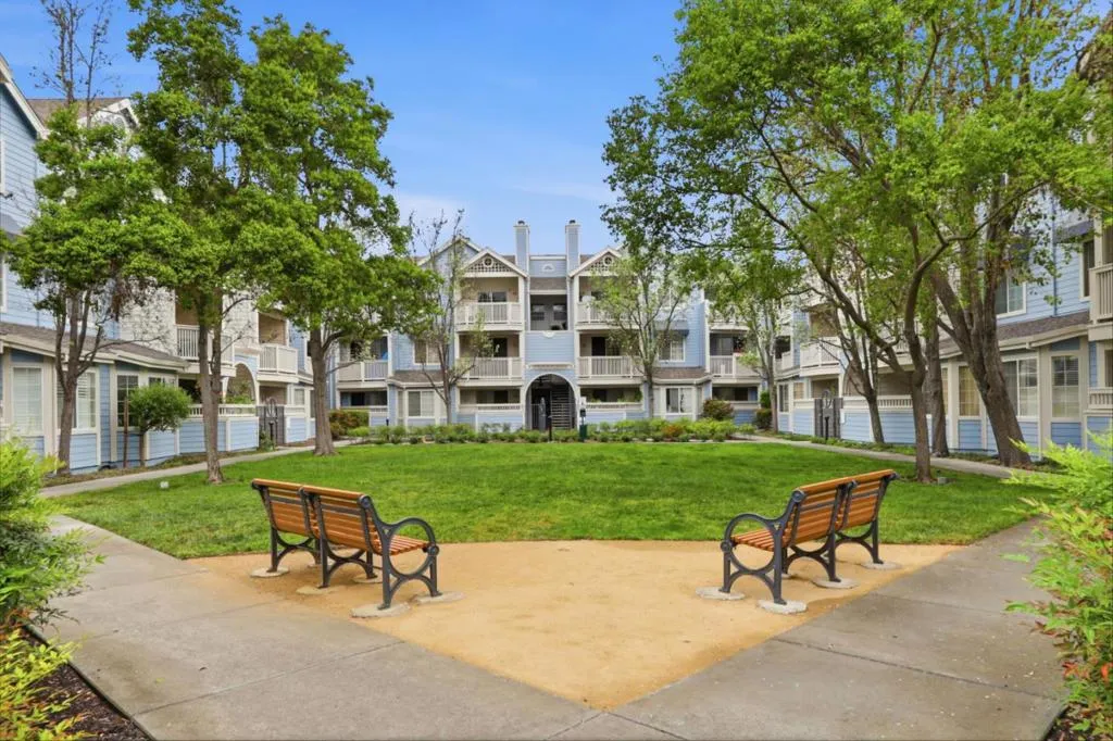 Bright top-floor corner unit in Arcadia Terrace, offering a quiet interior location and abundant natural light. This 3-bedroom, 2-bath condo features approximately 1,300 sq ft with soaring vaulted ceilings, a tiled fireplace, and updated wood-look vinyl plank flooring throughout. The primary suite includes a walk-in closet and refreshed bathroom. The kitchen offers stainless steel appliances, including a newer dishwasher, Corina countertops, and refinished cabinetry. Sliding doors open to a private patio with peaceful treetop views. Additional features include smart home enhancements, a private garage with automatic opener, and one assigned parking space. Community amenities include a pool, play area, gazebo, and HOA covers water and trash. Conveniently located near major tech employers, shopping, dining, and with easy access to Highways 101, 237, and Central Expressway.