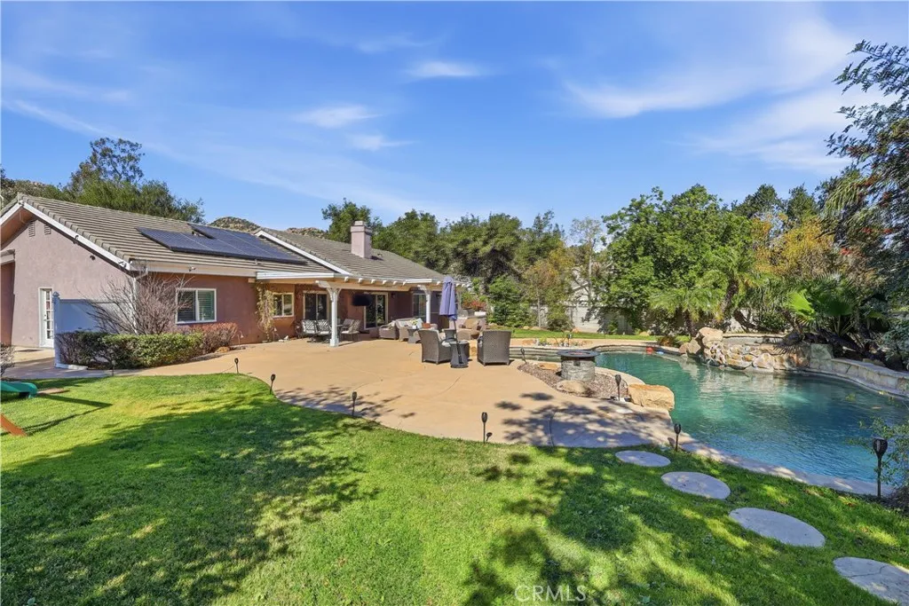 Situated on a quiet cul-de-sac in one of Chatsworth’s most desirable locations, this beautifully maintained 4-bedroom, 3-bath residence offers 2,404 square feet of comfortable living on an expansive 17,000-square-foot lot with breathtaking views of the Santa Susana Mountains. The inviting floor plan features a formal living room and formal dining room, along with a spacious family room highlighted by a wood-plank ceiling and cozy fireplace. The updated kitchen is ideal for both everyday living and entertaining, showcasing granite countertops, stainless steel appliances, a center island, and seamless flow into the family room. The primary suite is a private retreat with a walk-in closet and an en-suite bathroom. Three additional bedrooms and two full baths provide ample space for family, guests, or a home office. Step outside to a true resort-style backyard, designed for entertaining and relaxation. Enjoy a beach-entry pool and spa with waterfall, outdoor kitchen, covered patio, and generous grassy areas, all set against stunning mountain views. Additional highlights include copper plumbing, tankless water heater, recessed lighting, hardwood floors, plantation shutters, electric vehicle charger, Leased Solar Panels, three-car garage, and RV access. Conveniently located with easy access to 118 freeway, scenic hiking and walking trails, parks, dining, and shopping, this exceptional home offers the perfect blend of privacy, comfort, and lifestyle in one of Chatsworth’s premier neighborhoods.